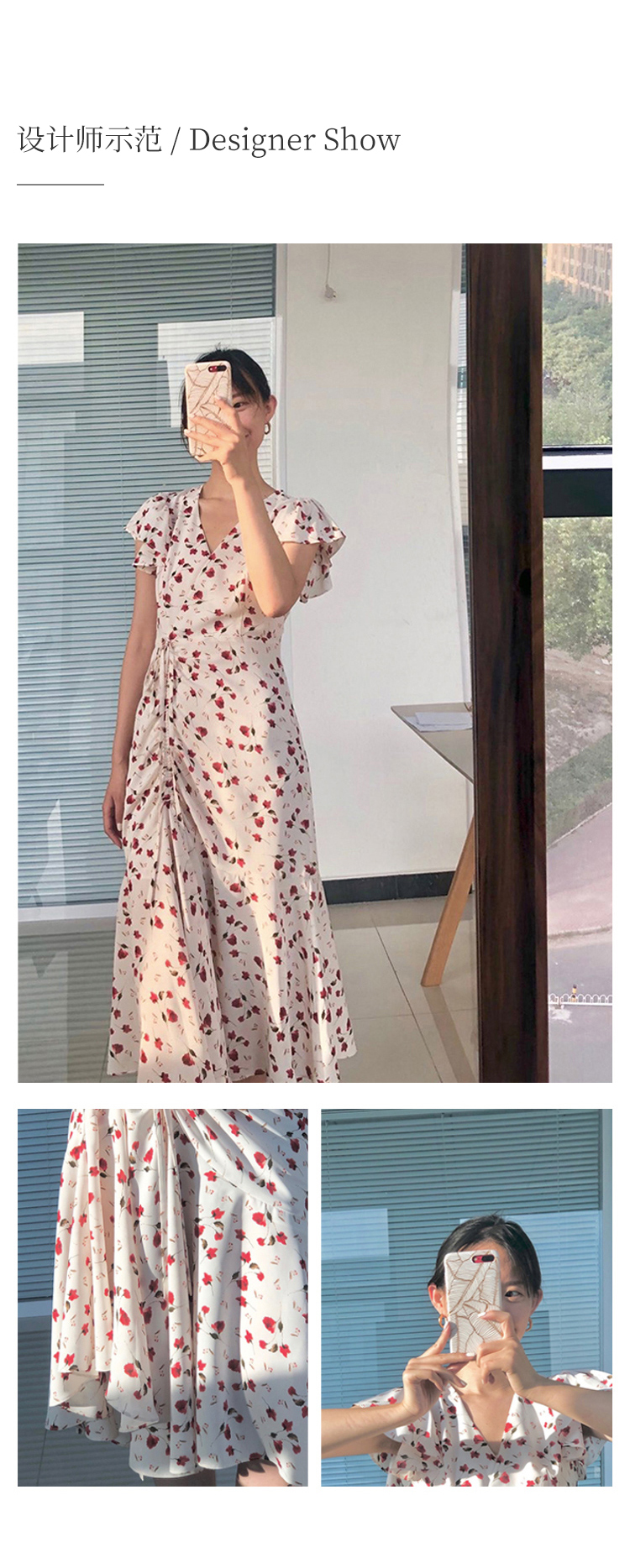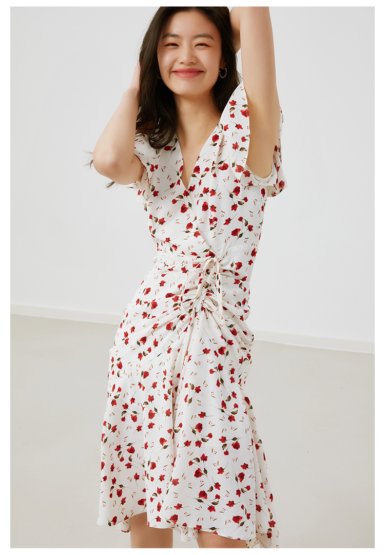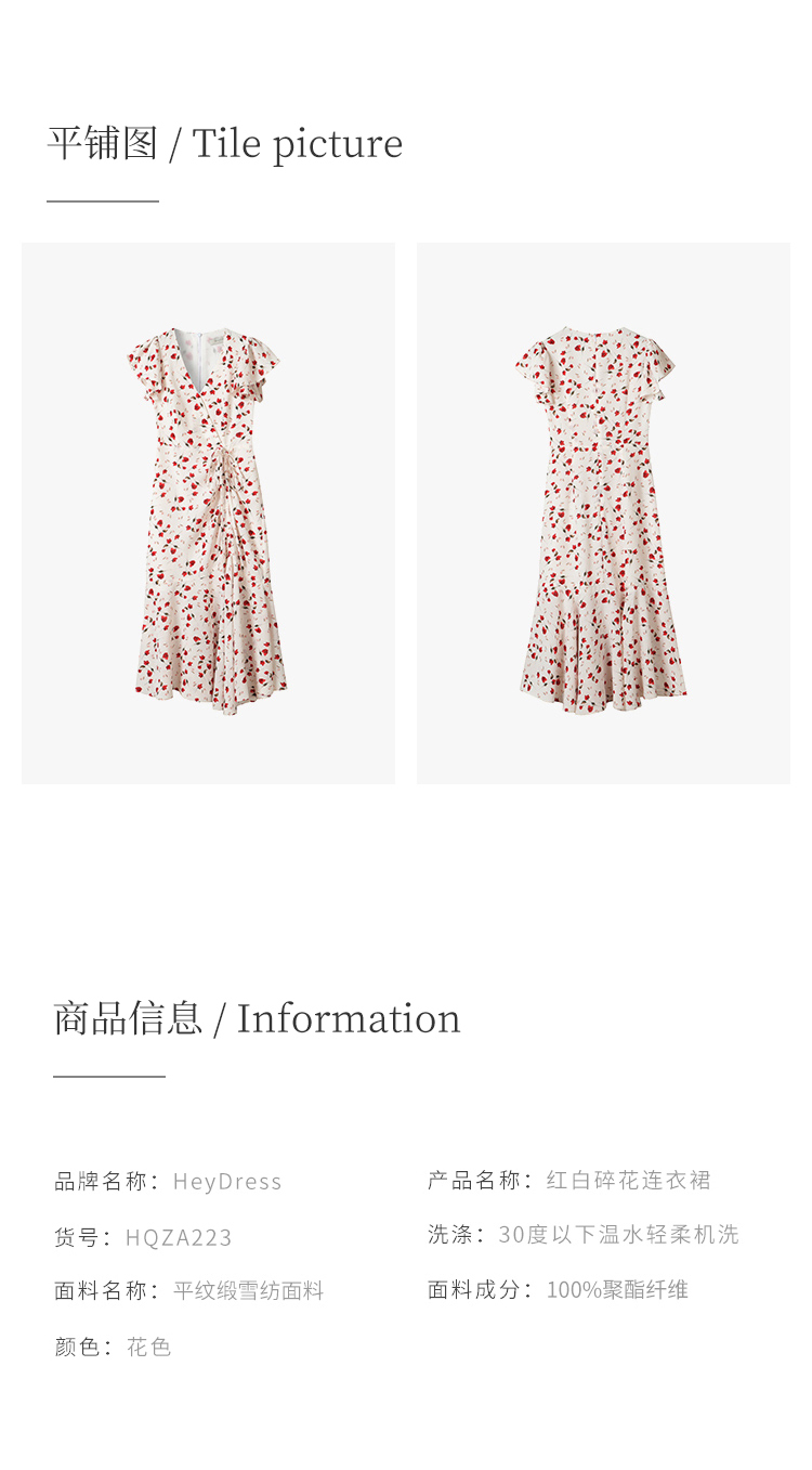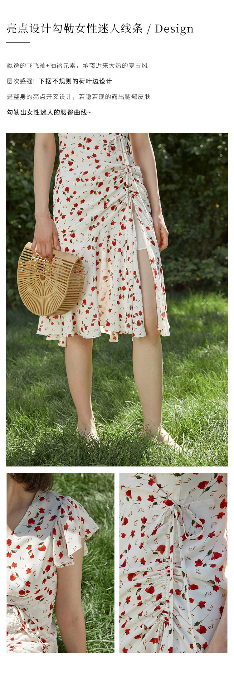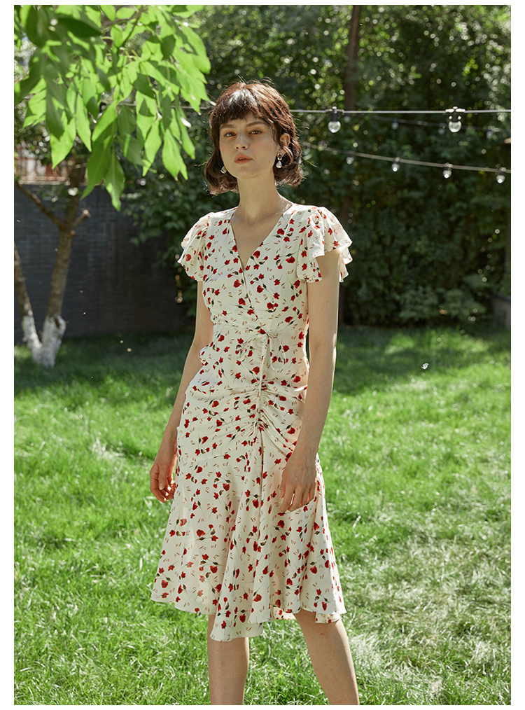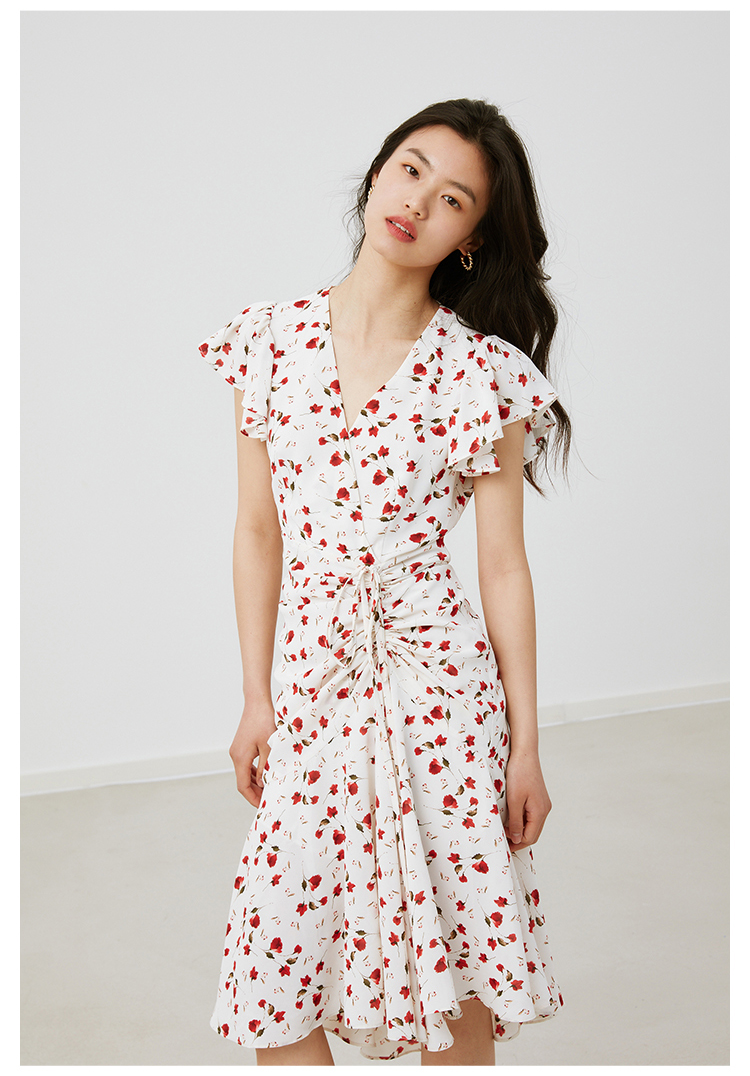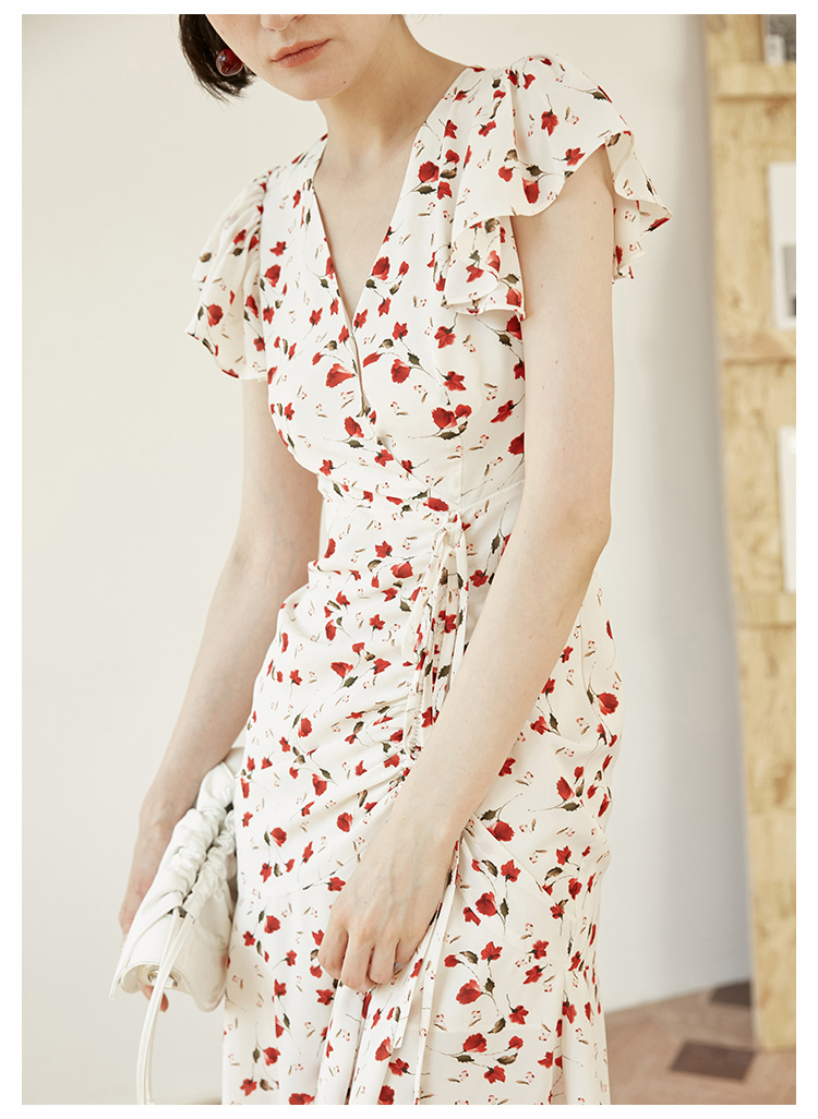 HeyDress法式碎花连衣裙女夏季V领抽褶茶歇裙复古玫瑰花气质收腰雪纺裙子