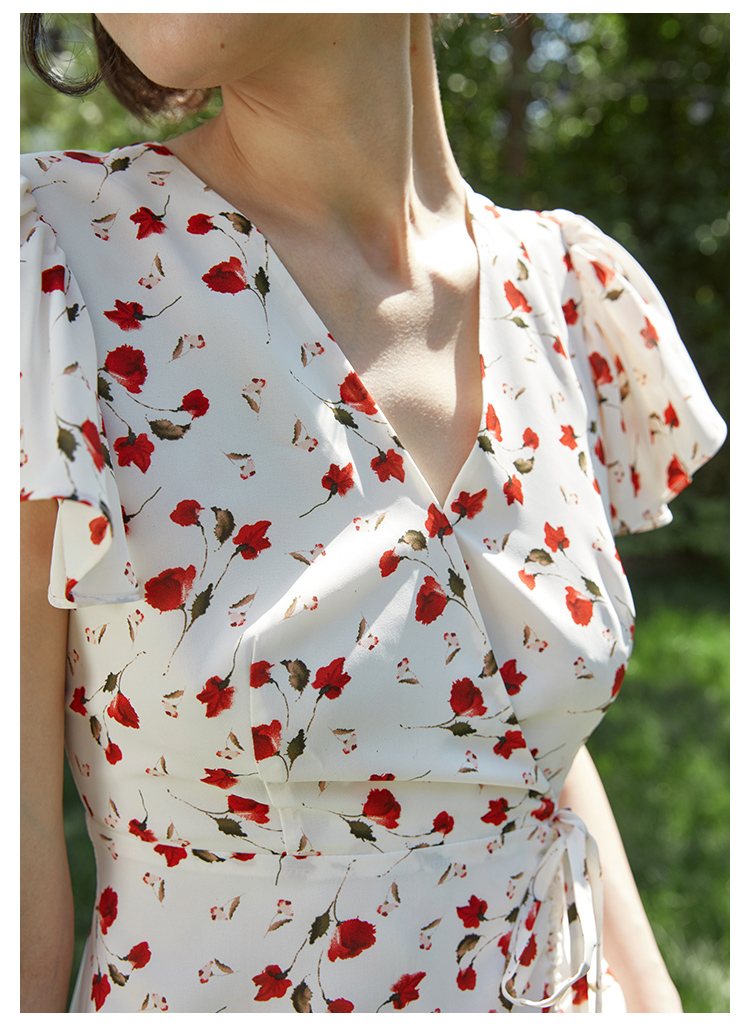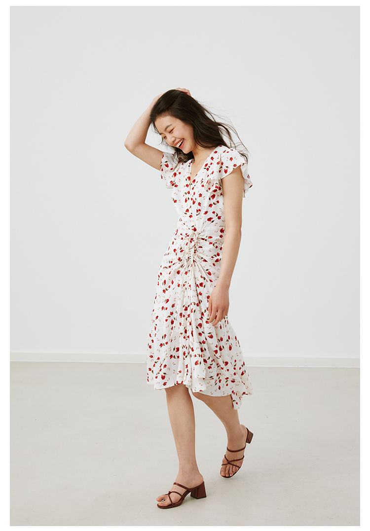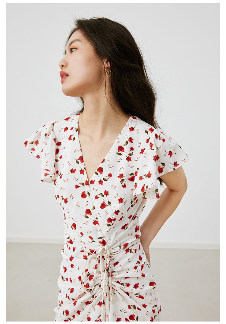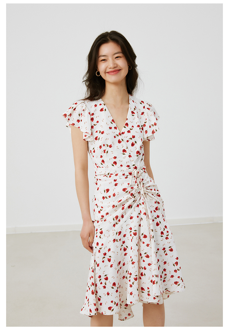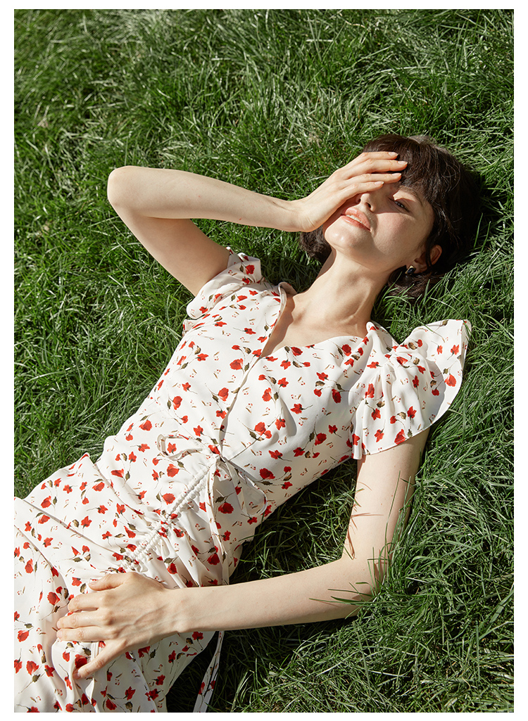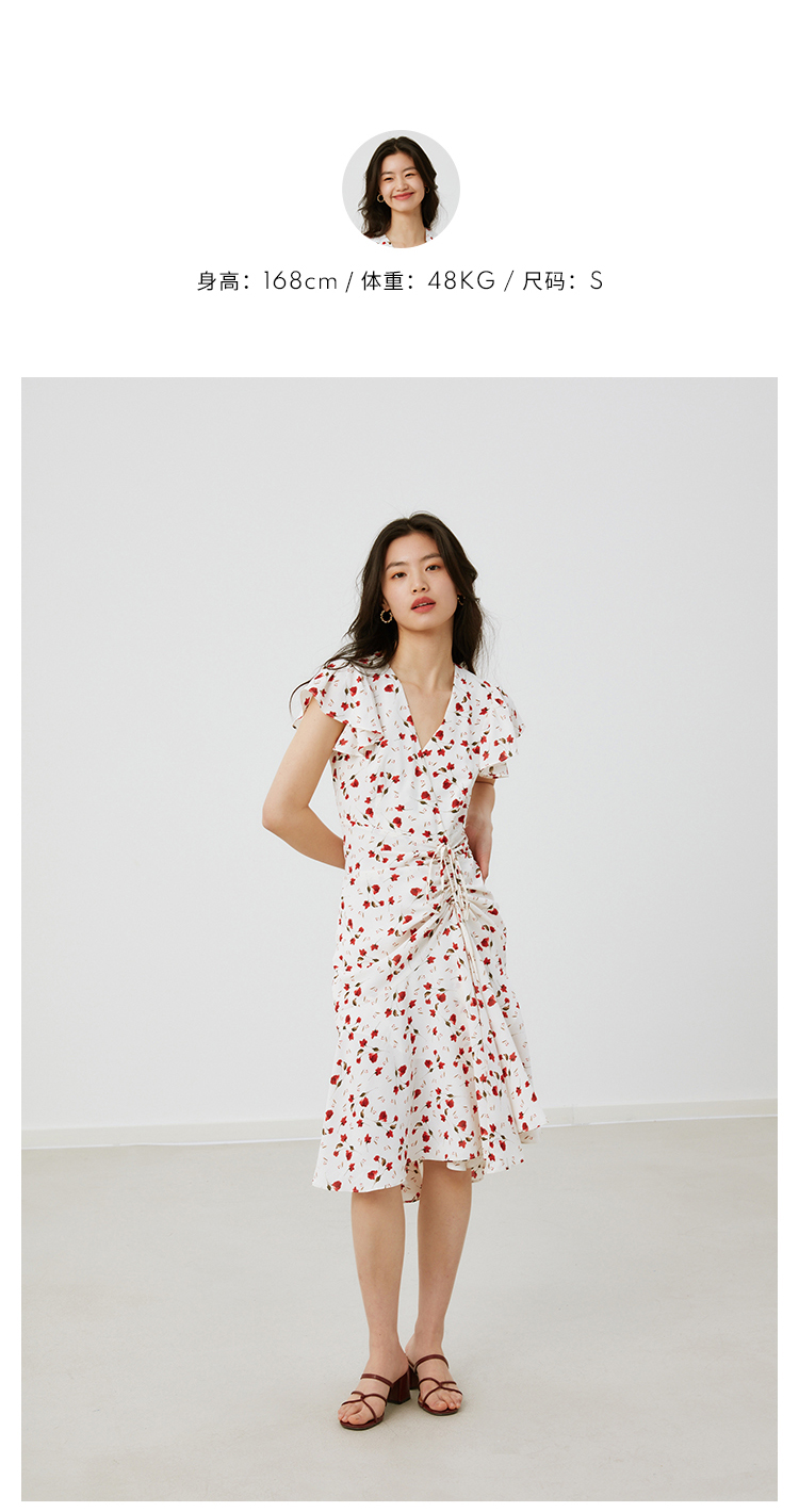 HeyDress法式碎花连衣裙女夏季V领抽褶茶歇裙复古玫瑰花气质收腰雪纺裙子