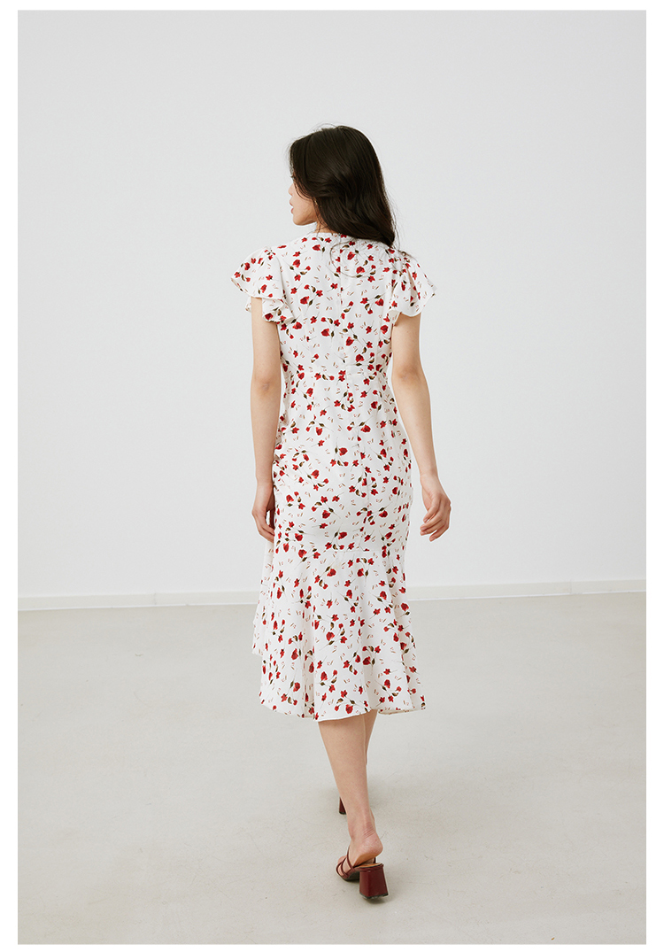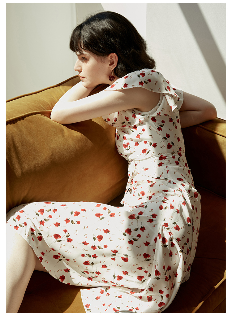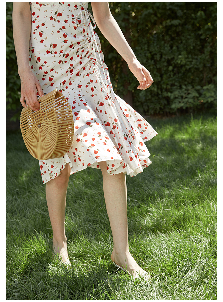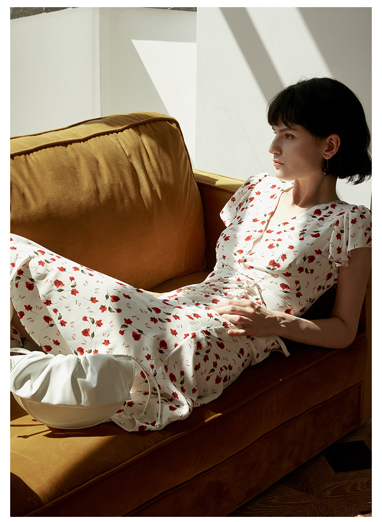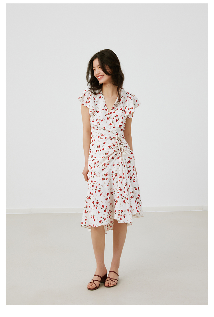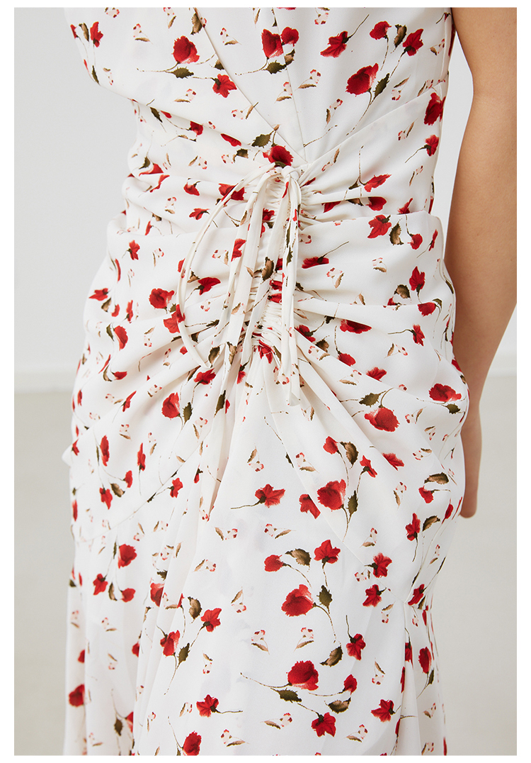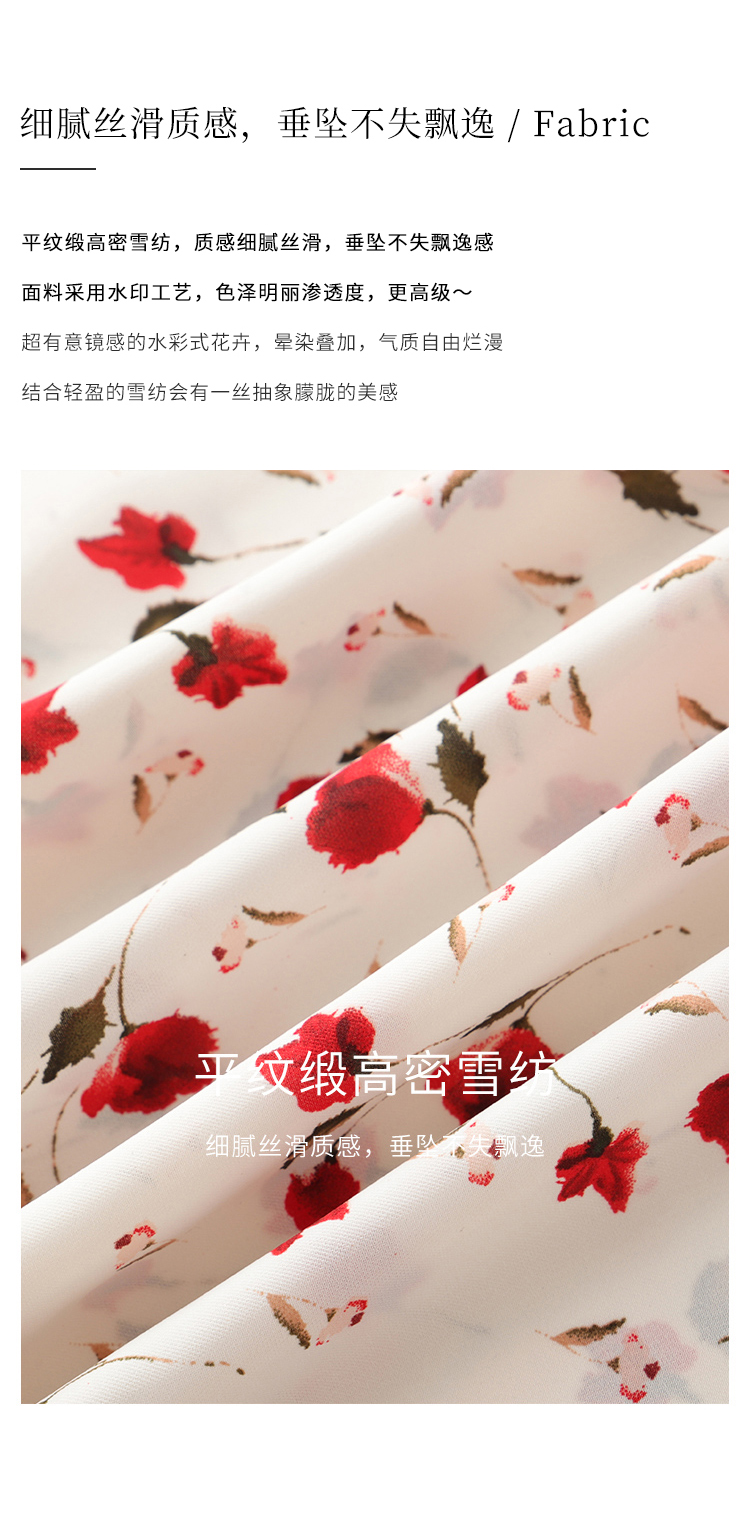 HeyDress法式碎花连衣裙女夏季V领抽褶茶歇裙复古玫瑰花气质收腰雪纺裙子