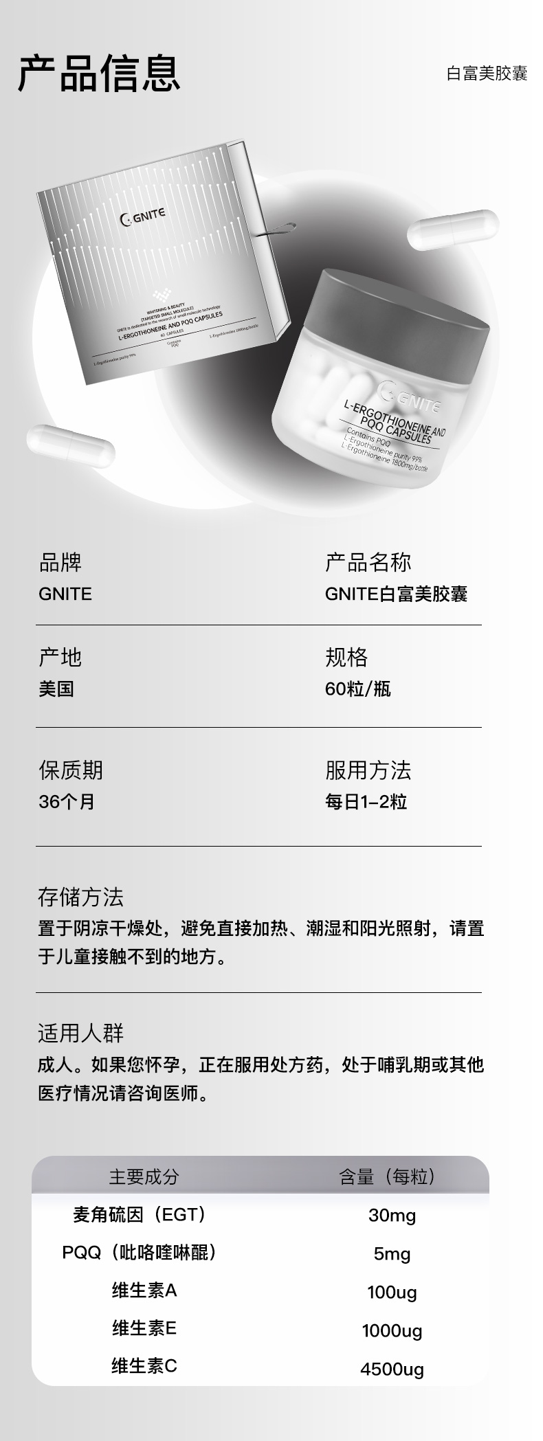 【臻汇】gnite麦角硫因美白丸