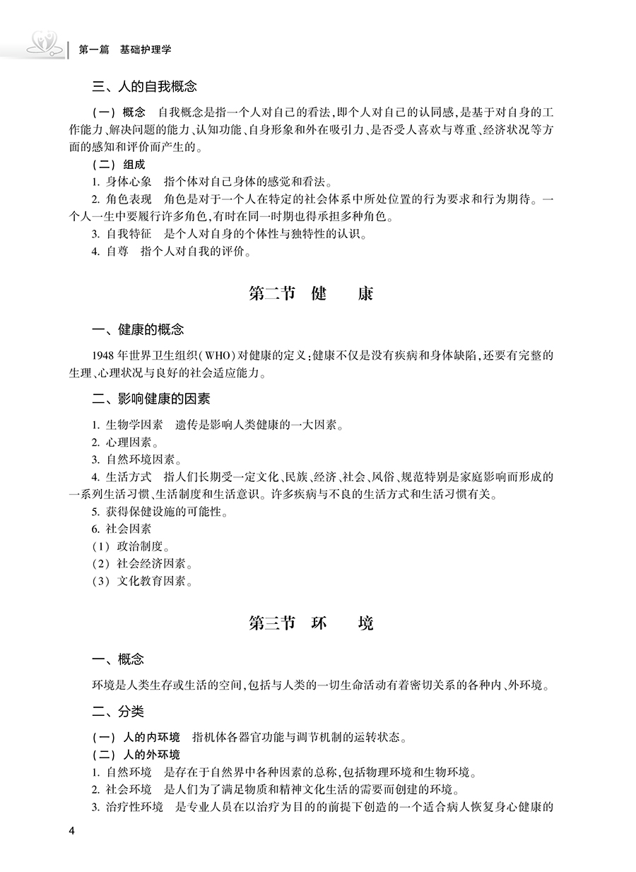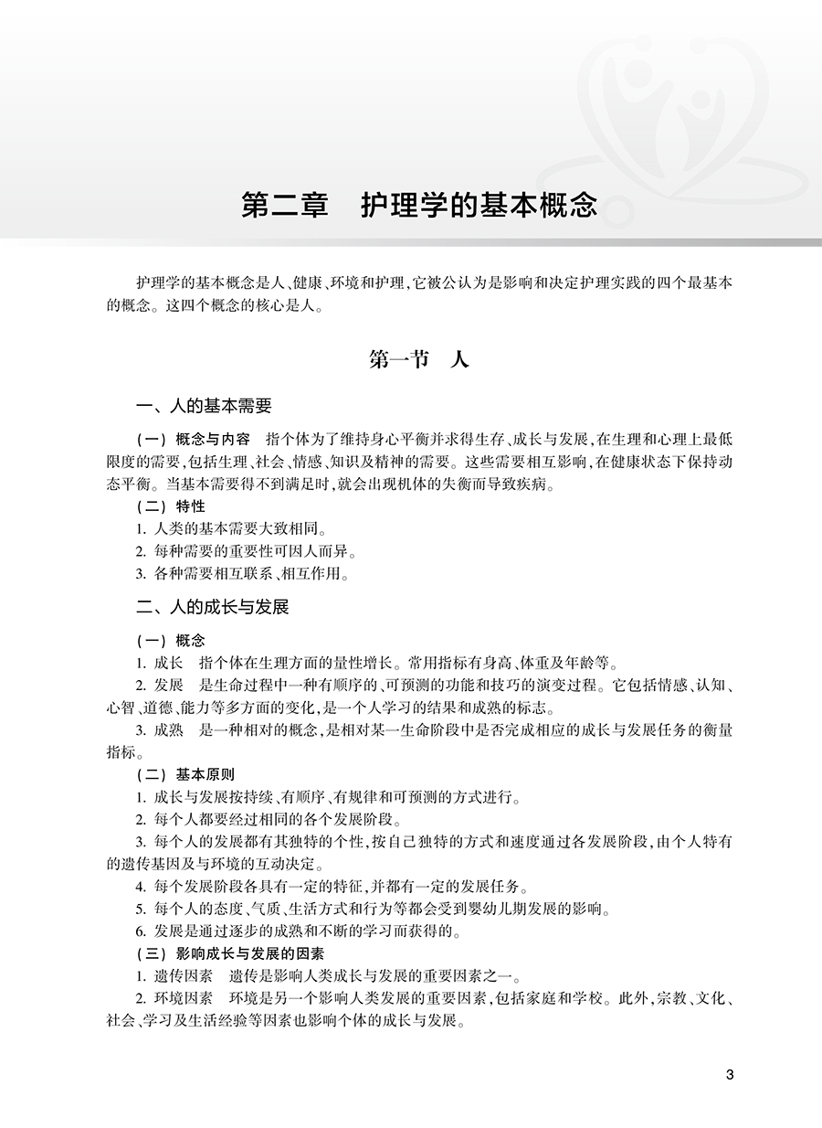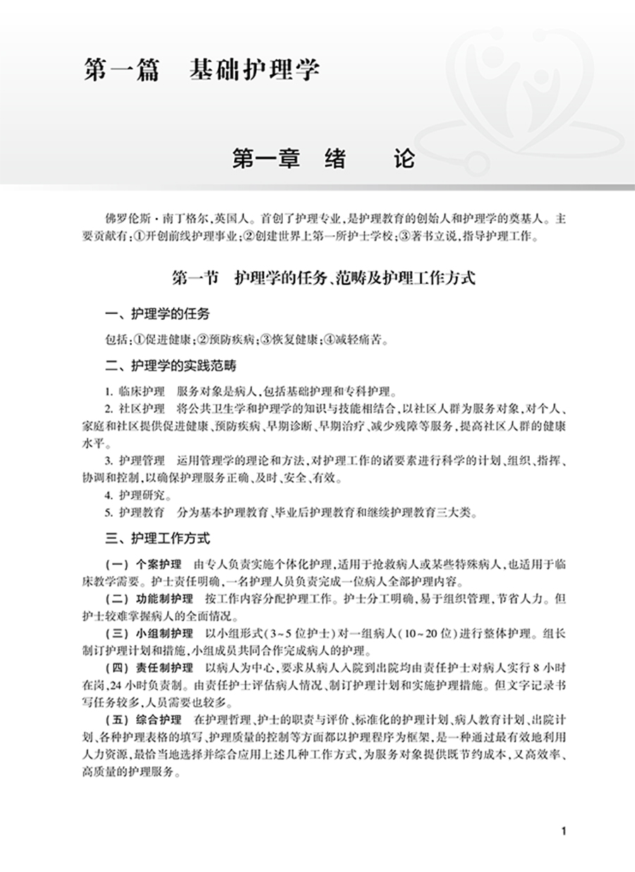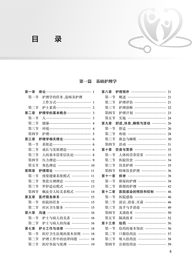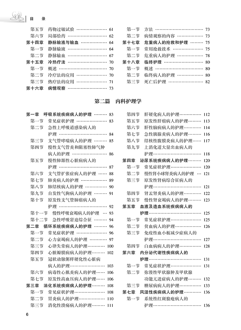 第一篇 基础护理学 第一章 绪论/ 1 第一节 护理学的任务、范畴及护理工作方式/ 1 第二节 护士素质/ 2 第二章 护理学的基本概念/ 3 第一节 人/ 3 第二节 健康/ 4 第三节 环境/ 4 第四节 护理/ 5 第三章 护理学相关理论/ 6 第一节 系统论/ 6 第二节 成长与发展理论/ 6 第三节 人的基本需要层次论/ 8 第四节 压力理论/ 9 第五节 角色理论 / 10 第四章 护理理论 / 11 第一节 纽曼健康系统模式 / 11 第二节 奥伦自理理论 / 12 第三节 罗伊适应模式 / 13 第四节 佩皮劳人际关系模式 / 14 第五章 医疗服务体系 / 15 第一节 医院的任务 / 15 第二节 社区卫生服务 / 15 第六章 沟通 / 16 第一节 护士与病人的关系 / 16 第二节 护士与病人的沟通 / 16 第七章 护士工作与法律 / 18 第一节 医疗卫生法规的基本原则 / 18 第二节 护理工作中的法律问题 / 18 第三节 医疗事故与处理 / 19 第八章 护理程序 / 21 第一节 概述 / 21 第二节 护理评估 / 21 第三节 护理诊断 / 22 第四节 护理计划 / 23 第五节 实施 / 24 第九章 舒适、休息、睡眠与活动 / 26 第一节 舒适 / 26 第二节 疼痛 / 28 第三节 休息与睡眠 / 30 第四节 活动 / 31 第十章 饮食与营养 / 33 第一节 人体的营养需要 / 33 第二节 医院饮食 / 34 第三节 饮食护理 / 35 第四节 特殊饮食护理 / 36 第十一章 排泄 / 38 第一节 排尿的护理 / 38 第二节 排便的护理 / 42 第十二章 医院感染的预防和控制 / 46 第一节 医院感染 / 46 第二节 清洁、消毒、灭菌 / 46 第三节 洗手与手消毒 / 49 第四节 无菌技术 / 50 第五节 隔离技术 / 52 第十三章 给药 / 56 第一节 给药的基本知识 / 56 第二节 口服给药法 / 57 第三节 吸入给药法 / 58 第四节 注射给药法 / 59 第五节 药物过敏试验 / 61 第六节 局部给药 / 62 第十四章 静脉输液与输血 / 64 第一节 静脉输液 / 64 第二节 静脉输血 / 67 第十五章 冷热疗法 / 70 第一节 概述 / 70 第二节 冷疗法的应用 / 70 第三节 热疗法的应用 / 71 第十六章 病情观察 / 73 第一节 方法 / 73 第二节 病情观察的内容 / 73 第十七章 危重病人的抢救和护理 / 75 第一节 常用抢救技术 / 75 第二节 危重病人的护理 / 78 第十八章 临终护理 / 80 第一节 概述 / 80 第二节 临终病人的护理 / 80 第三节 死亡后护理 / 82 第二篇 内科护理学 第一章 呼吸系统疾病病人的护理 / 83 第一节 常见症状护理 / 83 第二节 急性上呼吸道感染病人的护理 / 84 第三节 支气管哮喘病人的护理 / 85 第四节 慢性支气管炎和阻塞性肺气肿 病人的护理 / 86 第五节 慢性肺源性心脏病病人的护理 / 87 第六节 支气管扩张症病人的护理 / 88 第七节 肺炎病人的护理 / 89 第八节 肺结核病人的护理 / 90 第九节 自发性气胸病人的护理 / 91 第十节 原发性支气管肺癌病人的护理 / 92 第十一节 慢性呼吸衰竭病人的护理 / 93 第十二节 急性呼吸窘迫综合征 / 94 第二章 循环系统疾病病人的护理 / 96 第一节 常见症状护理 / 96 第二节 心力衰竭病人的护理 / 97 第三节 心律失常病人的护理/ 100 第四节 心脏瓣膜病病人的护理/ 102 第五节 冠状动脉粥样硬化性心脏病病人的护理/ 103 第六节 病毒性心肌炎病人的护理/ 106 第七节 原发性高血压病人的护理/ 106 第三章 消化系统疾病病人的护理/ 108 第一节 常见症状护理/ 108 第二节 胃炎病人的护理/ 110 第三节 消化性溃疡病人的护理/ 111 第四节 肝硬化病人的护理/ 112 第五节 原发性肝癌病人的护理/ 113 第六节 肝性脑病病人的护理/ 114 第七节 急性胰腺炎病人的护理/ 116 第八节 结核性腹膜炎病人的护理/ 117 第九节 上消化道大量出血病人的护理/ 118 第四章 泌尿系统疾病病人的护理/ 120 第一节 常见症状护理/ 120 第二节 慢性肾小球肾炎病人的护理 / 121 第三节 原发性肾病综合征病人的护理/ 121 第四节 肾盂肾炎病人的护理/ 122 第五节 慢性肾衰竭病人的护理/ 123 第五章 血液及造血系统疾病病人的护理/ 125 第一节 常见症状护理/ 125 第二节 贫血病人的护理/ 126 第三节 免疫性血小板减少症病人的护理/ 127 第四节 白血病病人的护理/ 128 第六章 内分泌代谢性疾病病人的护理/ 131 第一节 常见症状护理/ 131 第二节 弥漫性甲状腺肿及甲状腺功能亢进症病人的护理/ 132 第三节 糖尿病病人的护理/ 133 第七章 风湿性疾病病人的护理/ 136 第一节 系统性红斑狼疮病人的护理/ 136 第二节 类风湿关节炎病人的护理/ 137 第八章 神经系统疾病病人的护理/ 139 第一节 常见症状护理/ 139 第二节 急性脑血管疾病病人的护理/ 140 第三节 癫痫病人的护理/ 142 第三篇 外科护理学 第一章 水、电解质、酸碱代谢失调病人的护理/ 143 第一节 正常体液平衡/ 143 第二节 水和钠代谢紊乱的护理/ 144 第三节 电解质代谢异常的护理/ 145 第四节 酸碱平衡失调的护理/ 146 第五节 液体疗法及护理/ 146 第二章 外科营养支持病人的护理/ 148 第一节 概述/ 148 第二节 肠内营养/ 148 第三节 肠外营养/ 149 第三章 外科休克病人的护理/ 151 第一节 概述/ 151 第二节 低血容量性休克/ 152 第三节 感染性休克/ 152 第四节 护理措施/ 153 第四章 多器官功能障碍综合征/ 154 第一节 概述/ 154 第二节 急性肾衰竭/ 154 第三节 弥散性血管内凝血/ 155 第五章 麻醉病人的护理/ 157 第一节 全身麻醉/ 157 第二节 椎管内麻醉/ 158 第三节 局部麻醉/ 158 第四节 围麻醉期护理/ 159 第五节 术后镇痛/ 160 第六章 心肺脑复苏/ 161 第一节 概述/ 161 第二节 