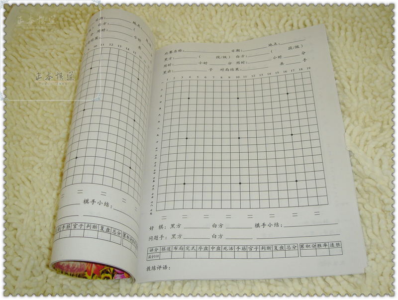 (1)采用大棋谱,记录本规格接近A4纸的大小,降低了记录的难度。 (2)根据孩子喜欢评分的特点,对孩子的每一次记录进行百分制评分。评分内容包括:棋道、布局、定式、序盘、中盘、死活、手筋、官子、形式判断、复盘等方面,构成了一个科学的训练链,使孩子学习围棋知识更系统,更完善。 (3)低龄小朋友识字不多,采用直接写出相关好手和问题手的数字,简化了小朋友的复盘小结。 (4)设置了总分、连胜、胜率等表格,教练可根据以上数据对小朋友进行奖励,增强了小朋友完成记录的动力。 (5)根据小朋友使用记录本容易破损的特点,加强了纸质的强度,封面采用200克铜版纸并过光胶,内页48P使用80克双胶纸,比市场上常见的要稍厚些,棋谱记录清晰且不透底。