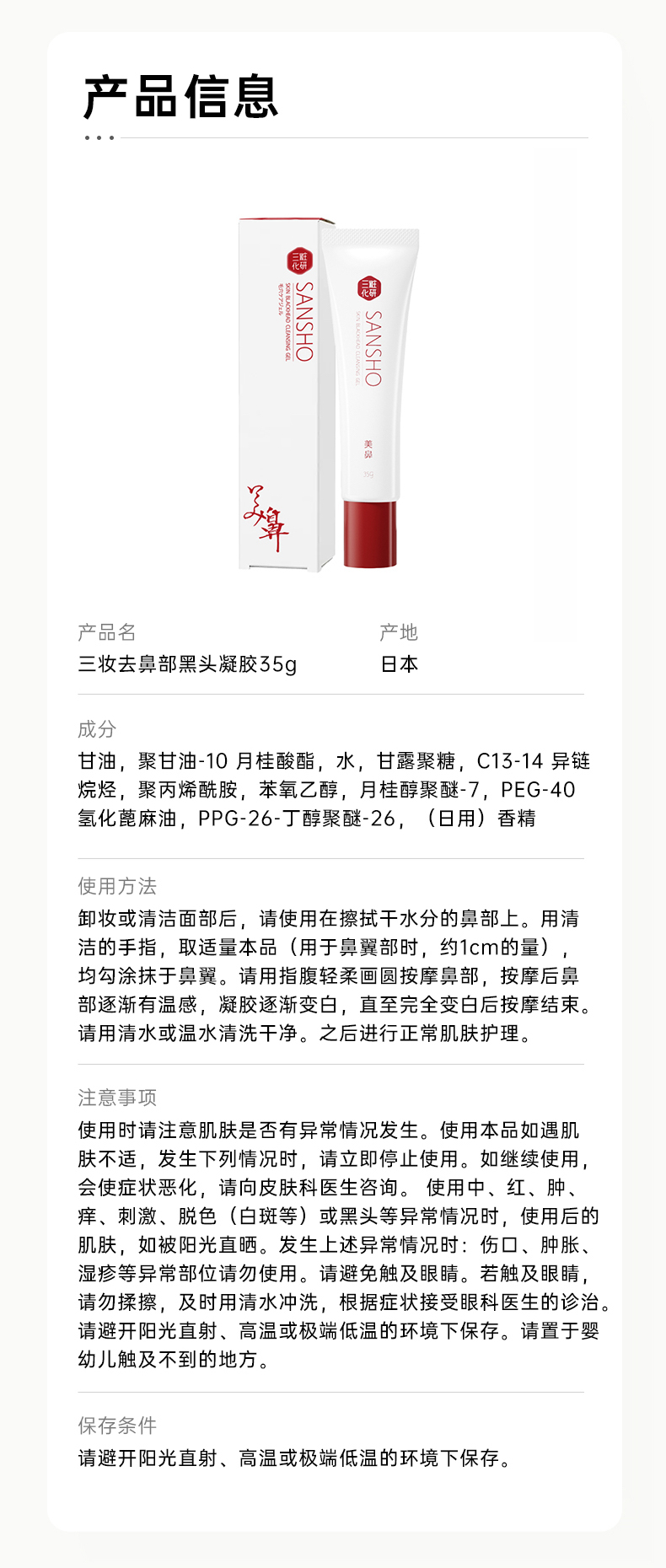 【特卖】日本进口 三妆化研 去鼻部黑头凝胶35g