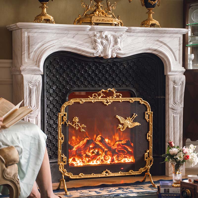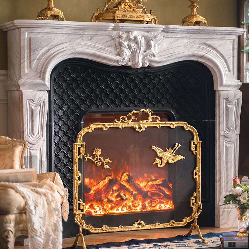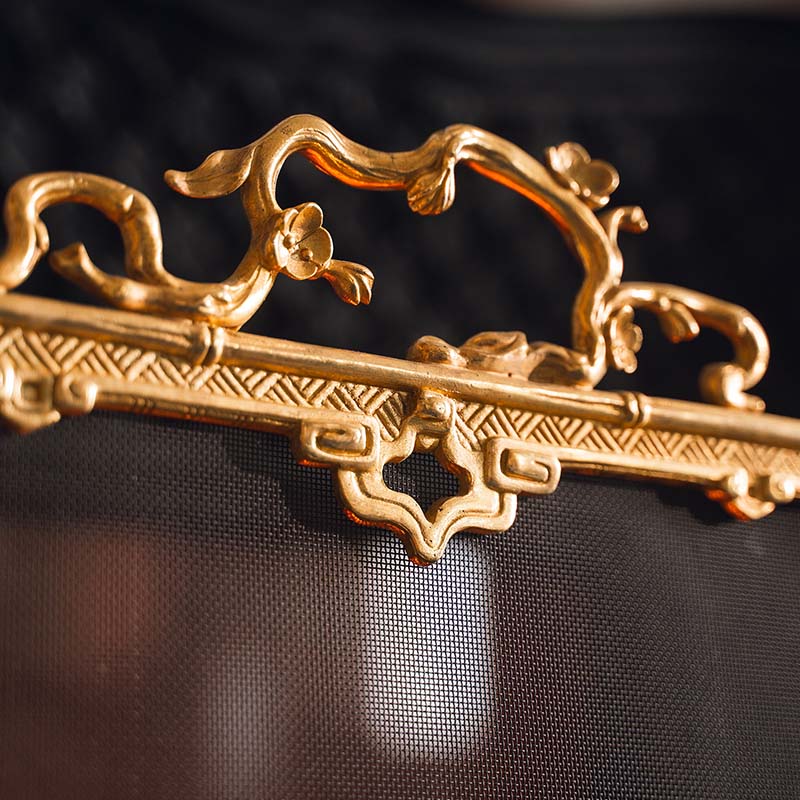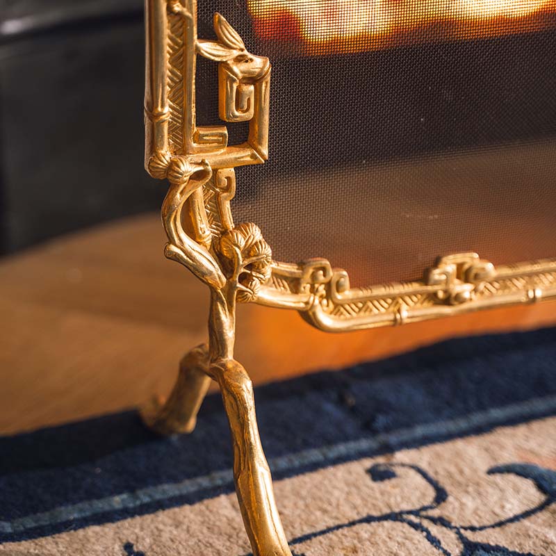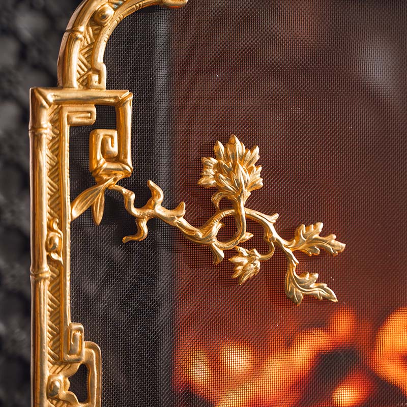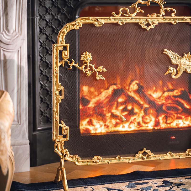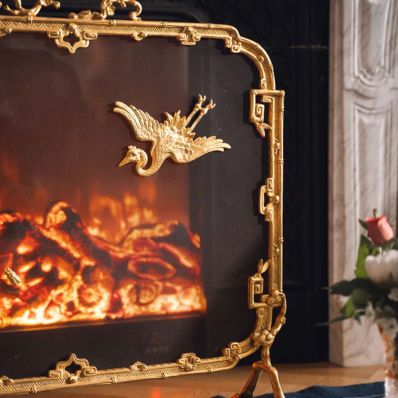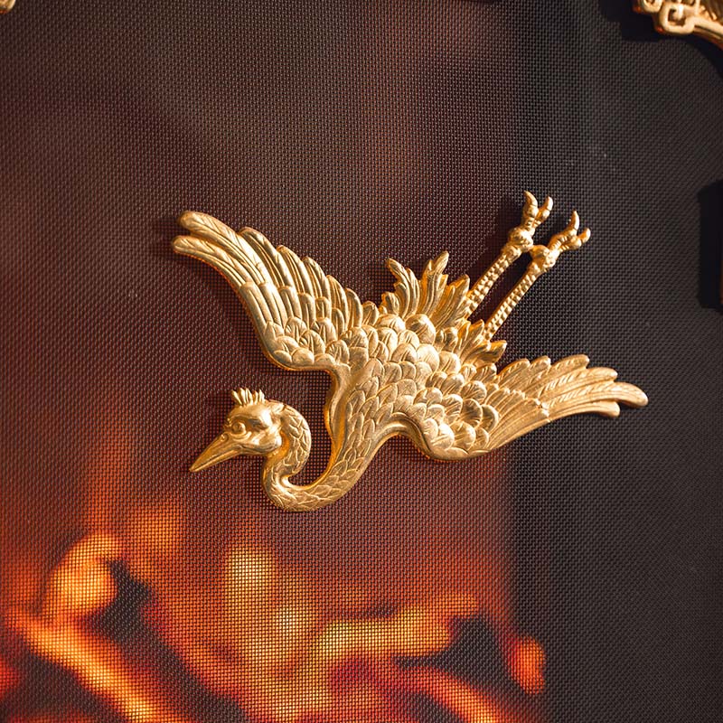 19世纪法国出品东方风格回纹仙鹤主题铜鎏金精雕壁炉屏风