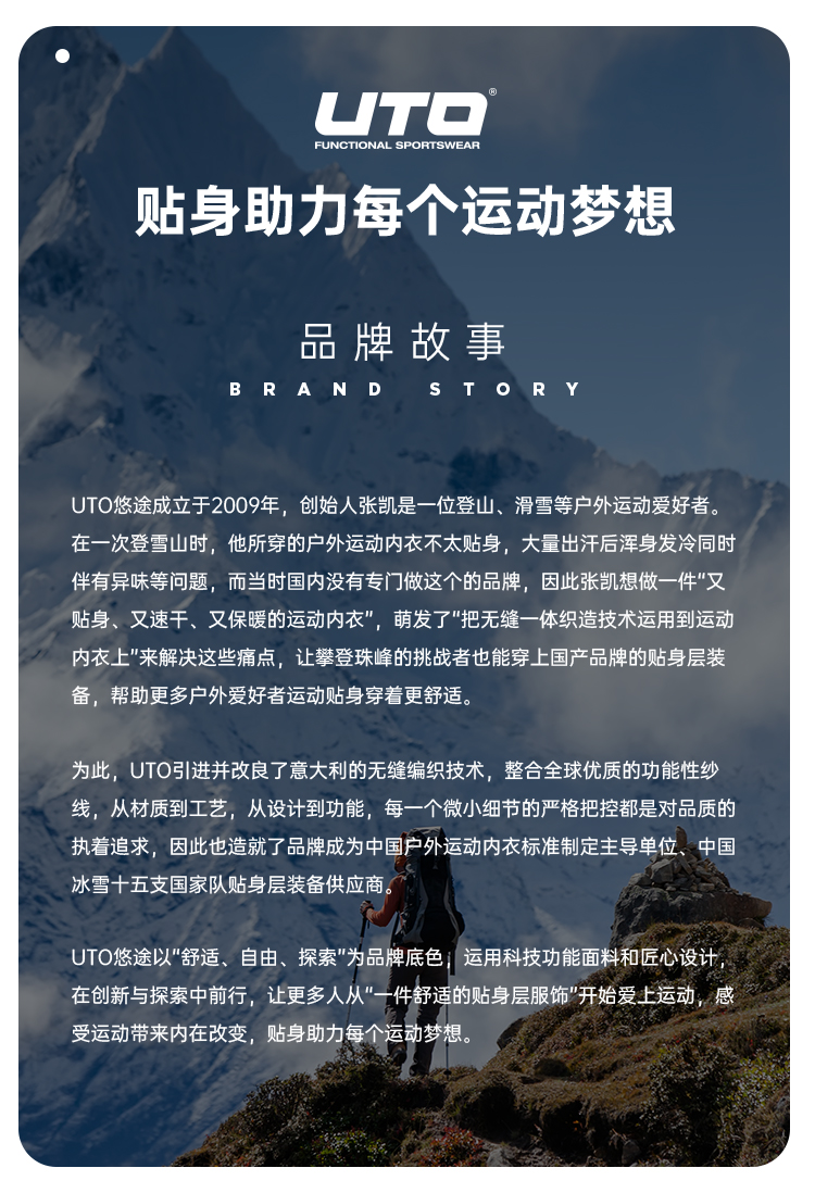 UTO悠途潜心于贴身运动装备的研发、设计和生产。从纤维到组织,从设计到工艺,在无缝贴身运动装备领域,树立国内标杆。 UTO着力于品牌互联网化,不断采集大量运动数据,为跑步、健身、滑雪等不同类型的运动爱