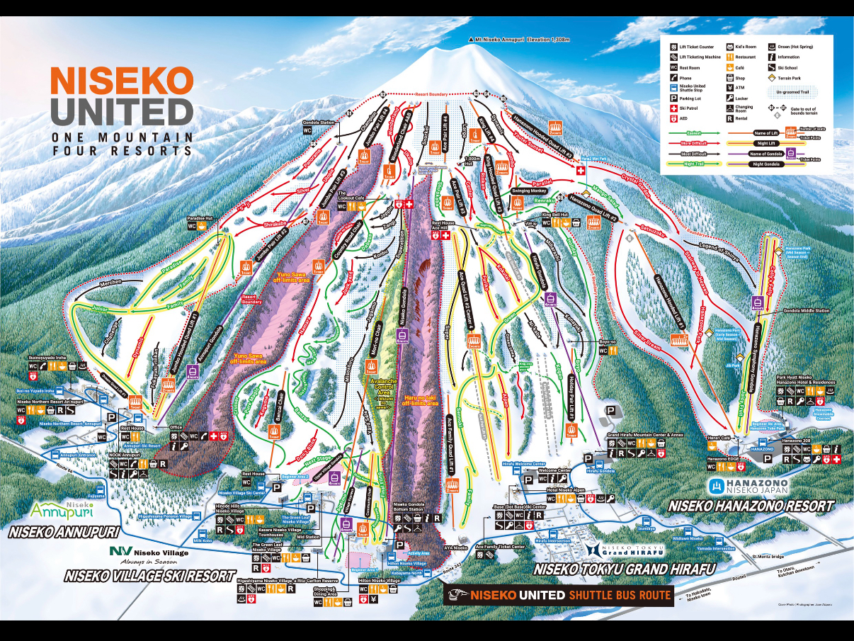 二世谷滑雪场并不是一个雪场,而是四座依二世谷安努普利山而建的落差千米的雪场总称。四座雪场分别为:二世谷安普里斯雪场(Niseko Annupuri)、二世谷村雪场(Niseko Village)、二世谷花园雪场(Niseko Hanazono Resort)和二世谷比罗夫雪场(Niseko Grand Hirafu)。四座雪场在山顶处相连,滑到山脚就四面八方了,因此二世谷滑雪场也被称为二世谷联合滑雪场。二世谷雪场是日本规模最大也最受全球滑雪爱好者欢迎的雪场,它有世界排名前四的超高降雪量和最好的粉雪(Powder Snow)雪质。丰富的雪量和超高的雪质让滑雪者有种仿佛跌入棉花糖的感觉。