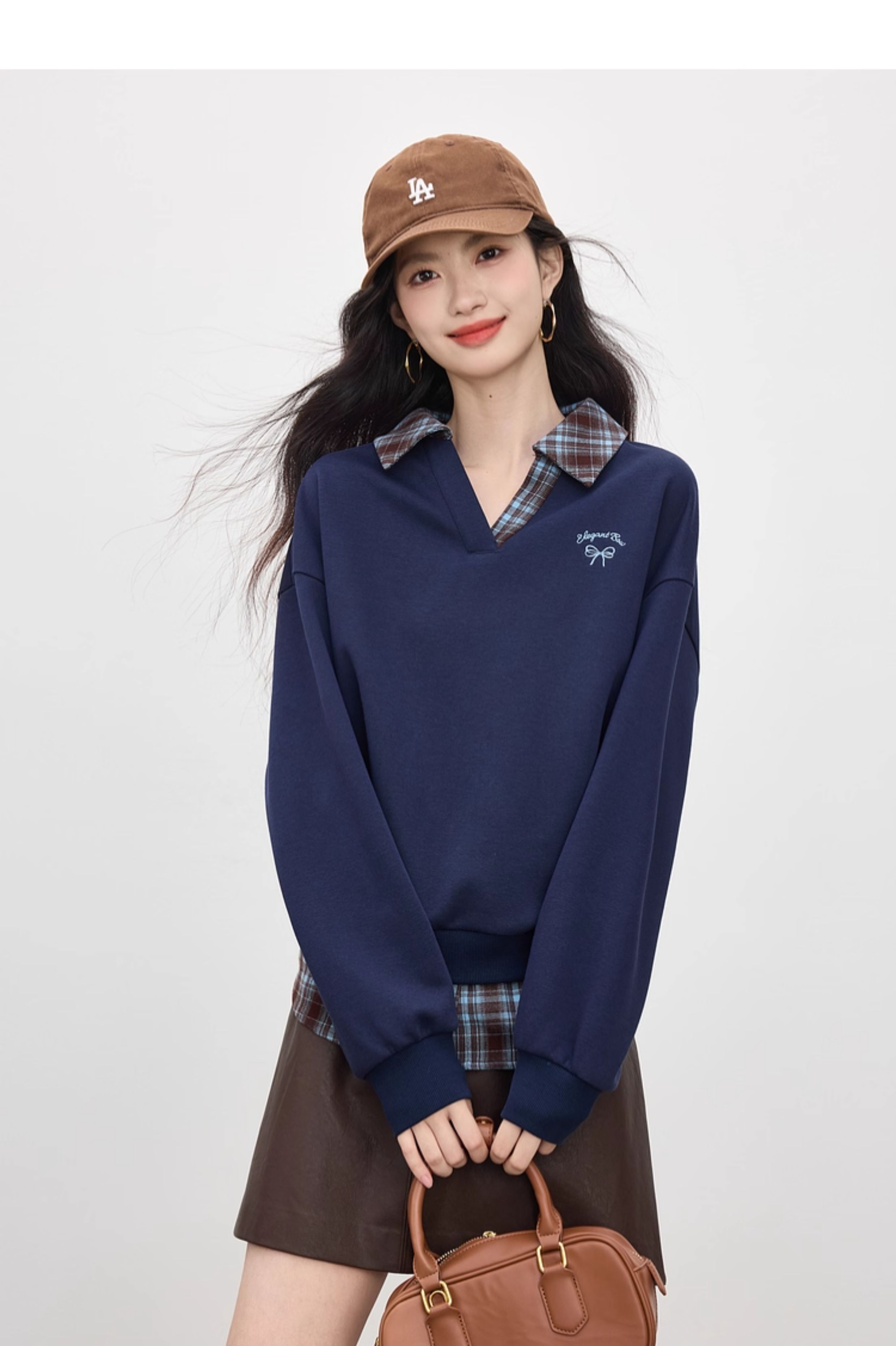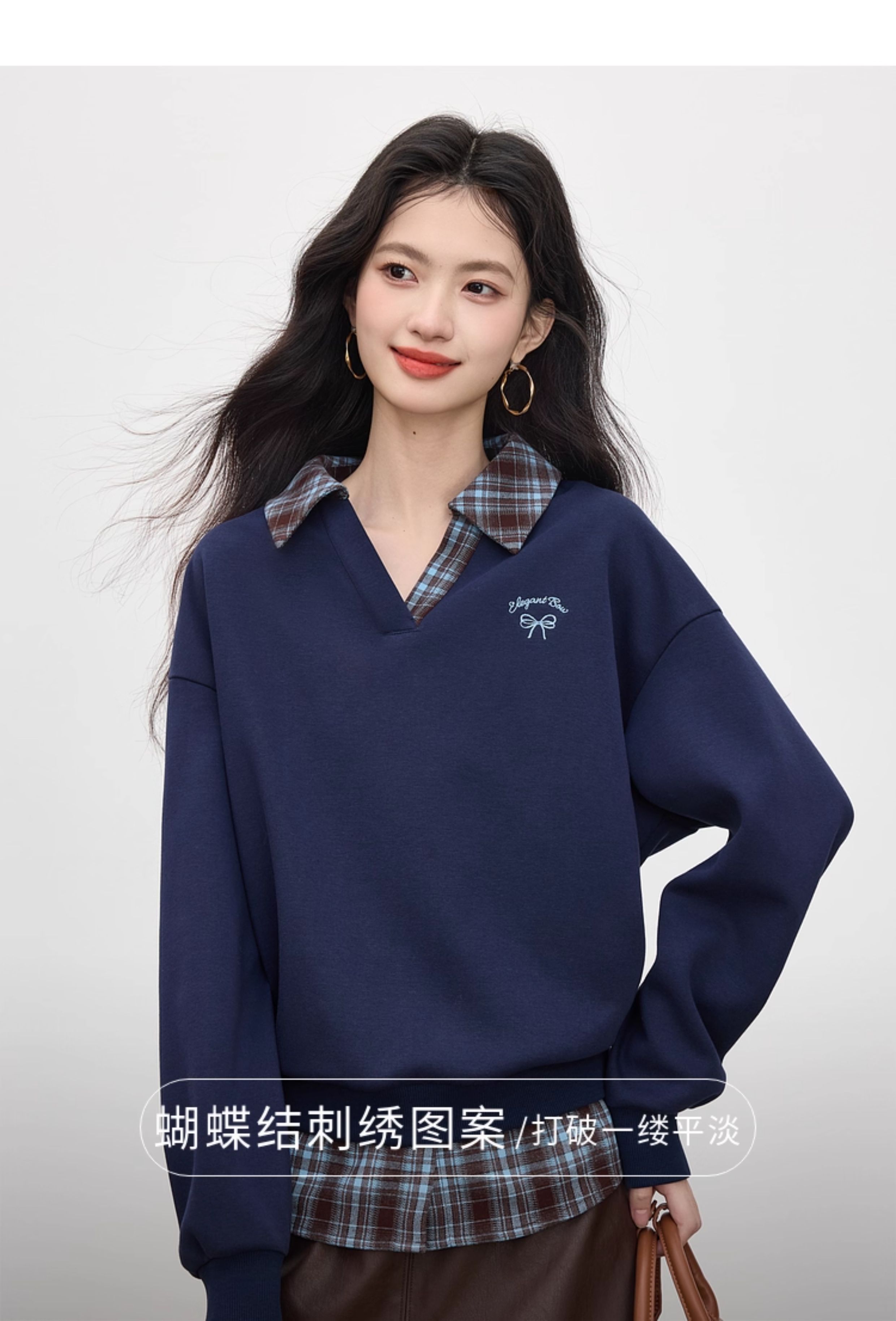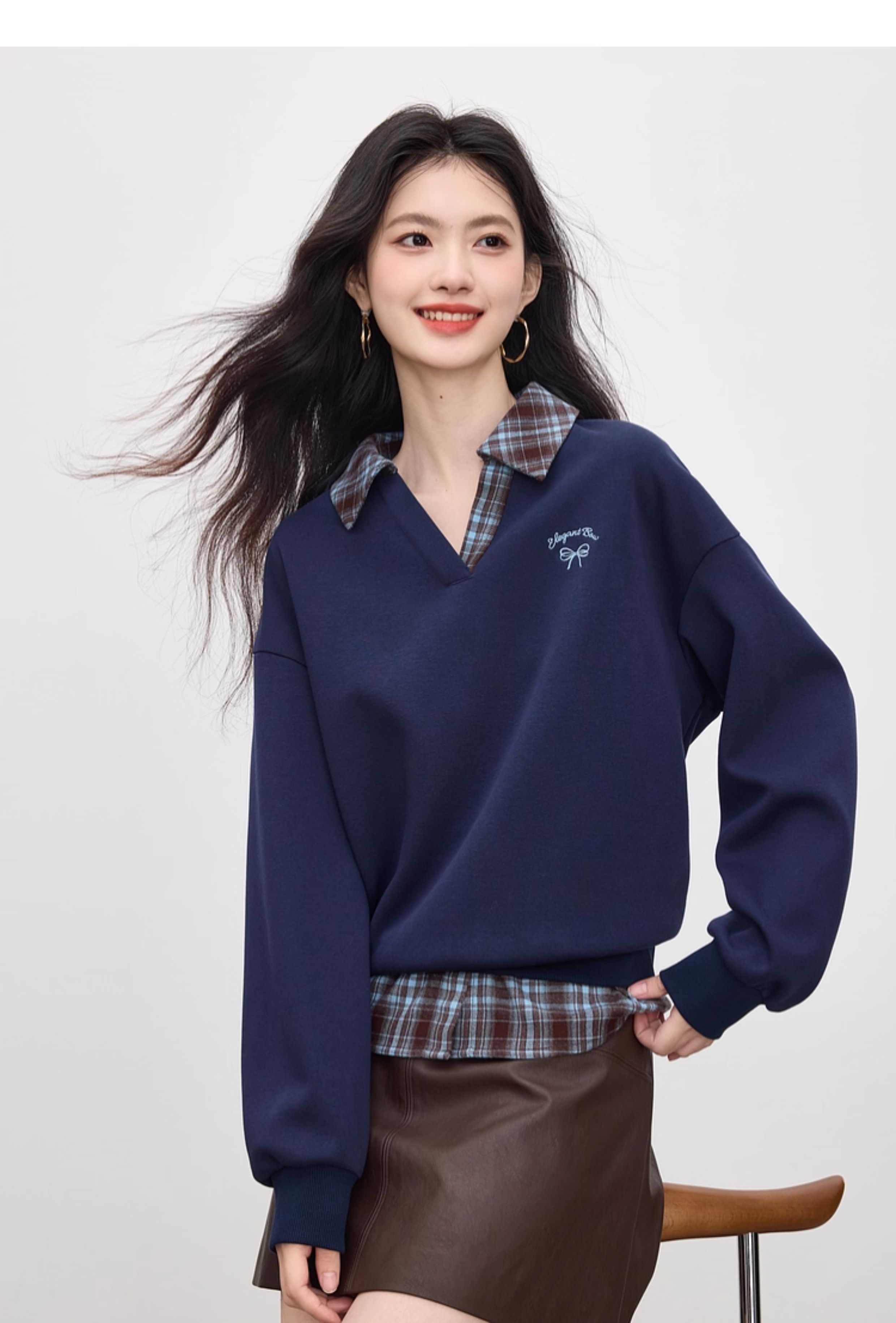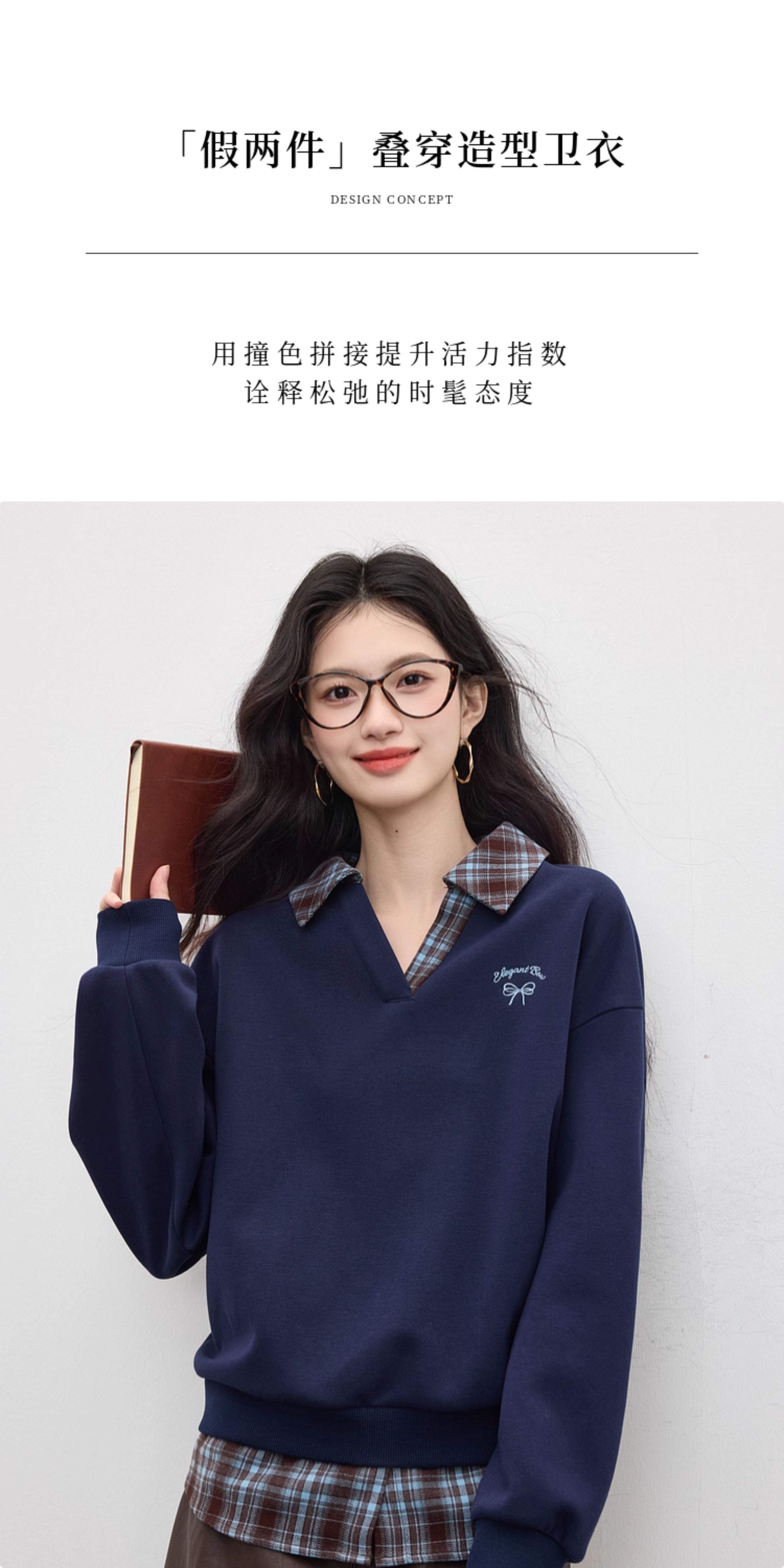 【09/17新品】熙世界MIU系学院假两件卫衣女设计感秋季宽松套头格子POLO领上衣