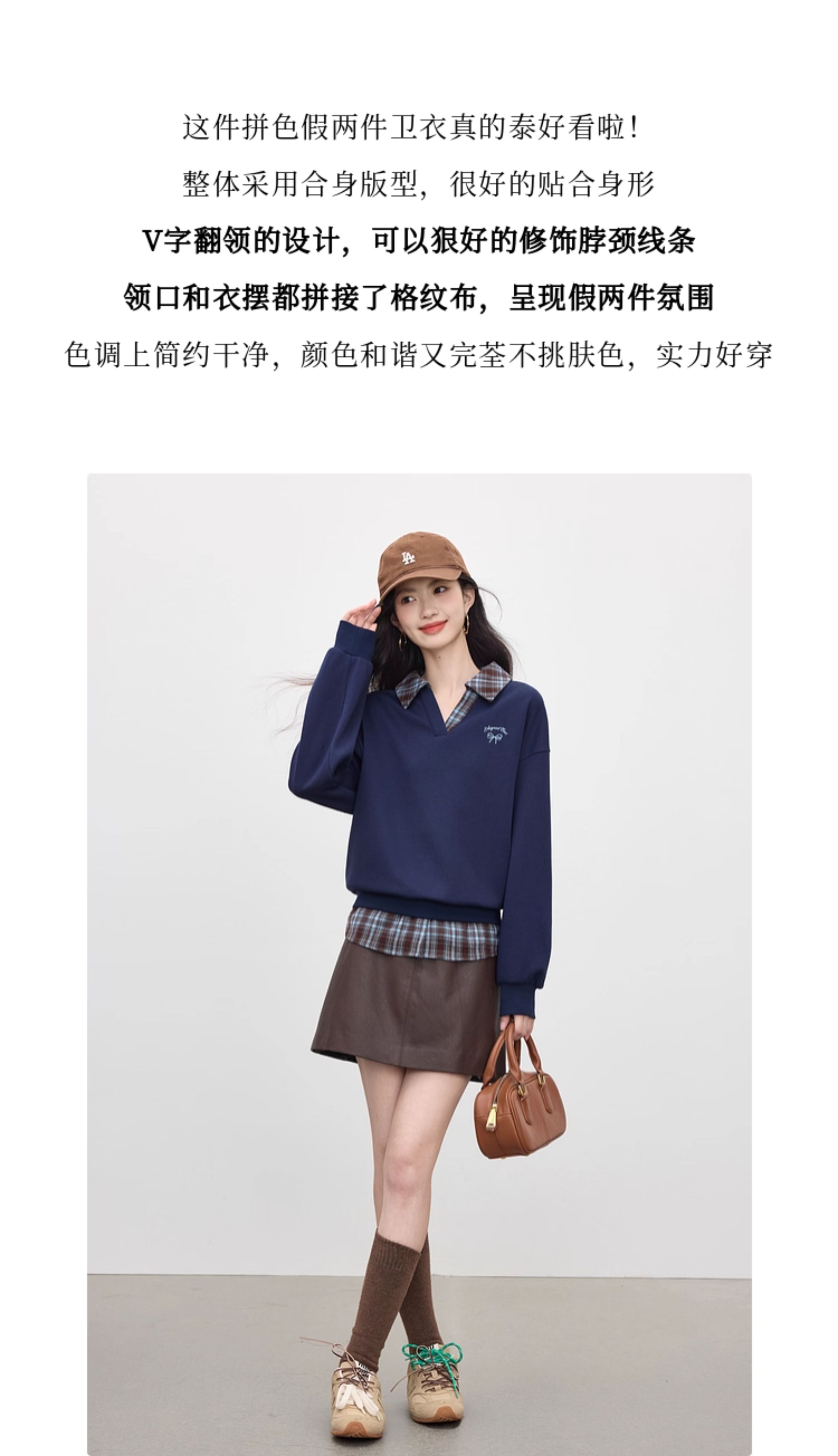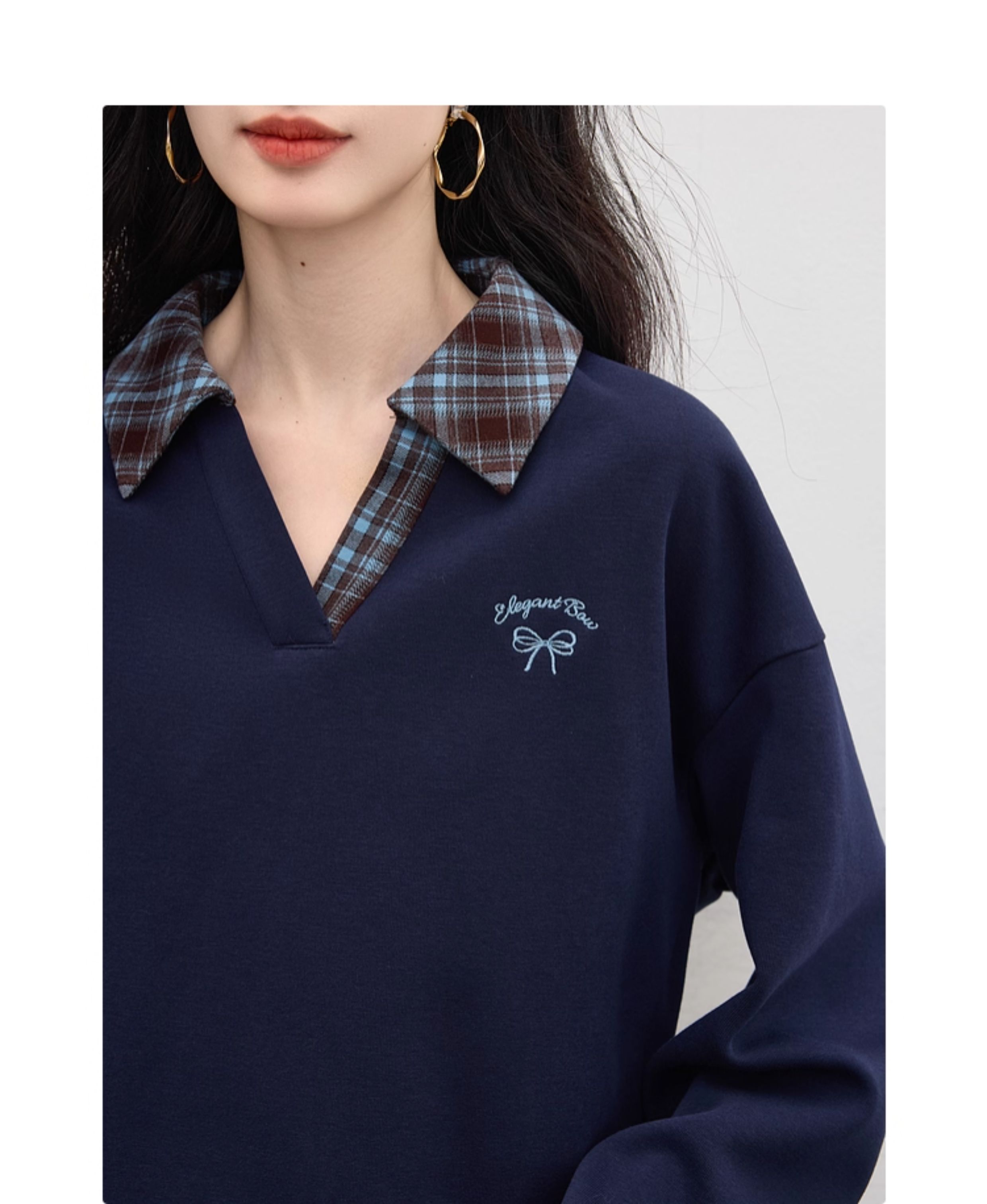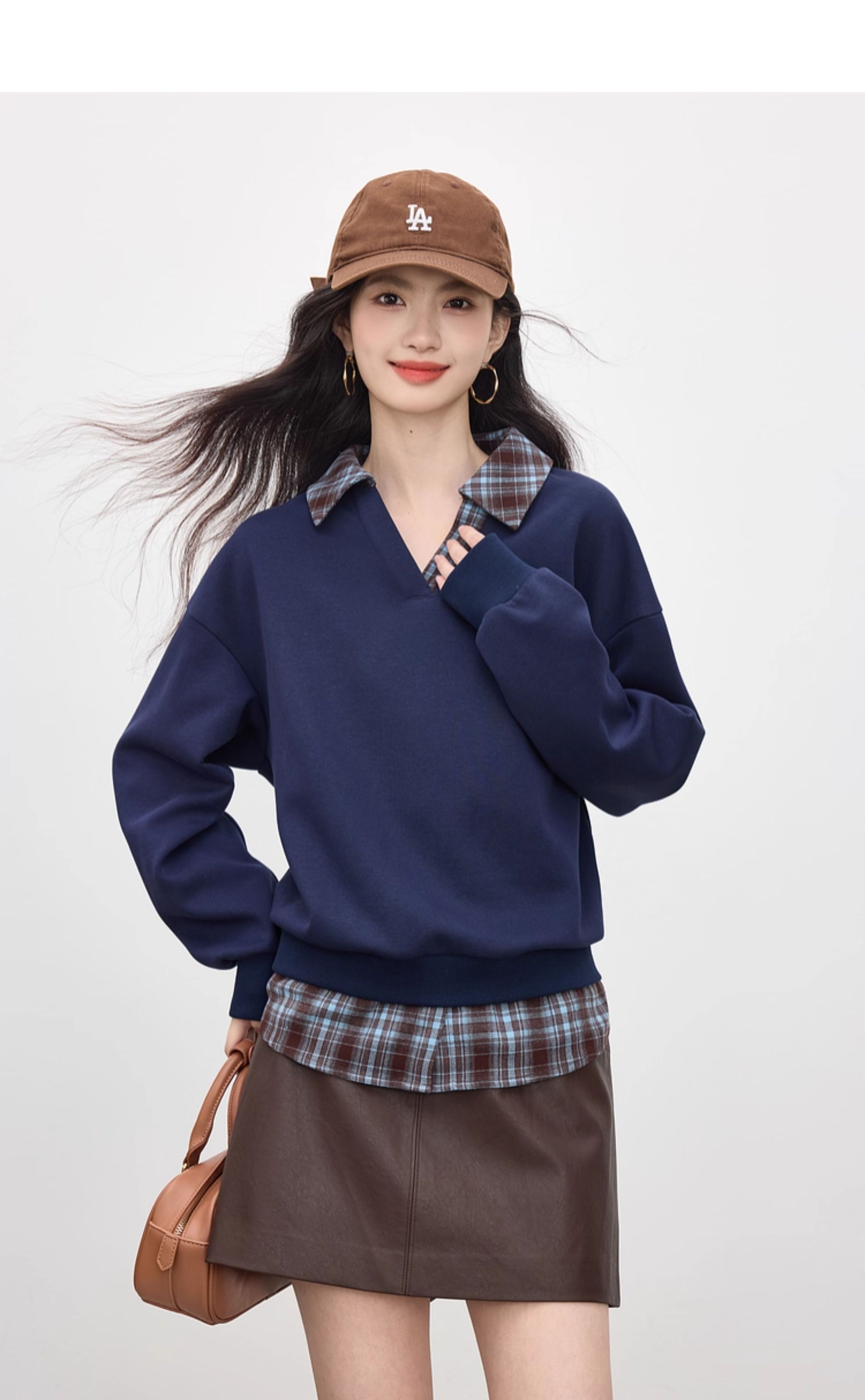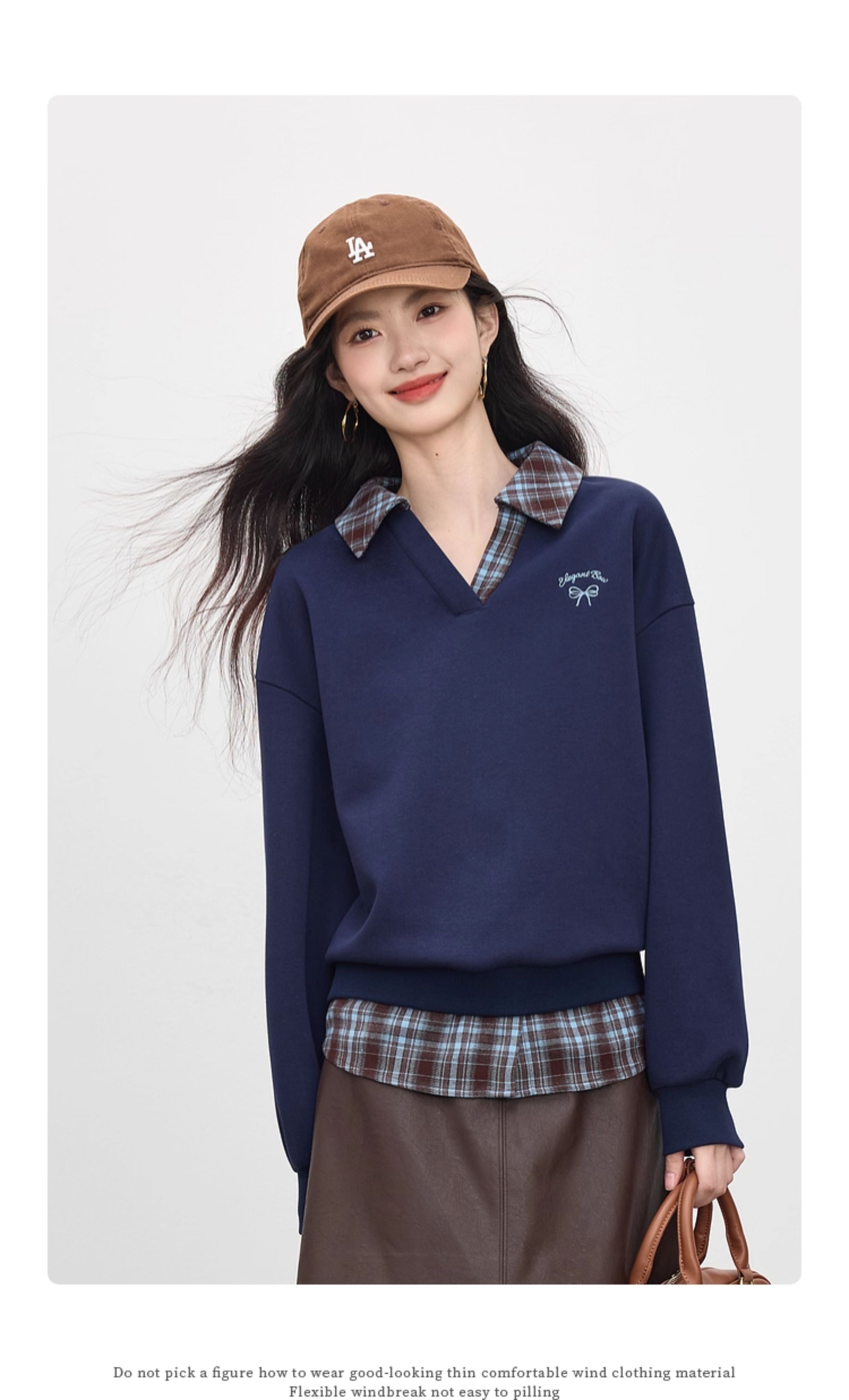 【09/17新品】熙世界MIU系学院假两件卫衣女设计感秋季宽松套头格子POLO领上衣