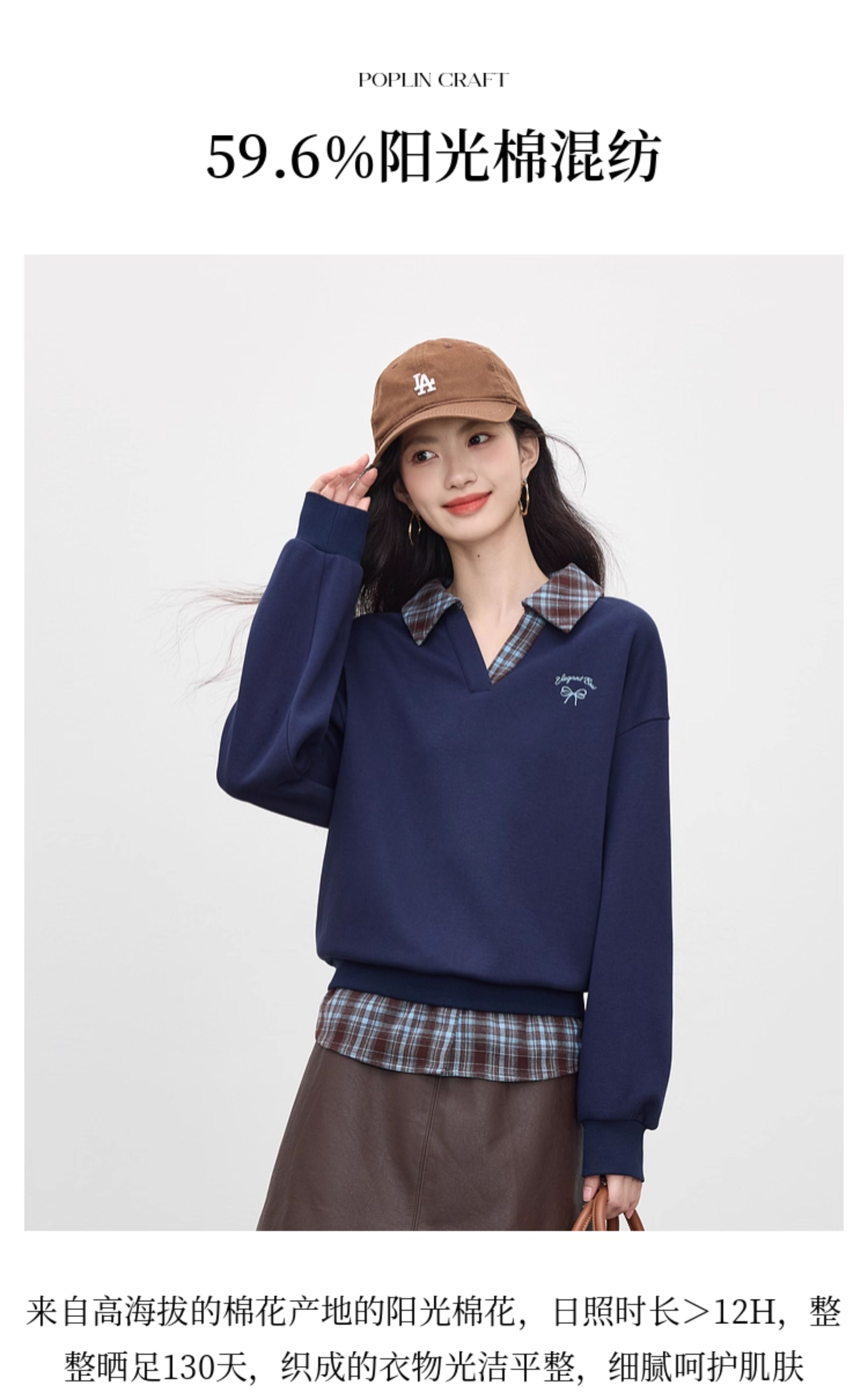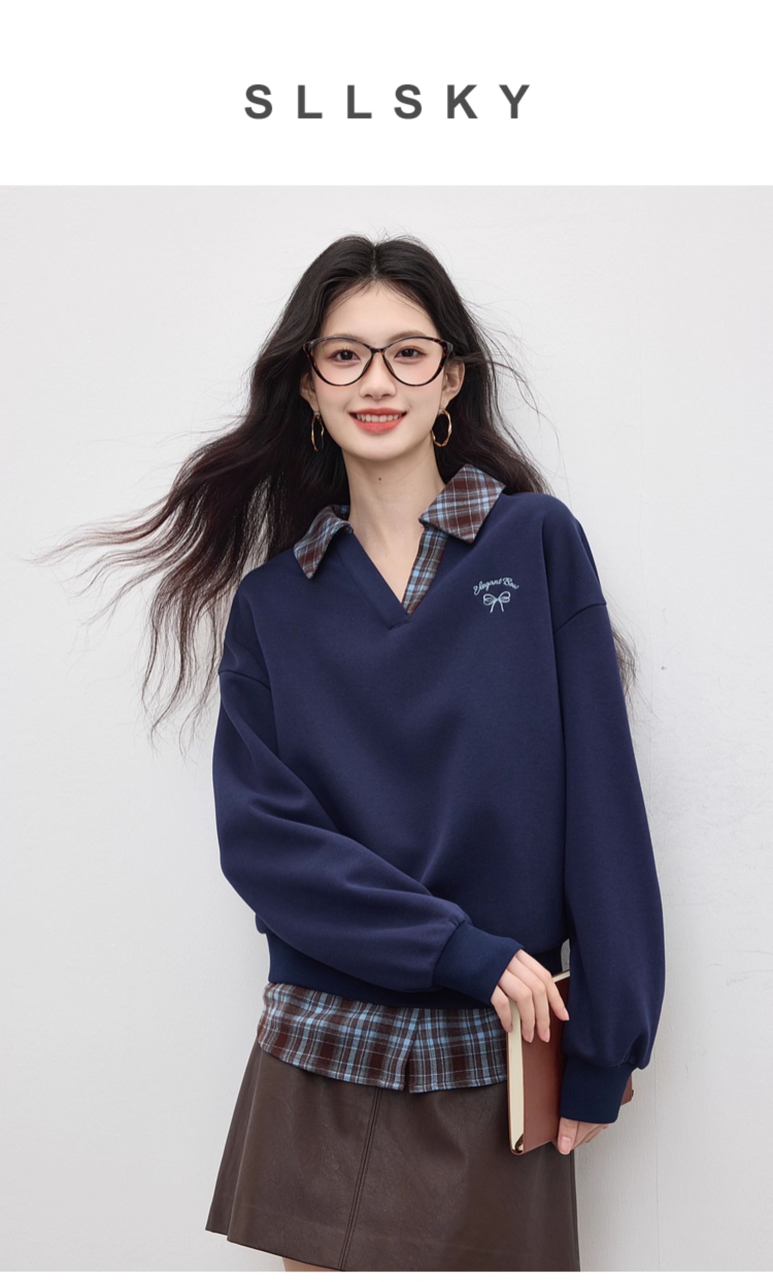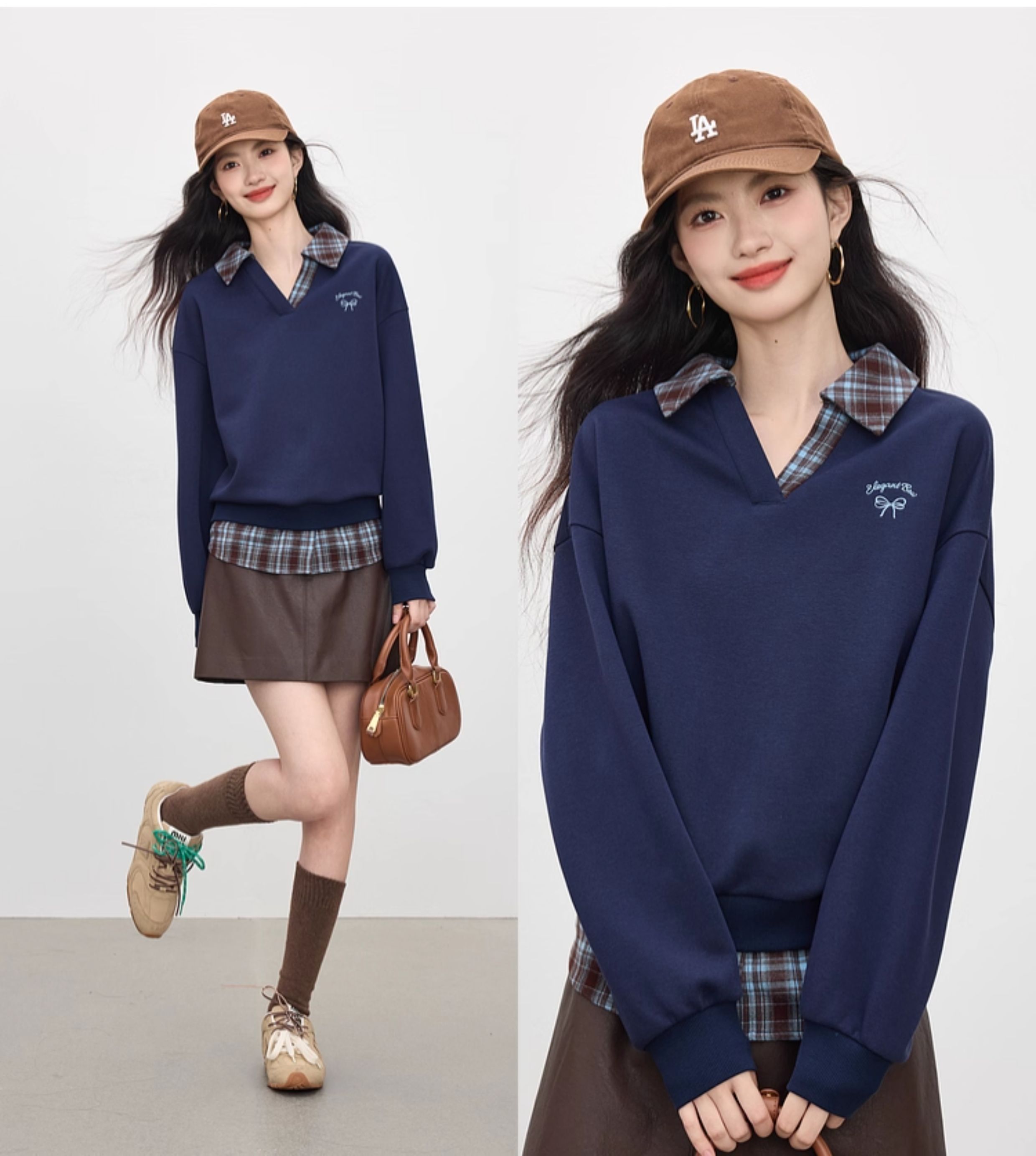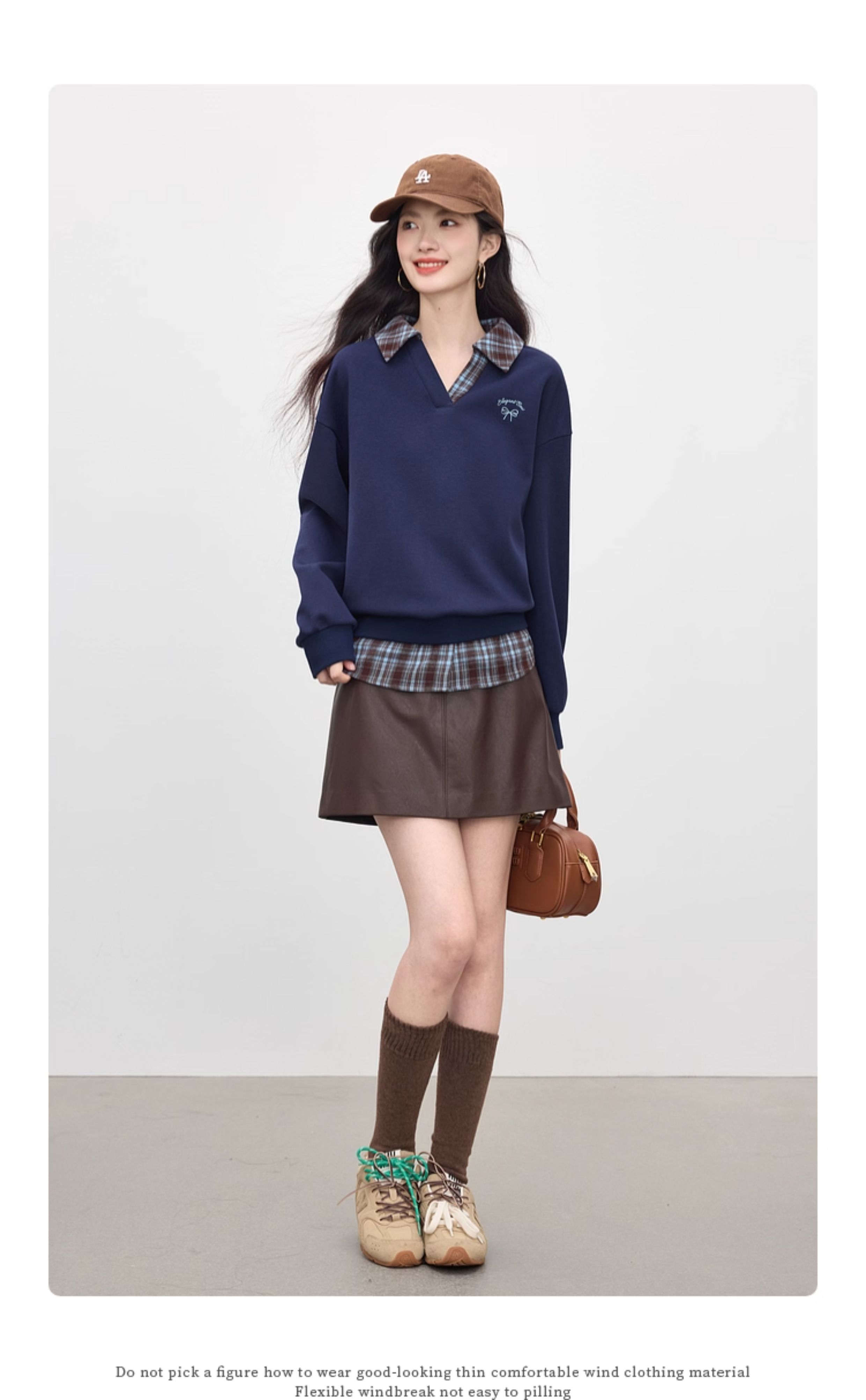 【09/17新品】熙世界MIU系学院假两件卫衣女设计感秋季宽松套头格子POLO领上衣