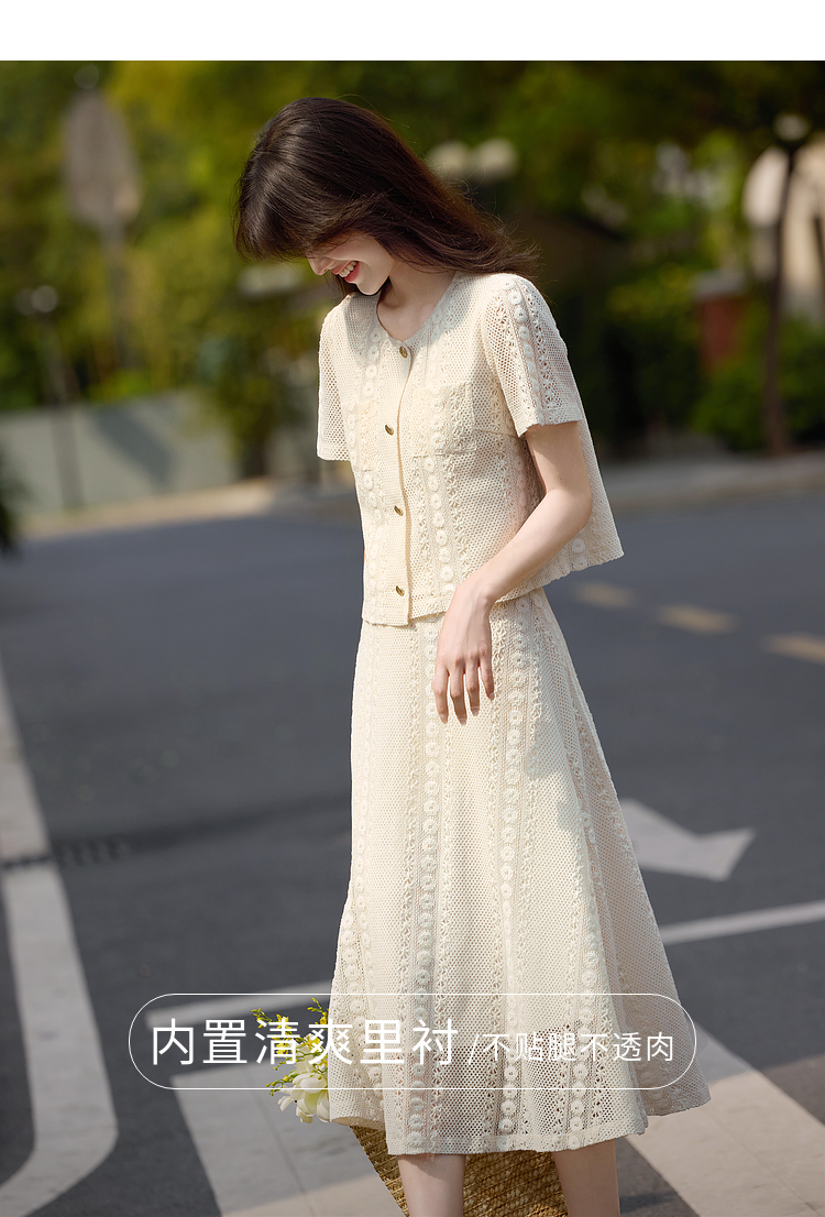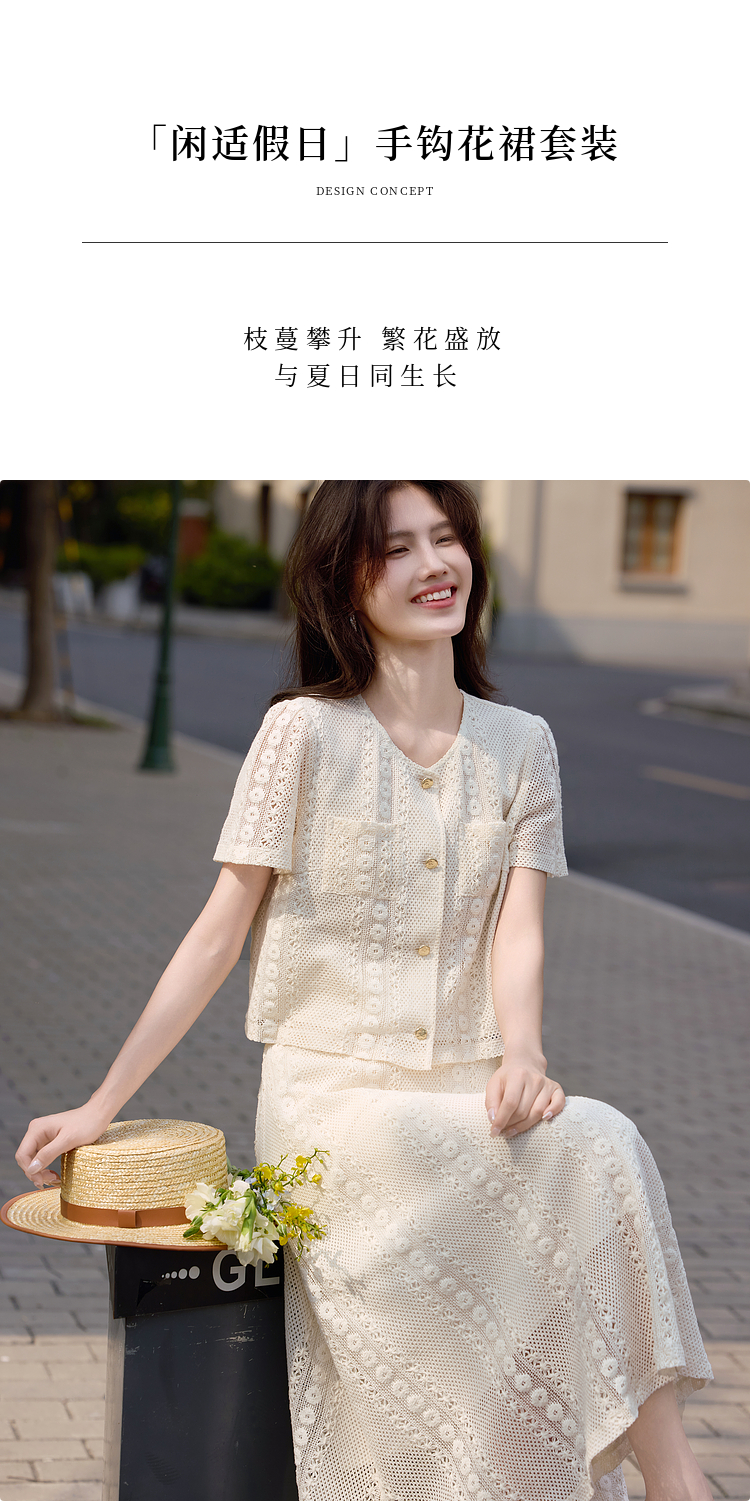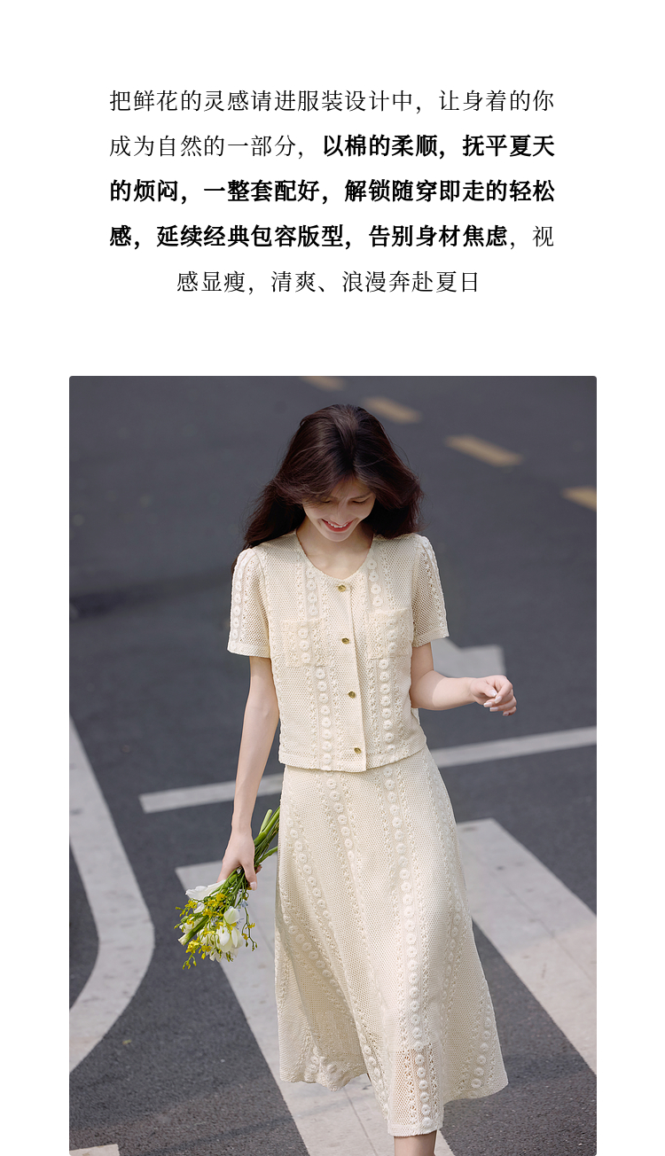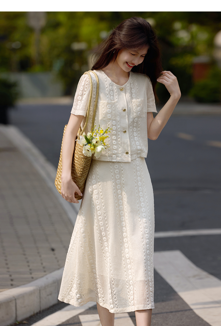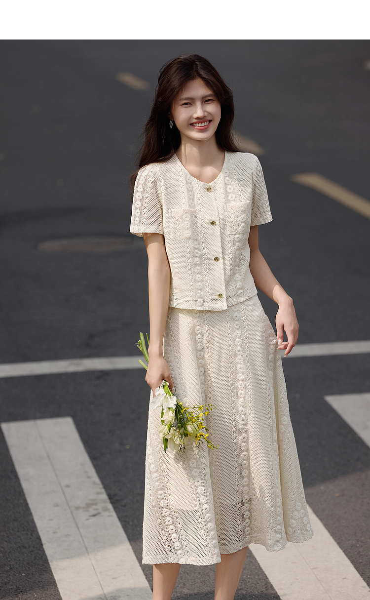 熙世界2025夏日套装搭配一整套女休闲镂空钩花蕾丝衫半身裙两件套