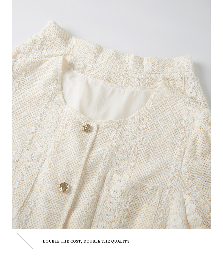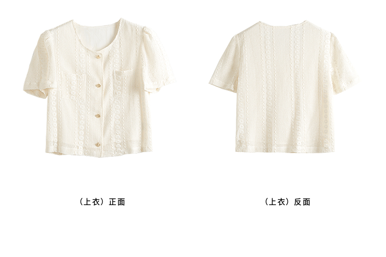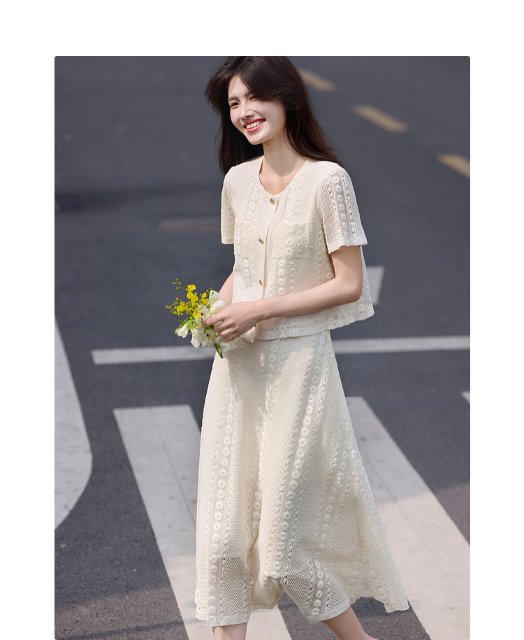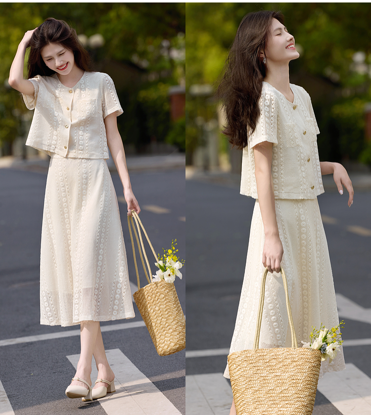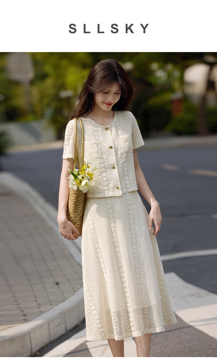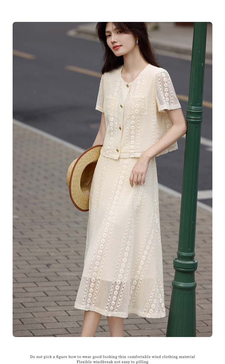 熙世界2025夏日套装搭配一整套女休闲镂空钩花蕾丝衫半身裙两件套