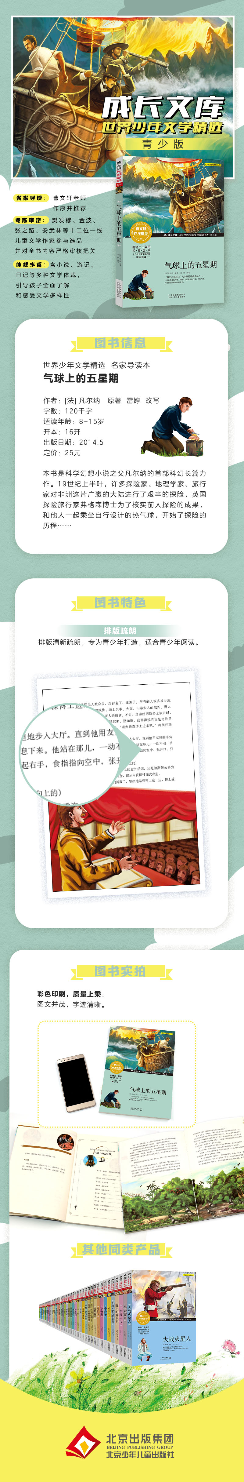 【8-15岁】名著冒险类主题读物 八十天环游地球、金银岛、鲁宾逊漂流记、气球上的五星期、汤姆索亚历险记 成长文库青少版 [法]凡尔纳 原著 刘红伟 改写