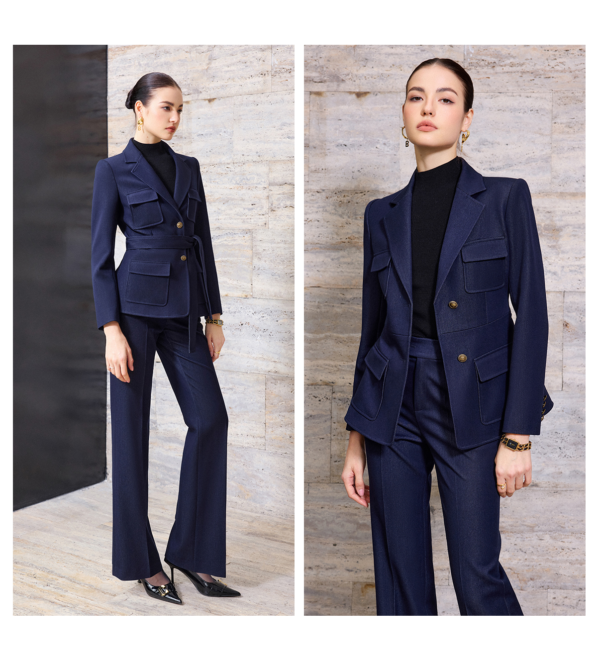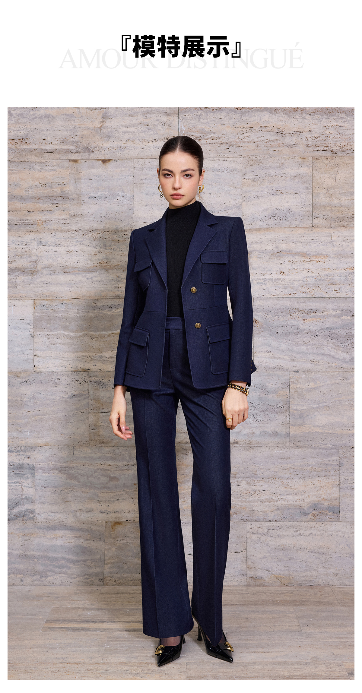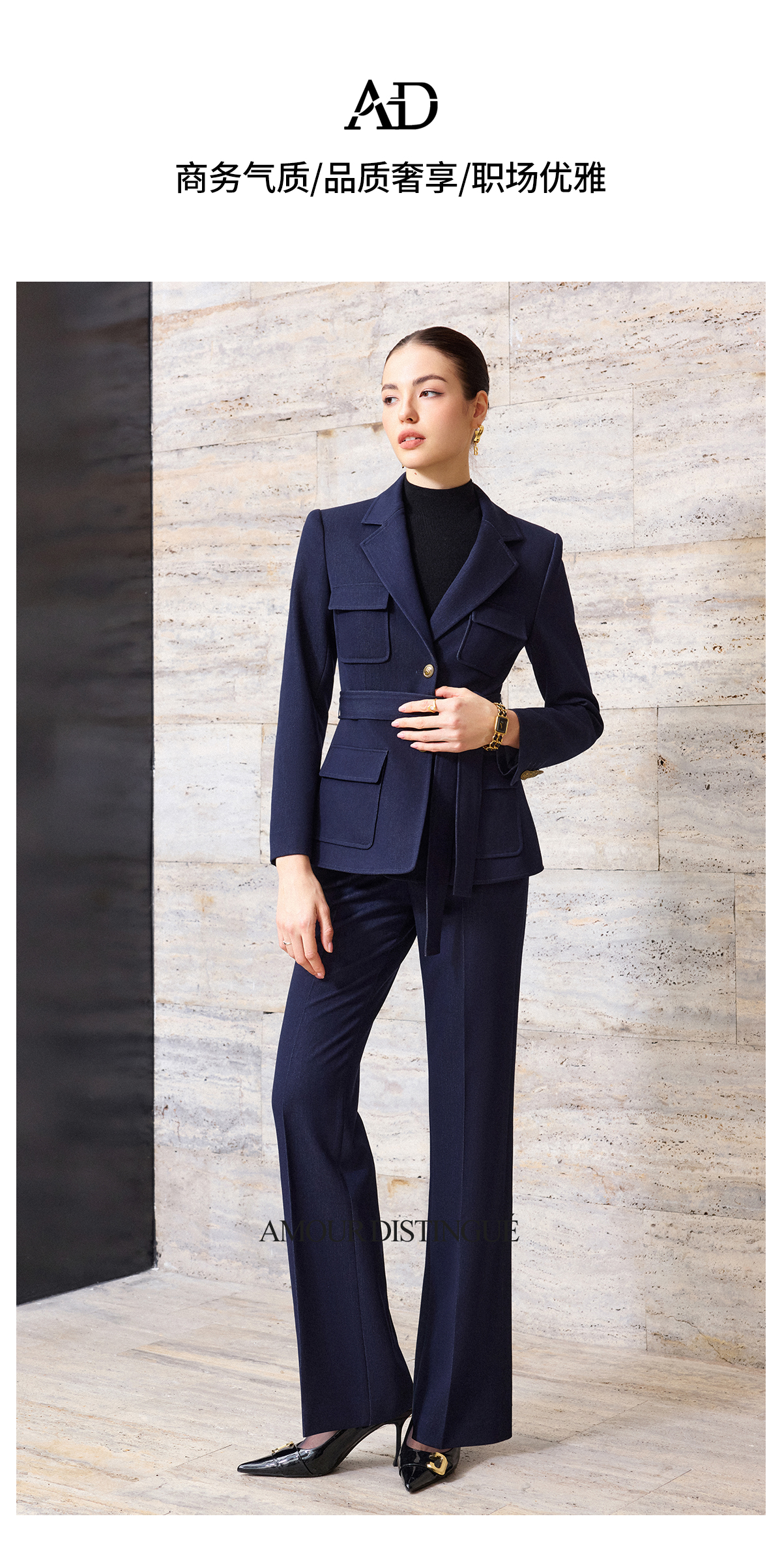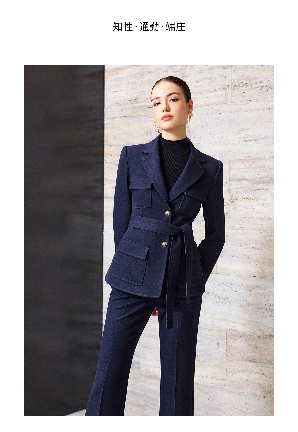 IWY/藏青色高端英伦风系带西装套装秋冬智感蓝调职场气质百搭牛仔蓝西装高腰显瘦直筒裤女CP2558