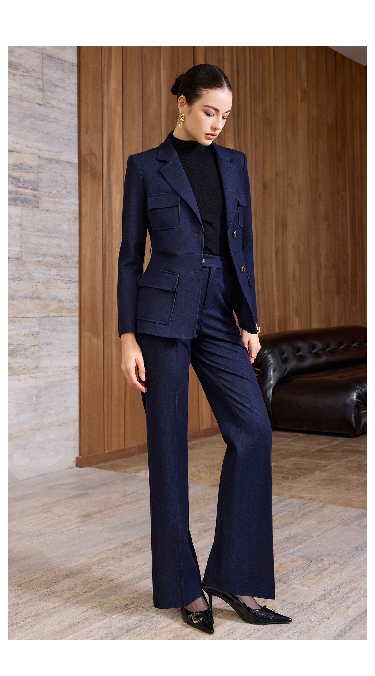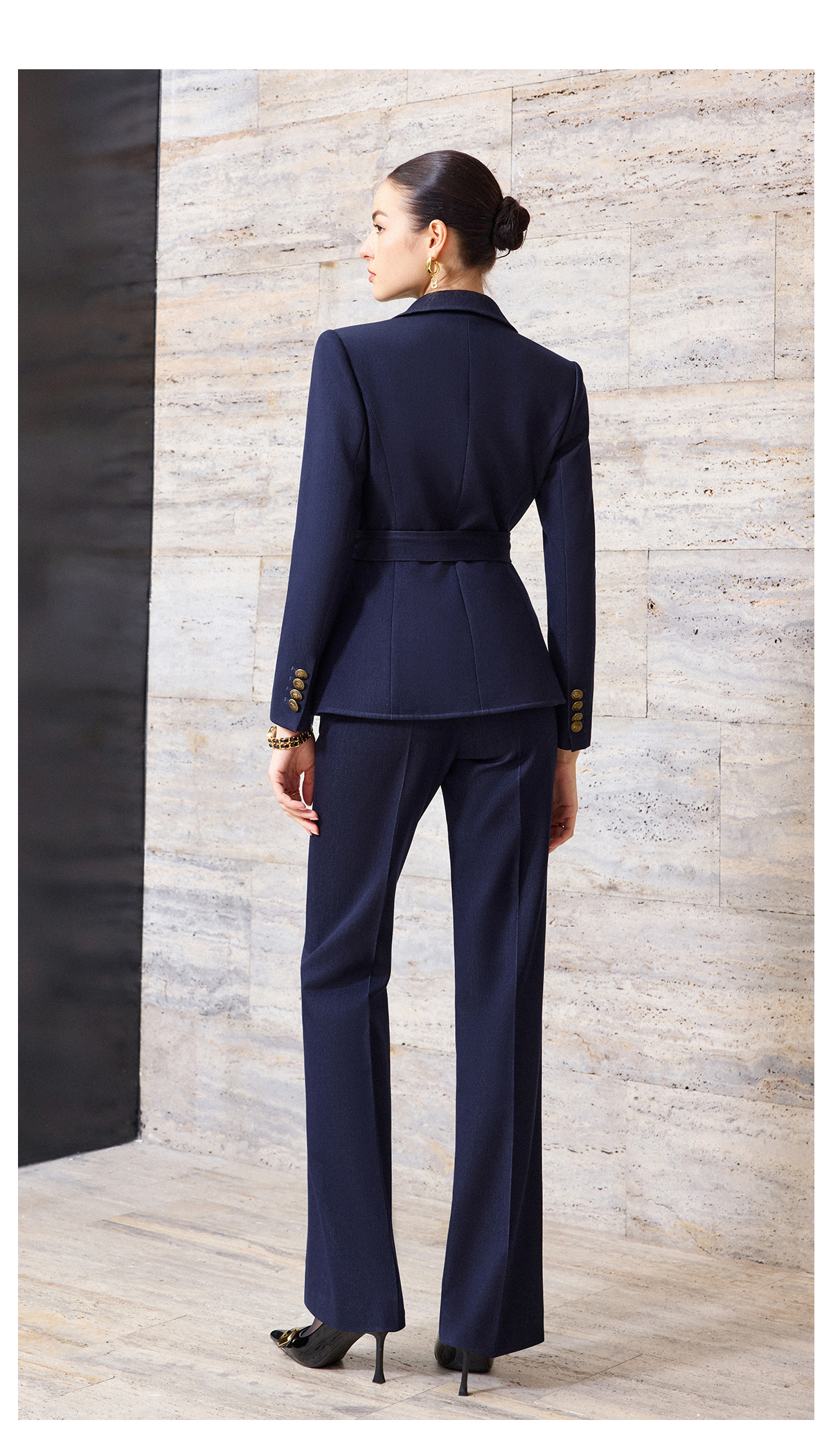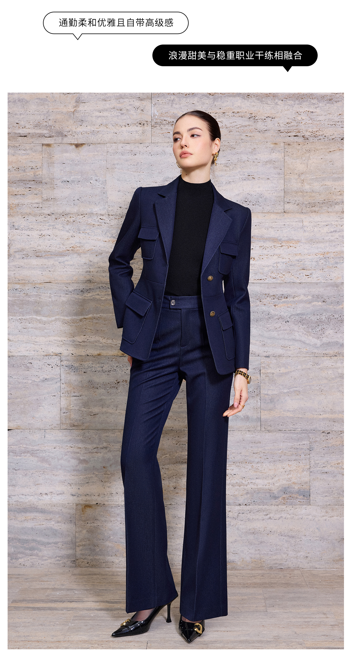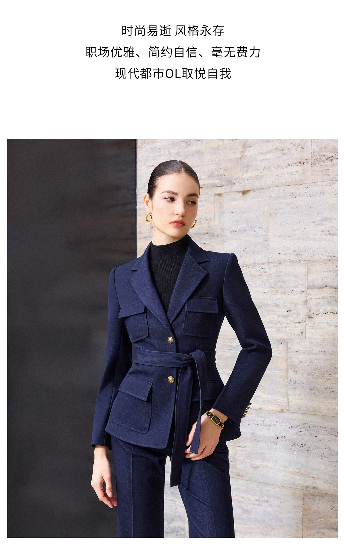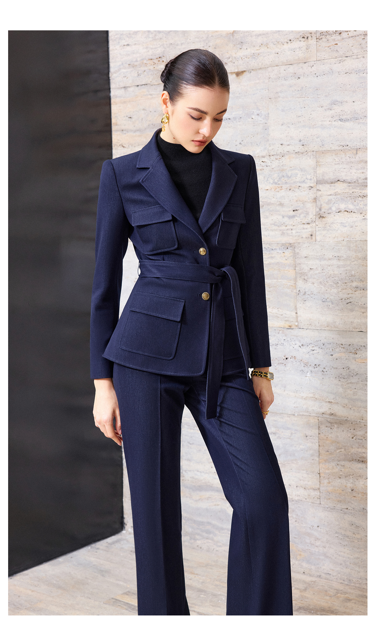 IWY/藏青色高端英伦风系带西装套装秋冬智感蓝调职场气质百搭牛仔蓝西装高腰显瘦直筒裤女CP2558