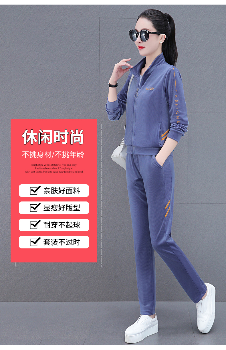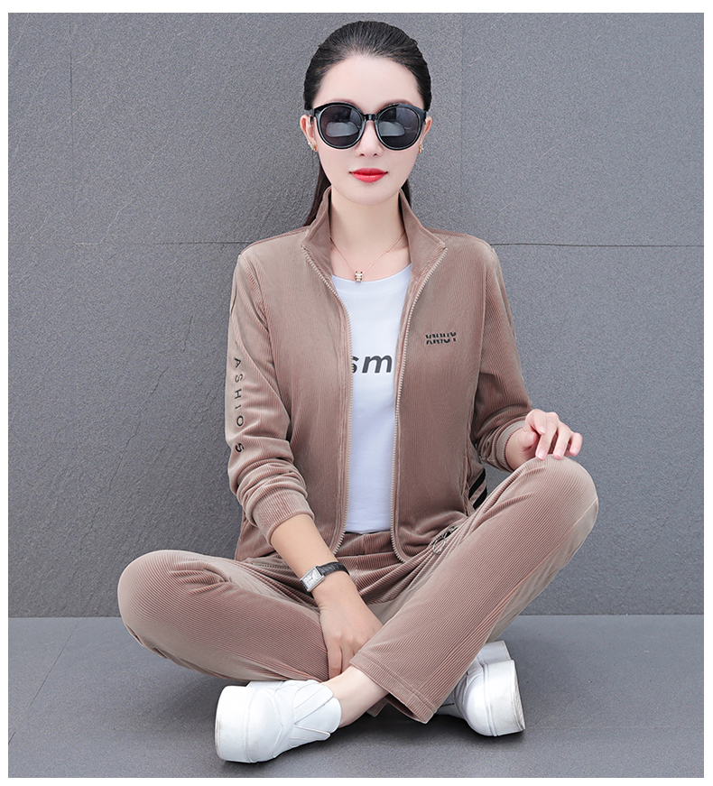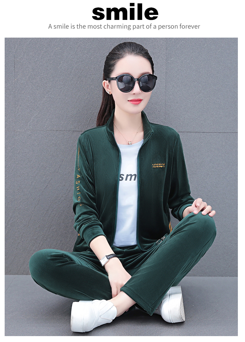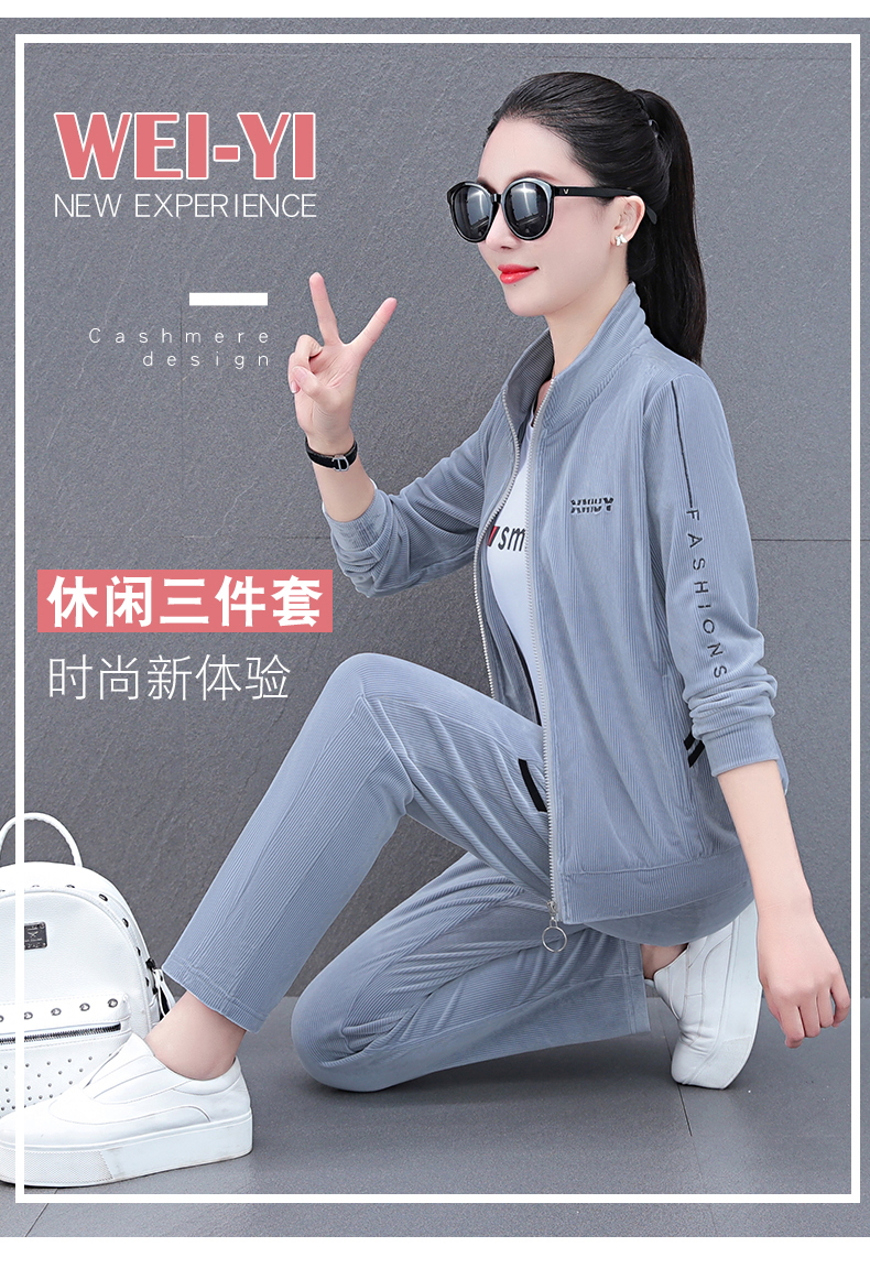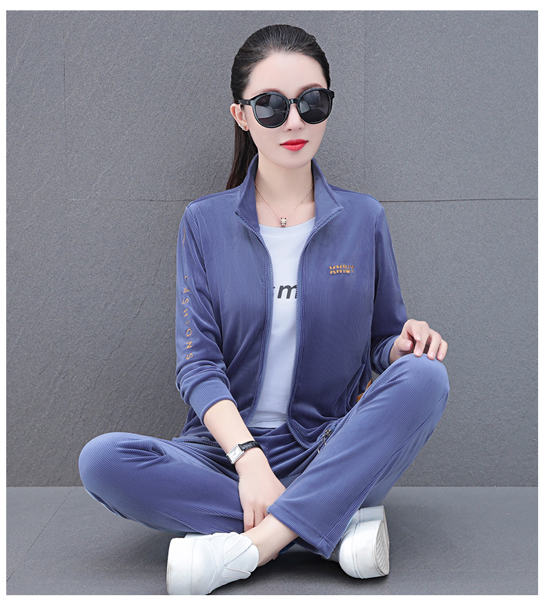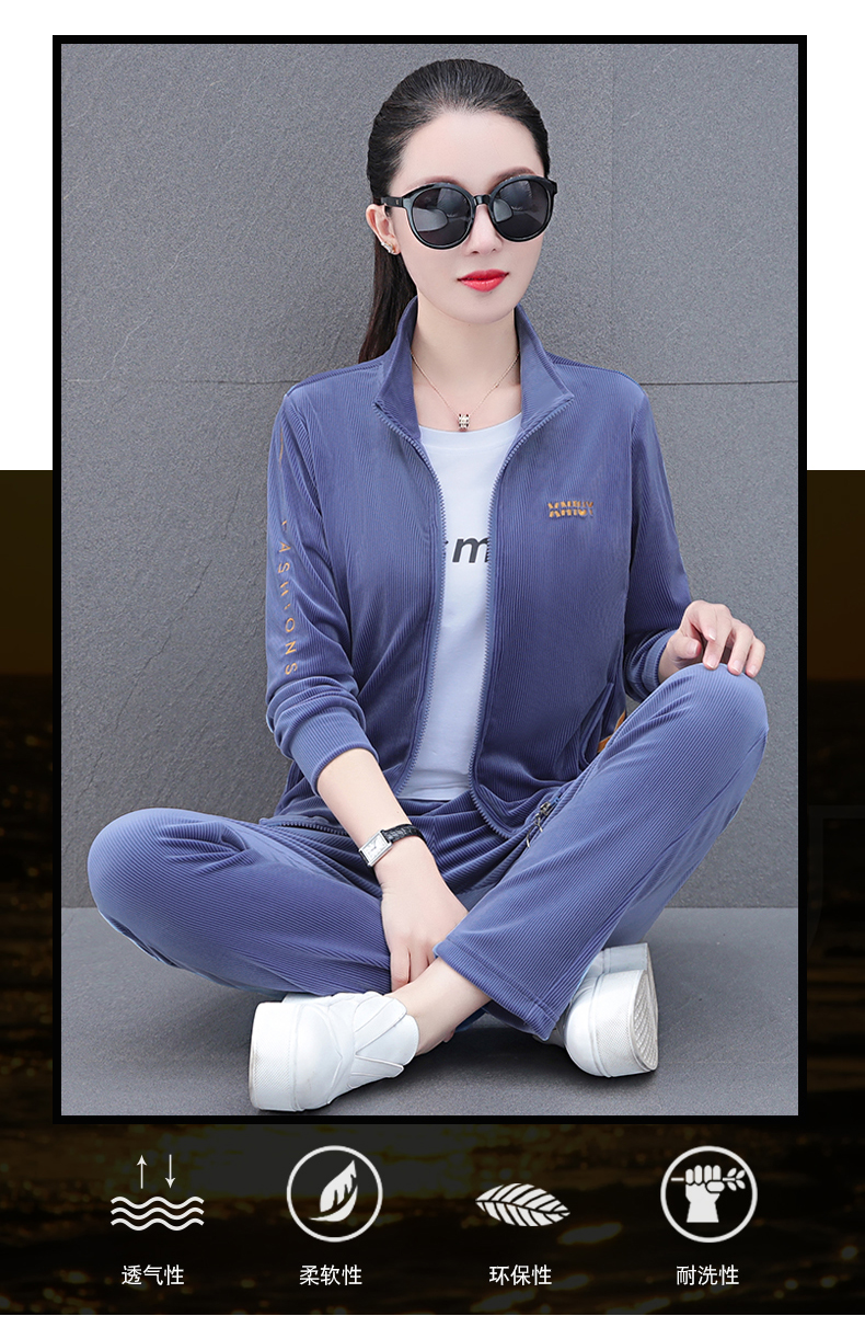 秋季金丝绒套装,新款春秋妈妈时尚跑步宽松立领运动服三件套TR-68861