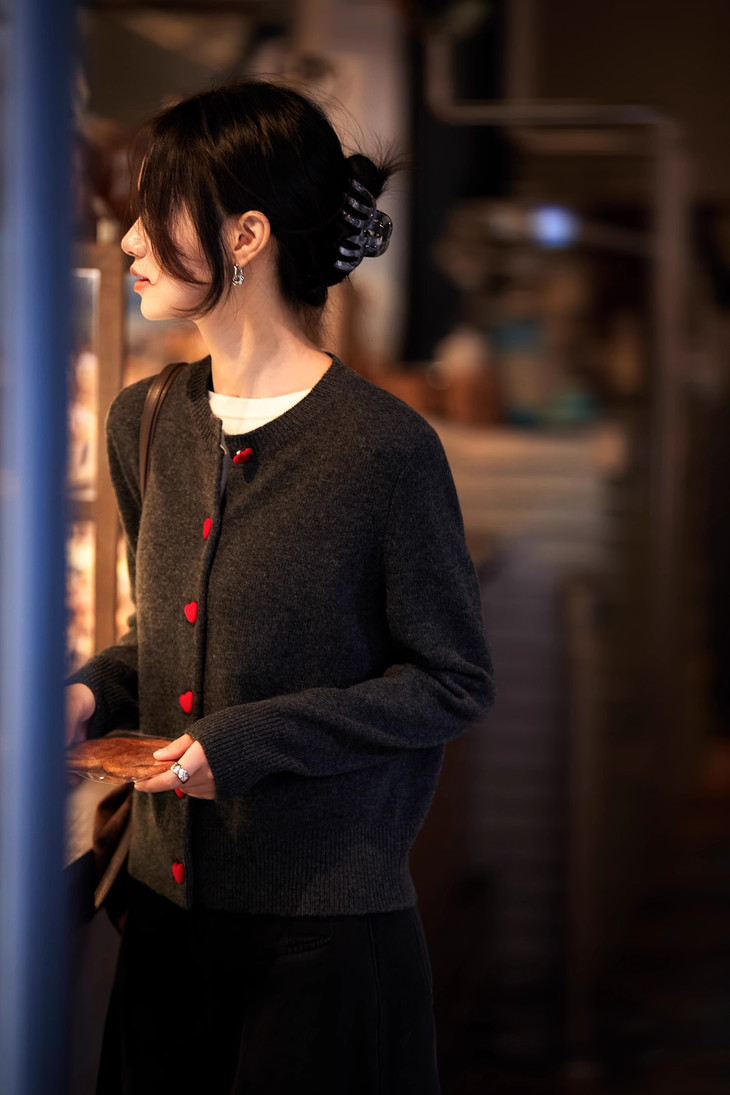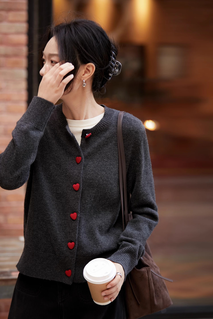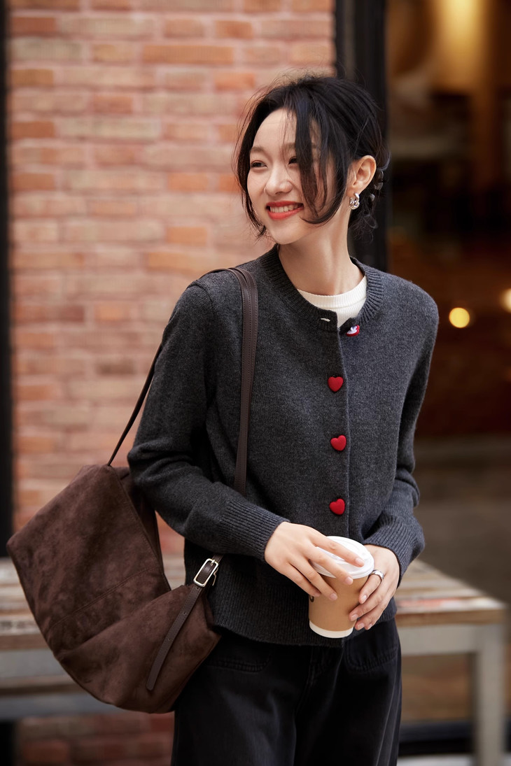 深灰色 爱心纽扣跟深灰色的撞色搭配 上身真的好显瘦好显白!! 搭配裤子妥妥的气质高智感美女 简直不要太爱了 面料柔软又保暖,贴身穿也巨舒服 属于偏宽松版型,有藏肉肉的效果,不挑身材 轻松的涵养 又有一丝丝的獨立范儿