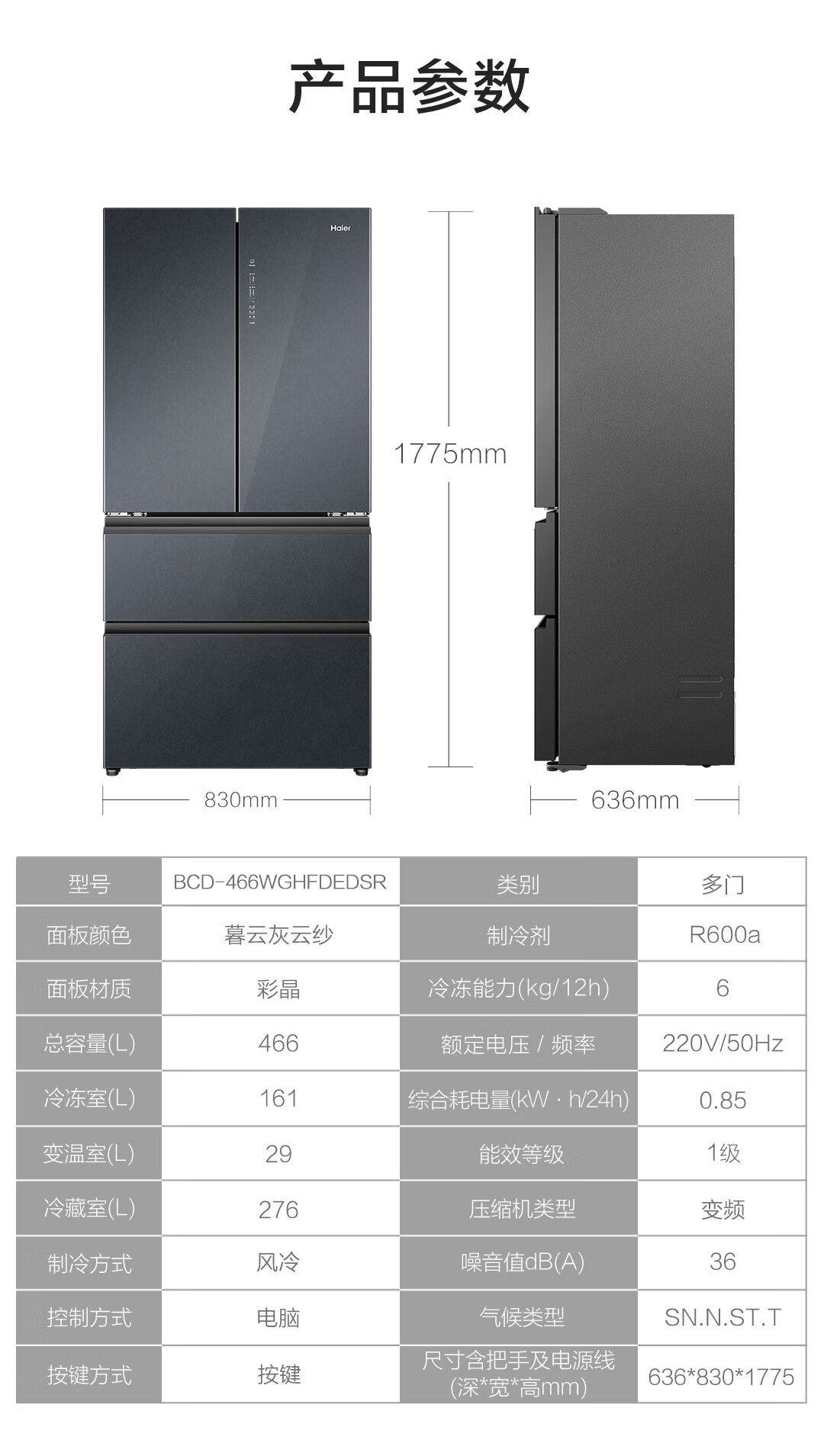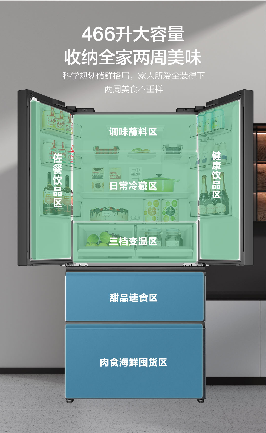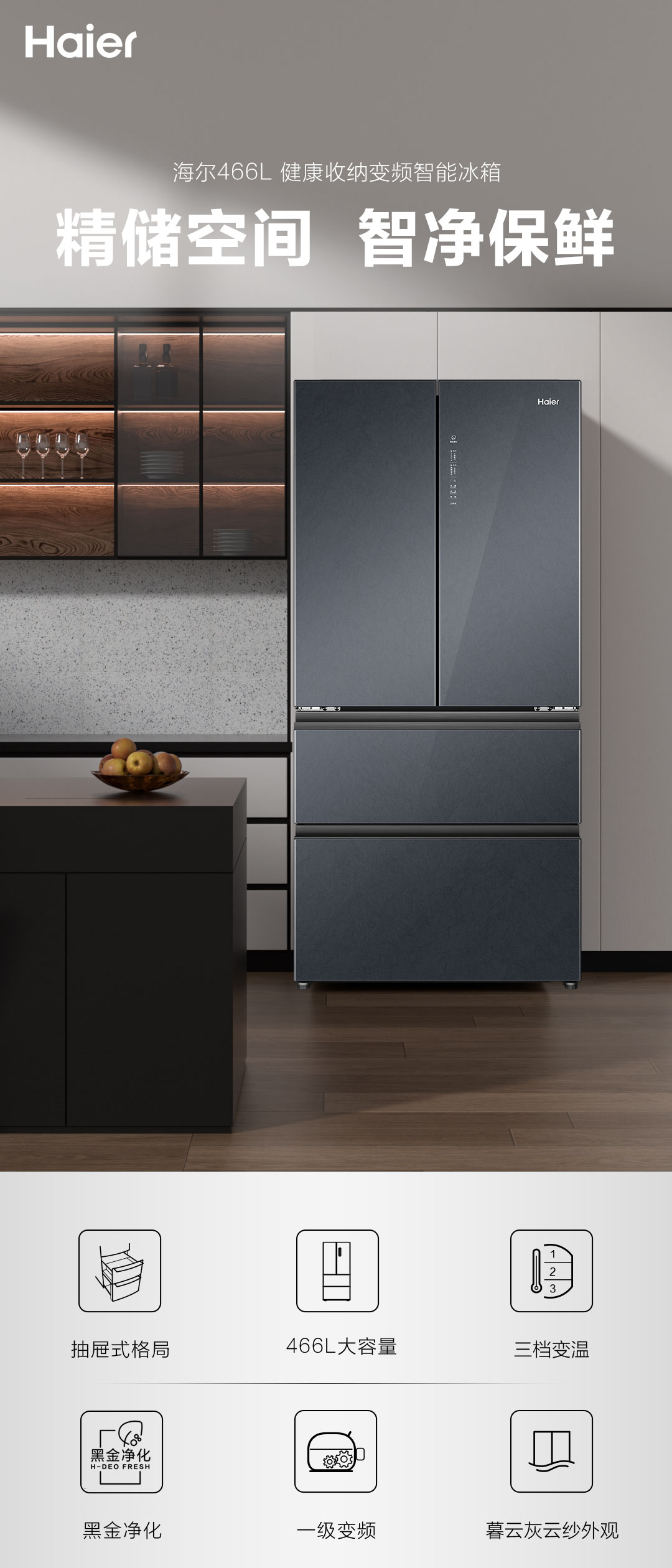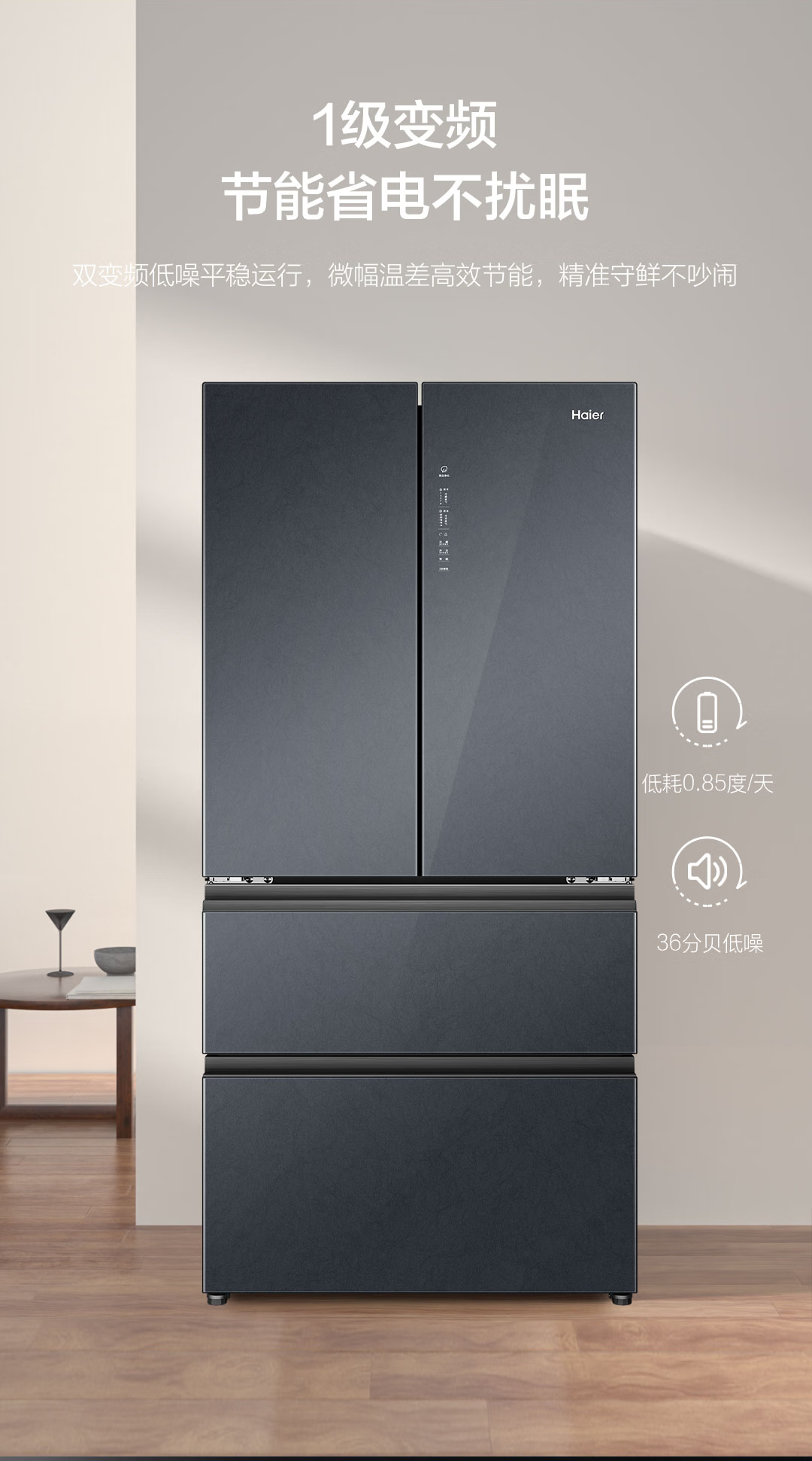 海尔无霜法式多门466升大容量1级节能杀菌净化家用双变频对开门冰箱法式冰箱