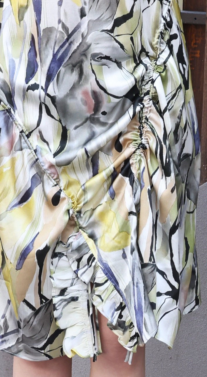 TYNVIE V领褶皱下摆丝质连衣裙 - 黄色印花