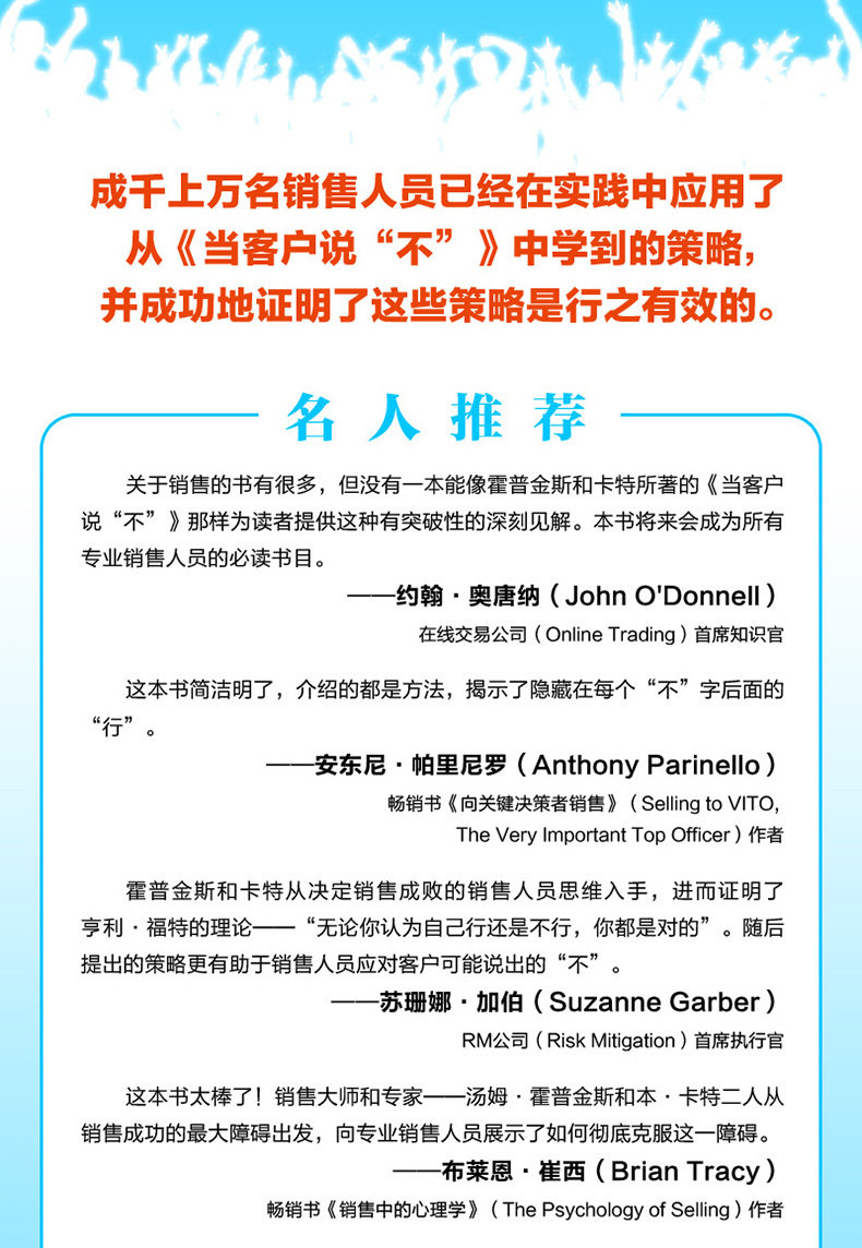 "关于销售的书有很多,但没有一本能像霍普金斯和卡特所著的《当客户说“不”》那样为读者提供这种有突破性的深刻见解。本书将来会成为所有专业销售人员的必读书目。