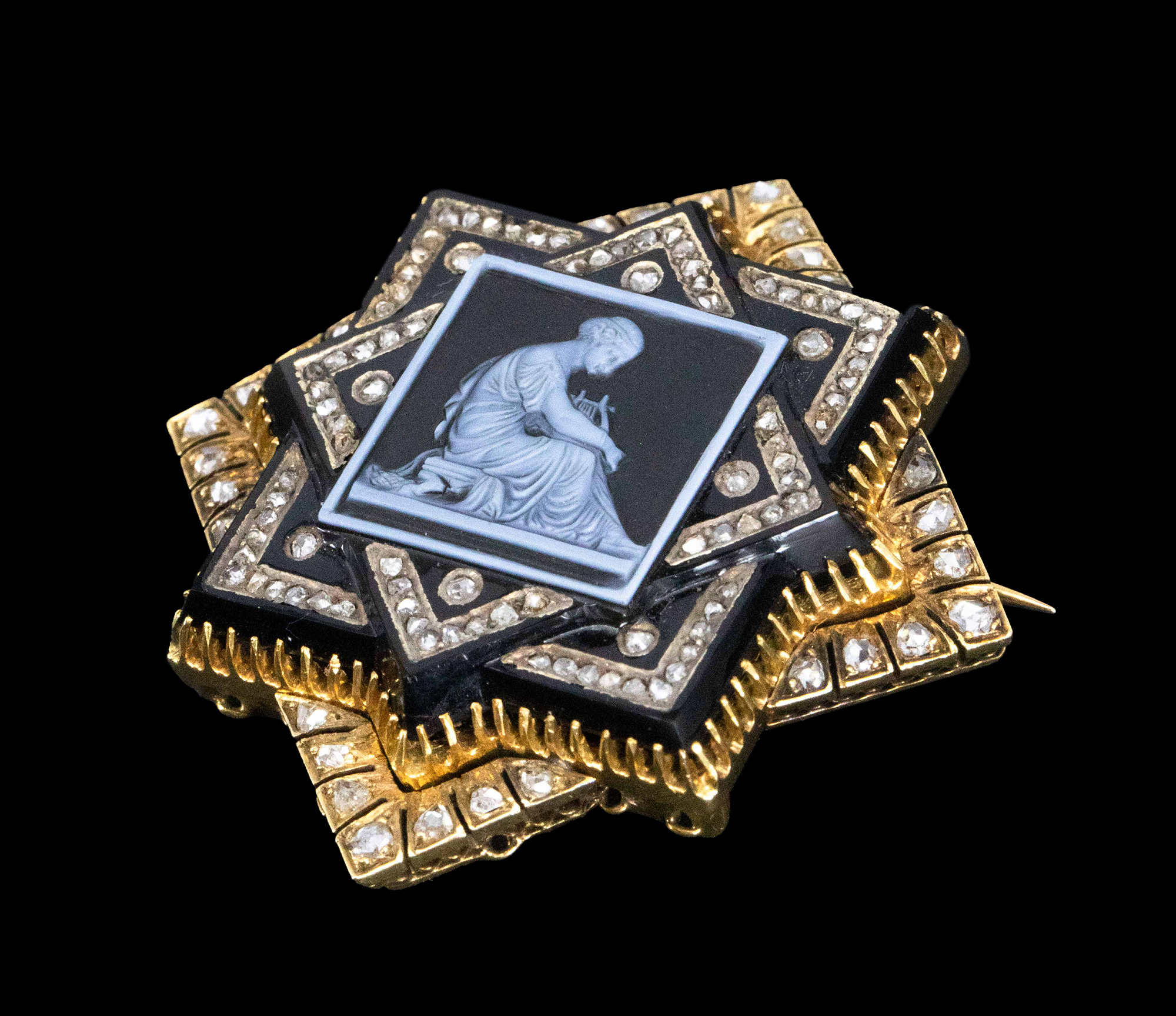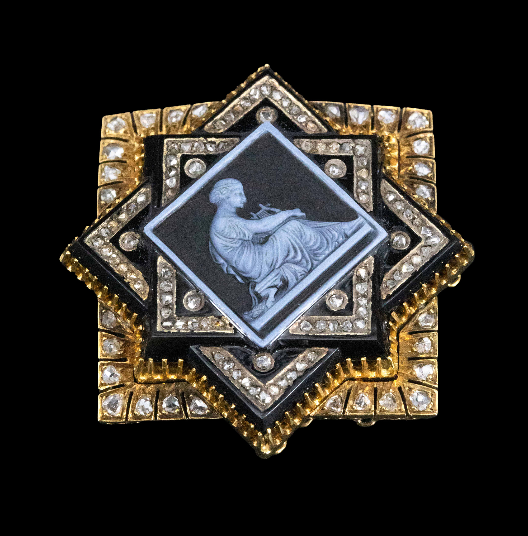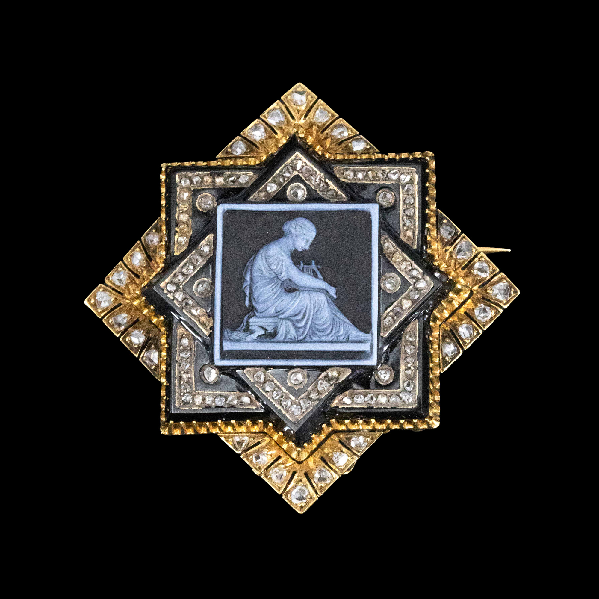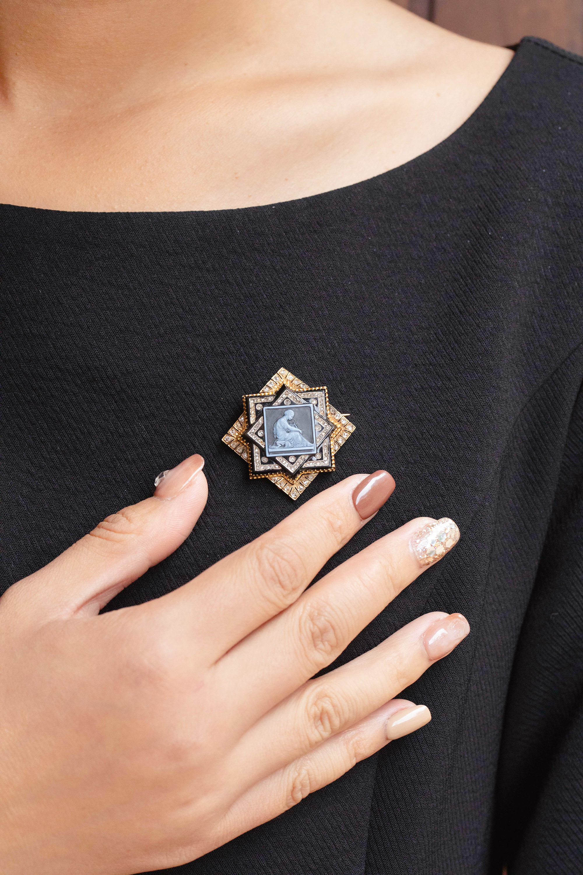 1850-1870年代法国拿破仑三世时期出品18K黄金镶嵌钻石及古典人物主题卡梅奥缟玛瑙浮雕胸针
