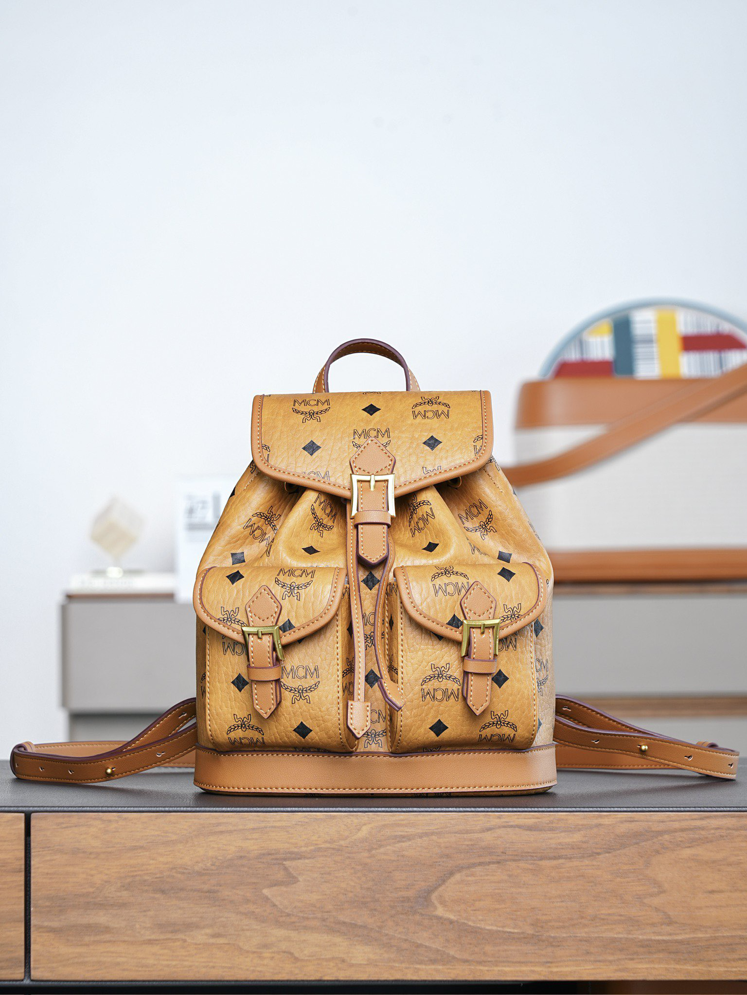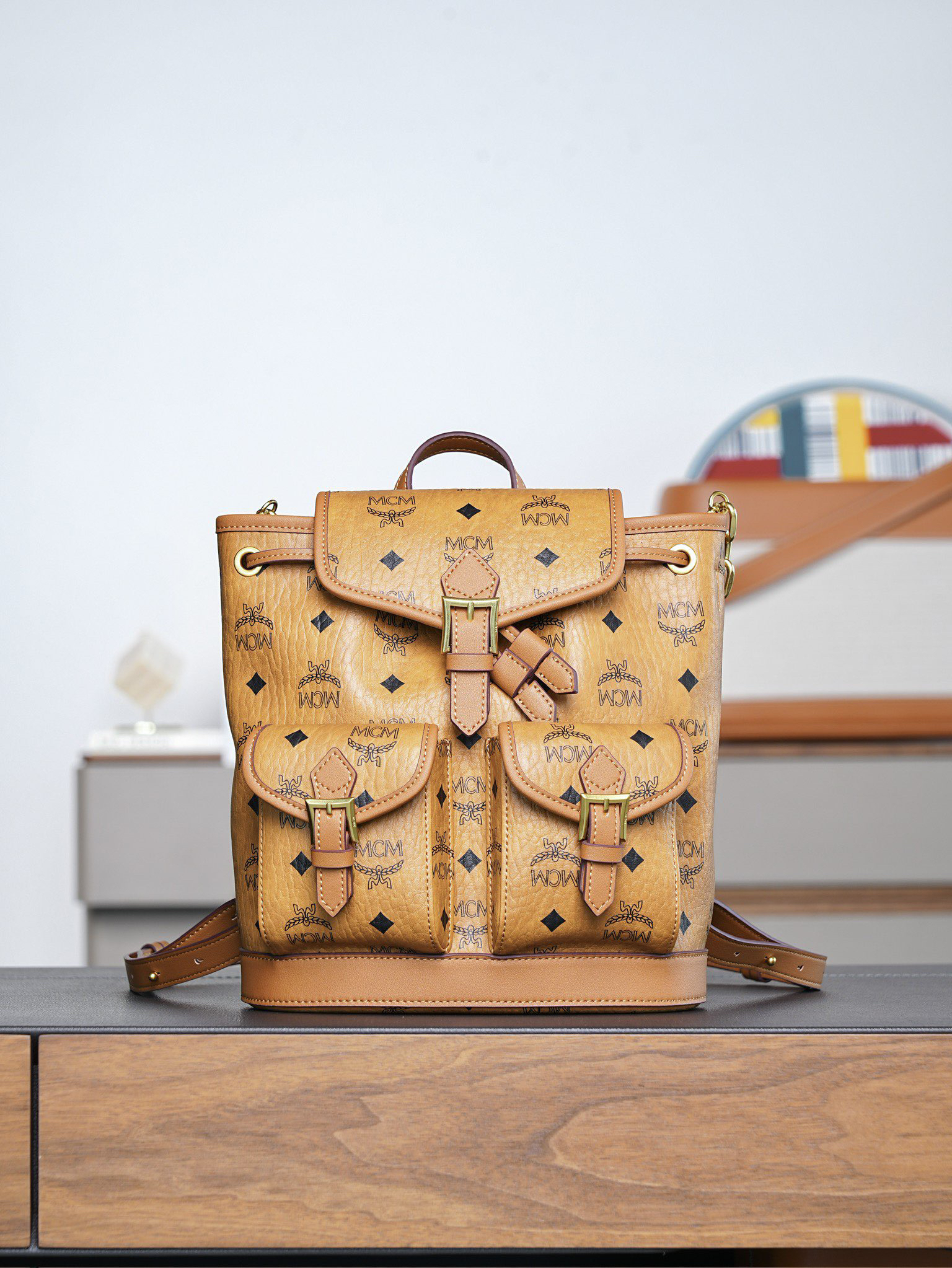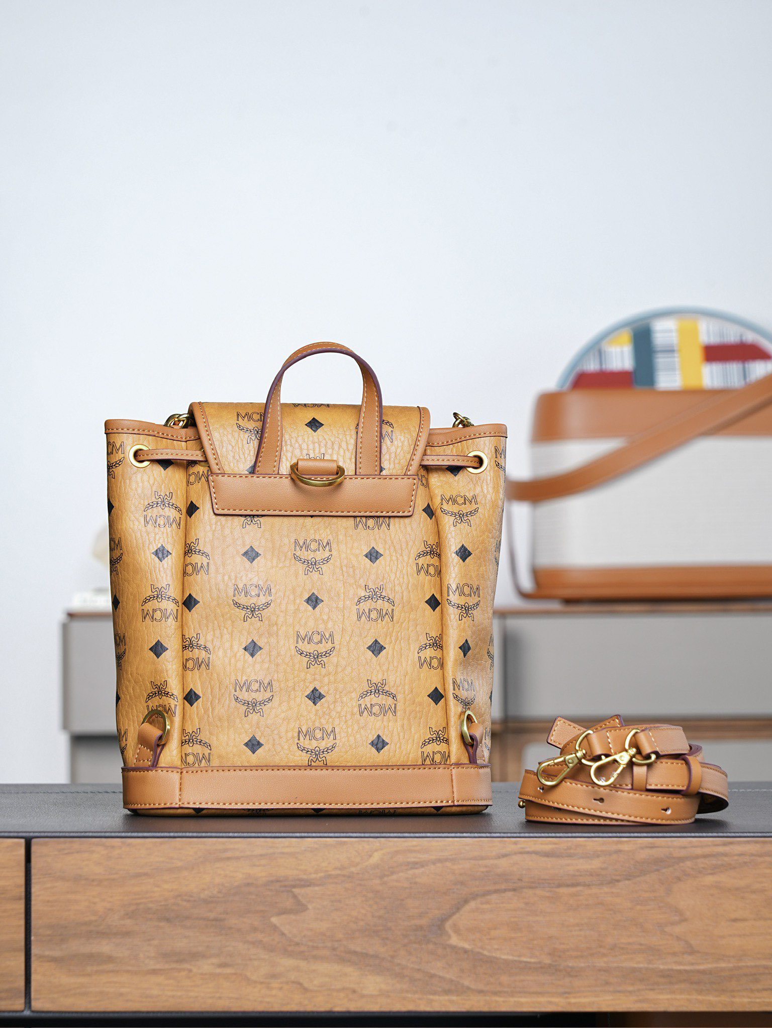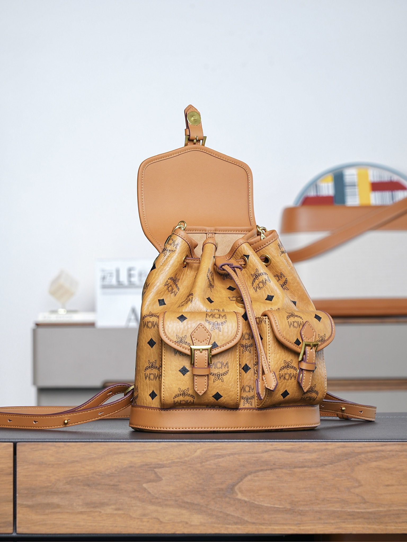 秋冬特惠💰850 原单MCM 原厂皮 干邑色Mini迷你抽绳双肩背包MWKFATA02CO001 干邑色 这款Visetos经典花纹