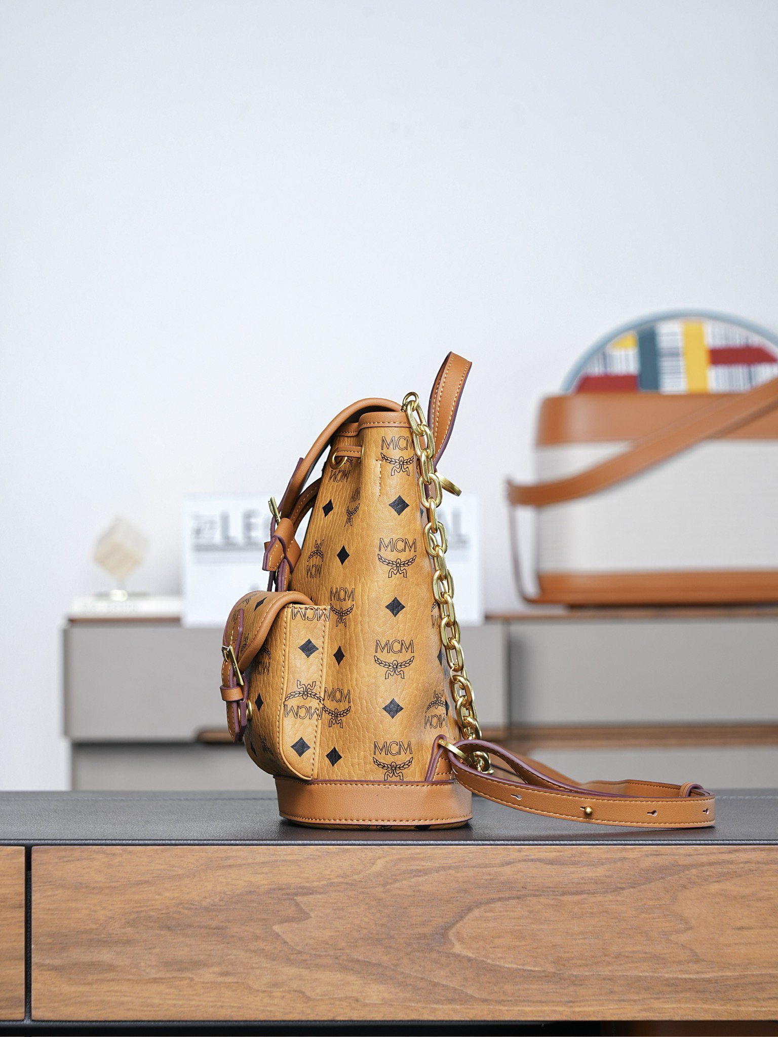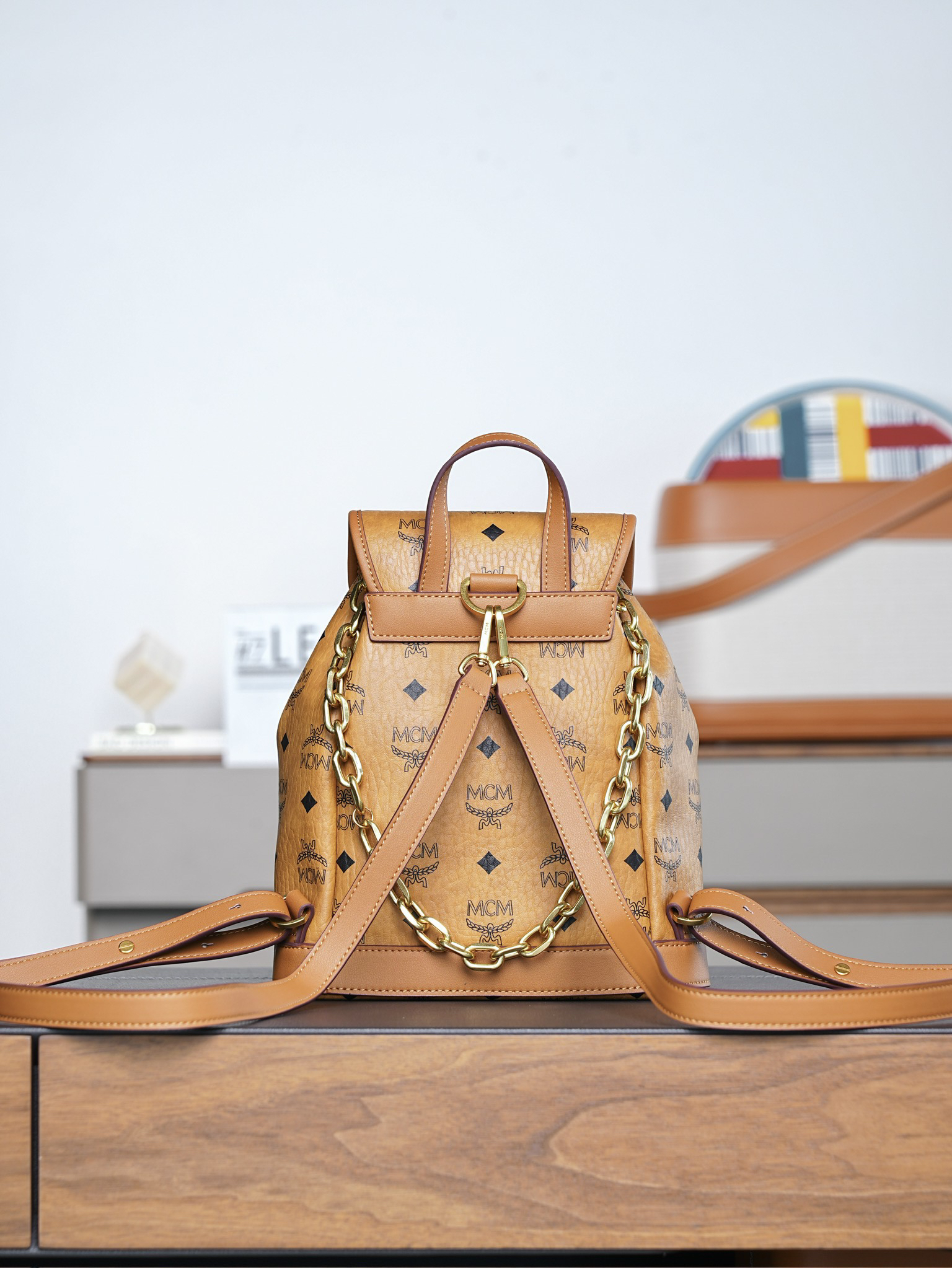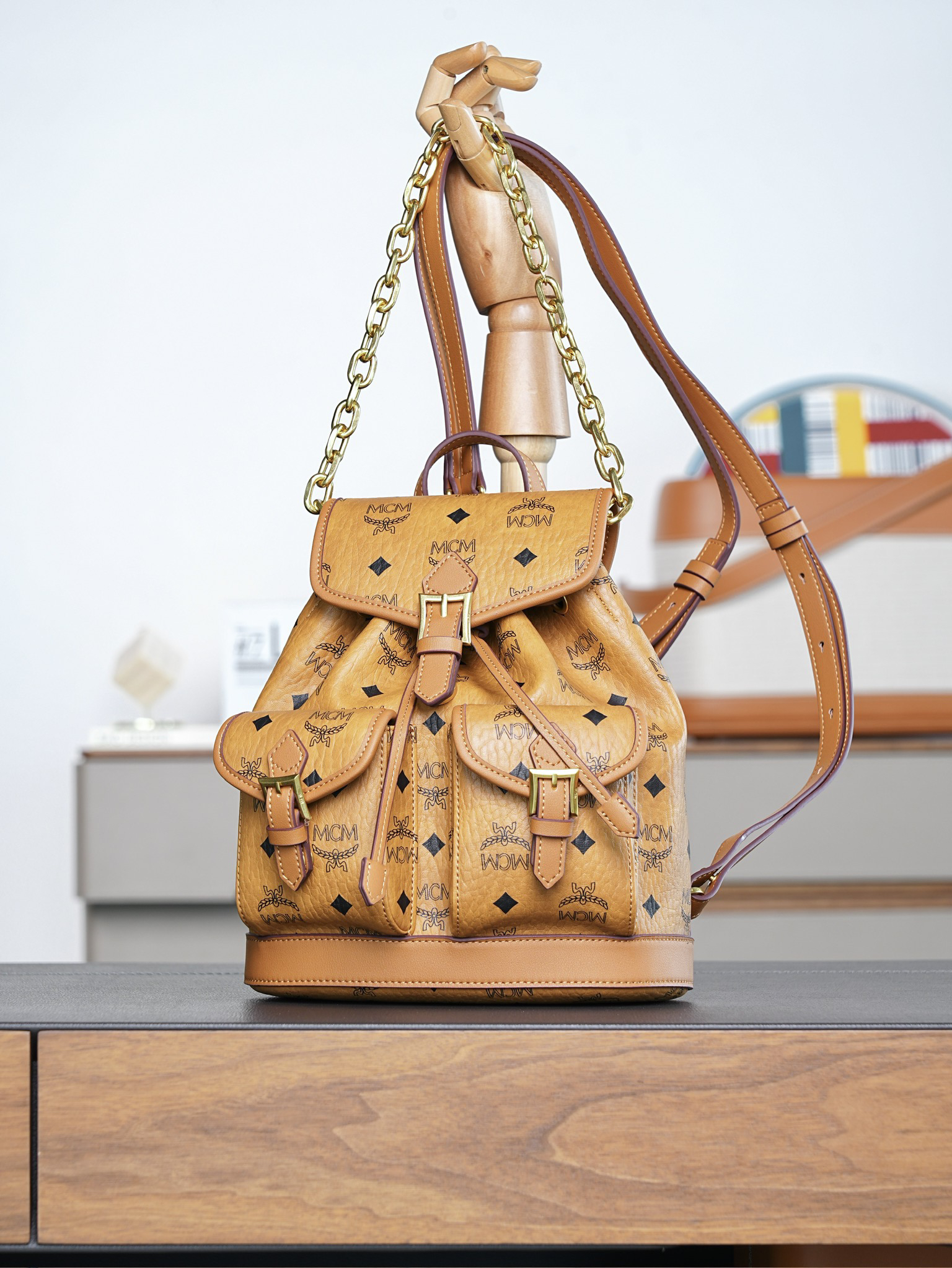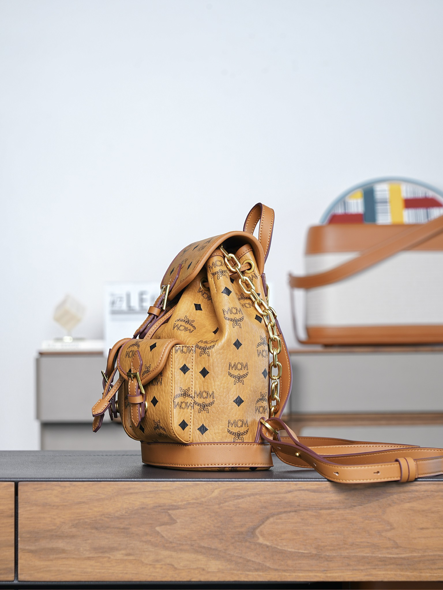 秋冬特惠💰850 原单MCM 原厂皮 干邑色Mini迷你抽绳双肩背包MWKFATA02CO001 干邑色 这款Visetos经典花纹