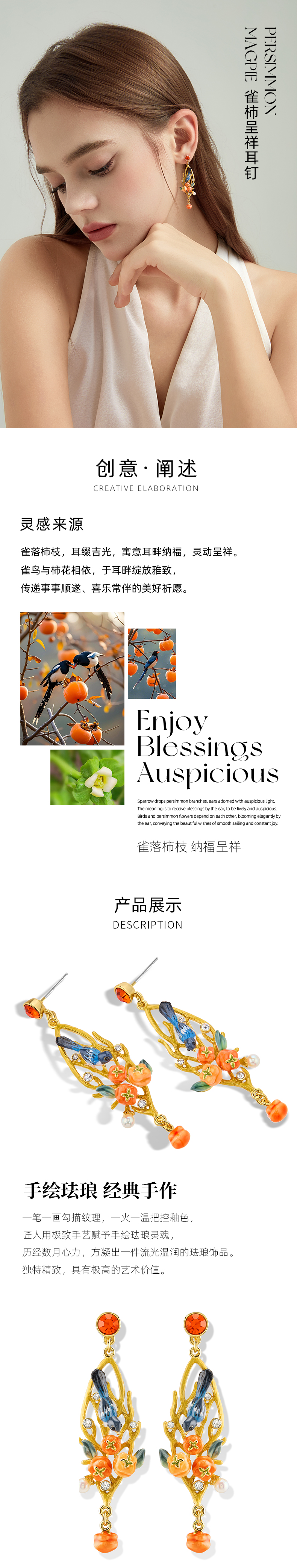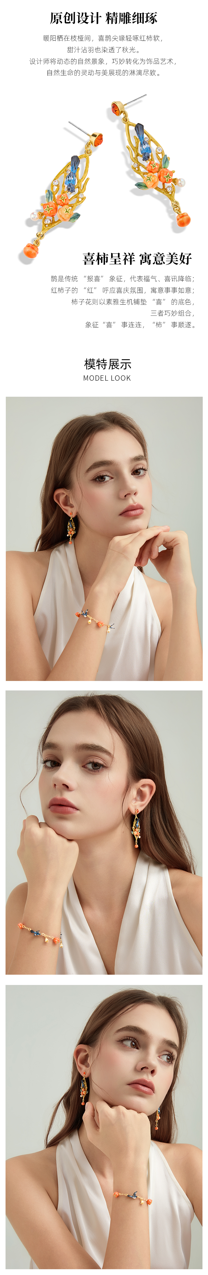 Juicy Grape首饰套装轻奢小众珐琅项链手链耳环戒指新年生日礼物 雀柿呈祥-喜上枝头耳环