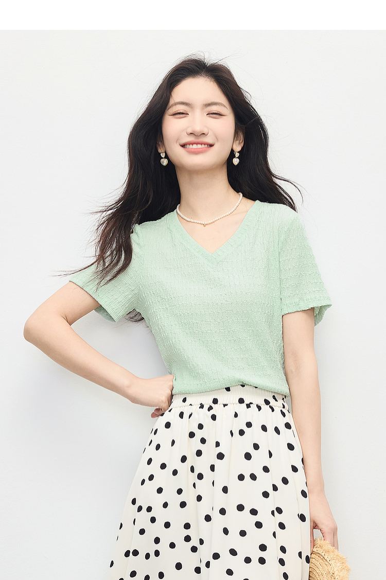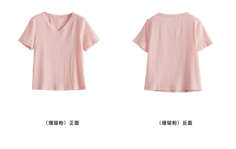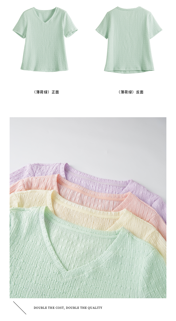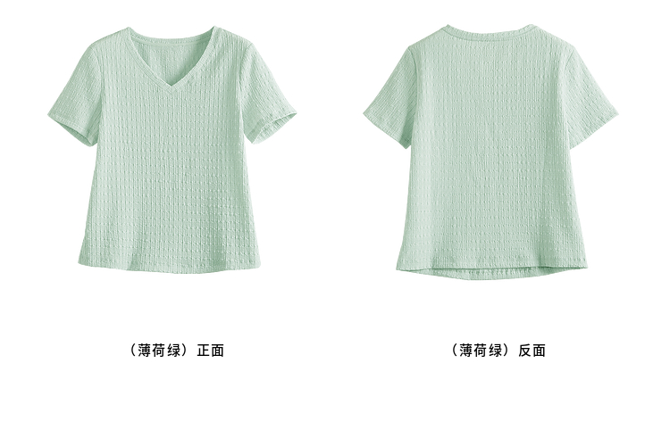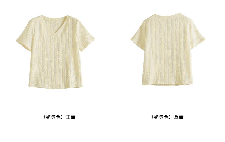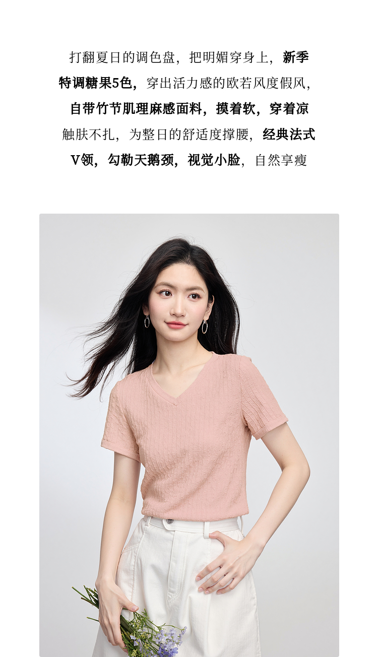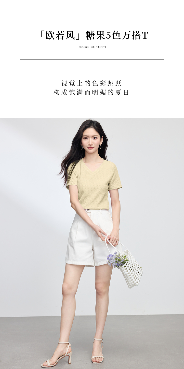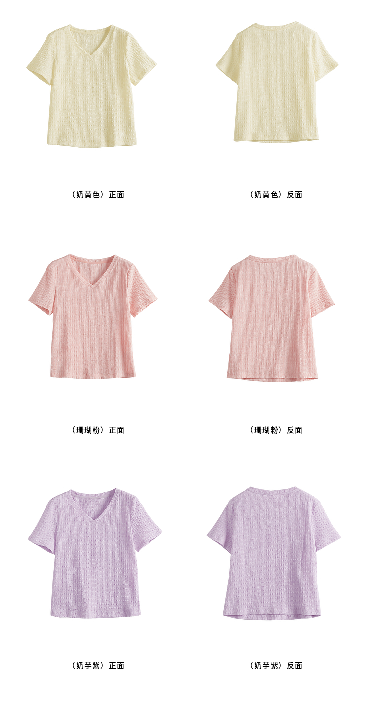 【专属特价】熙世界糖果色肌理感短袖T恤女2025夏季新款休闲气质正肩V领上衣