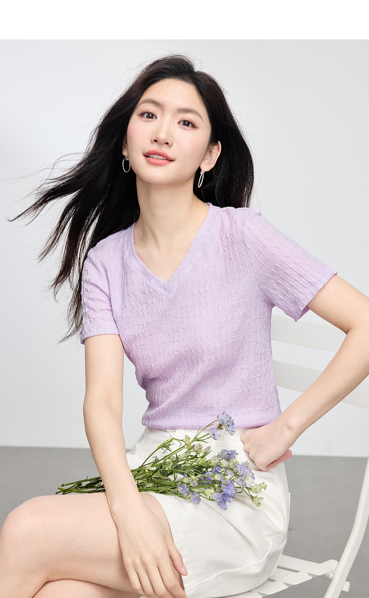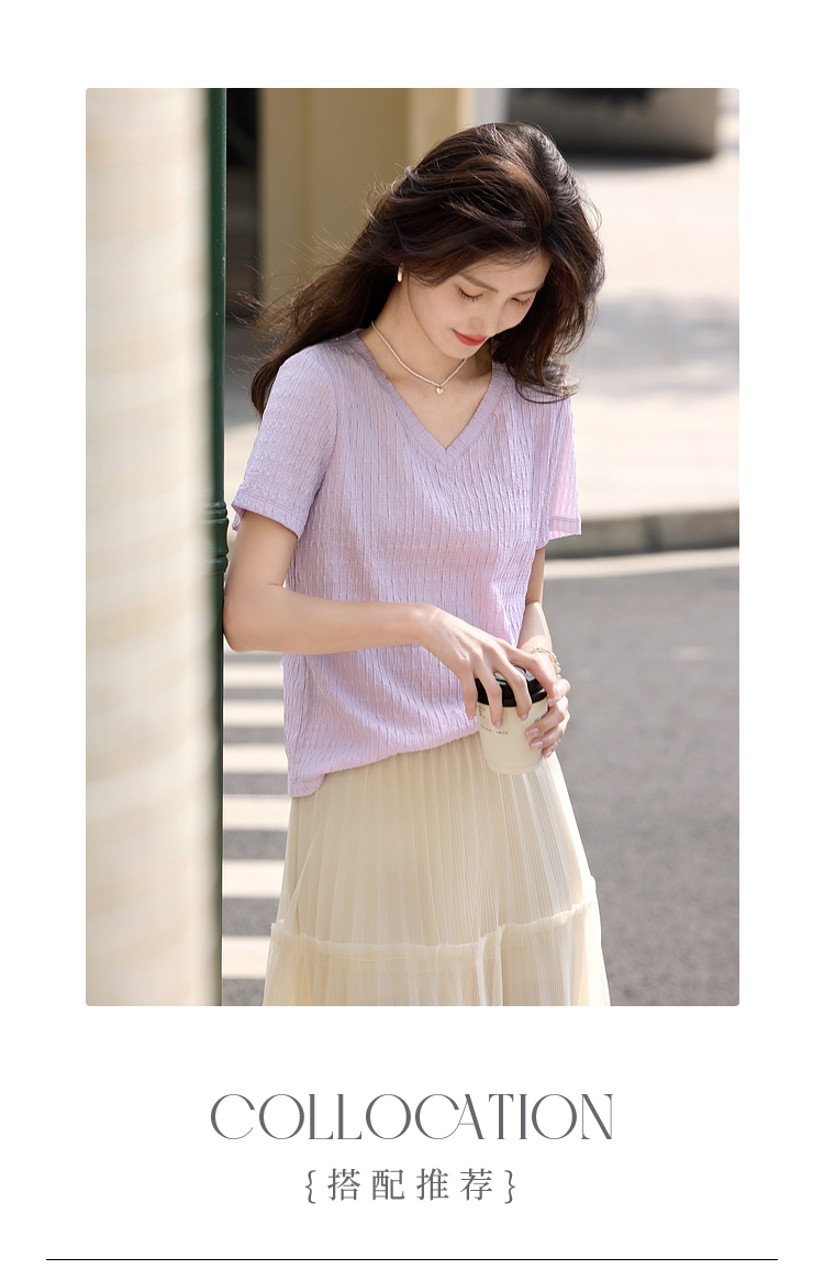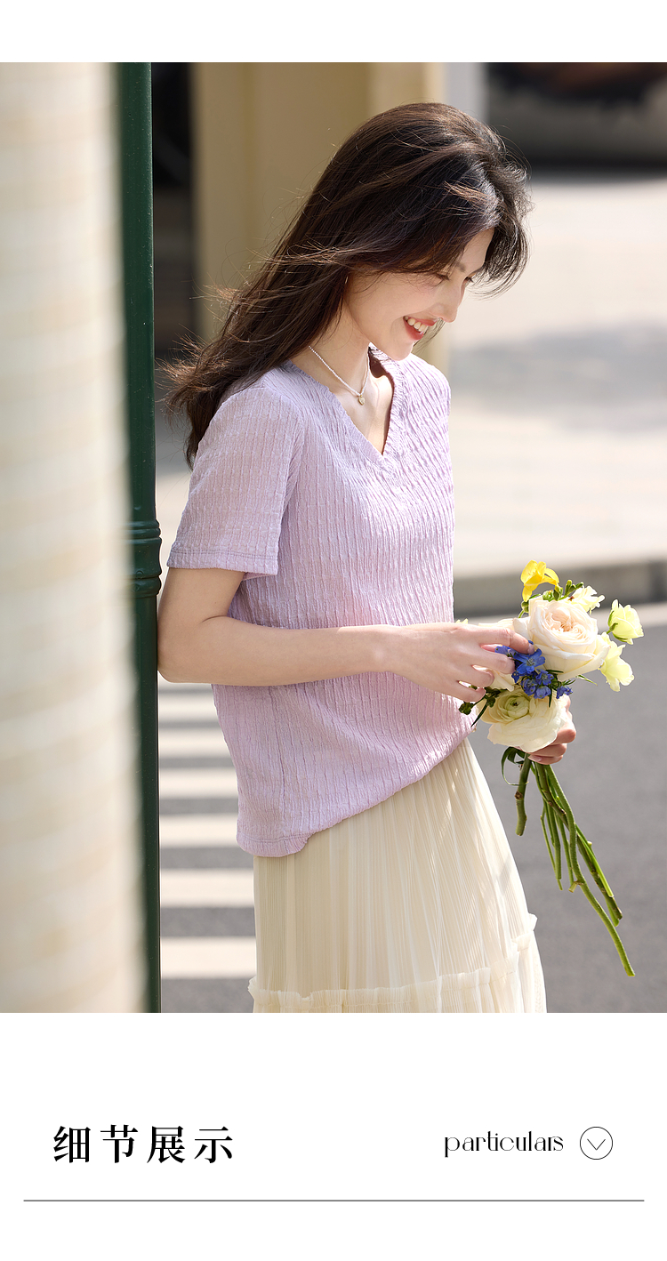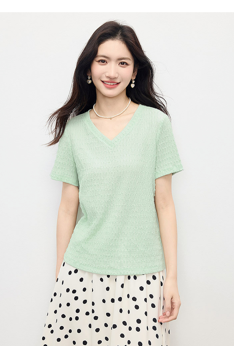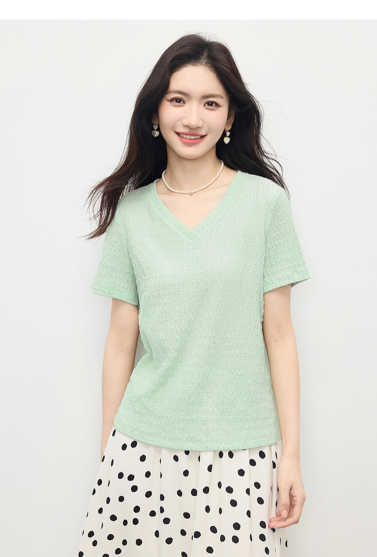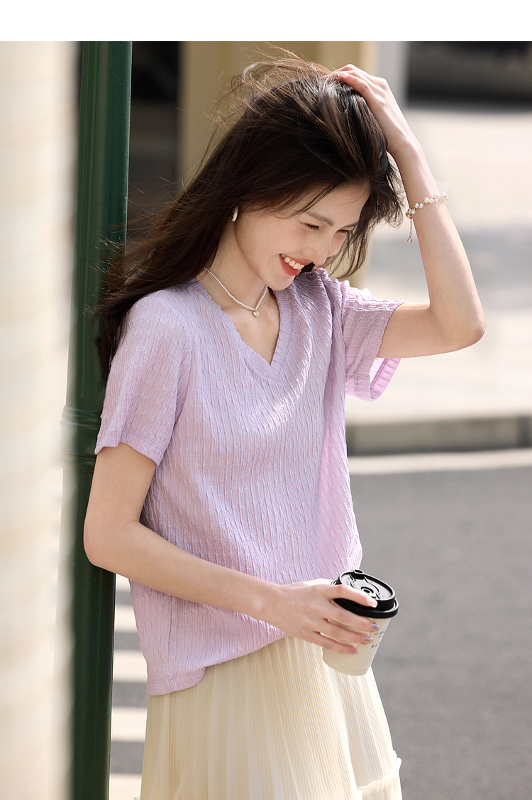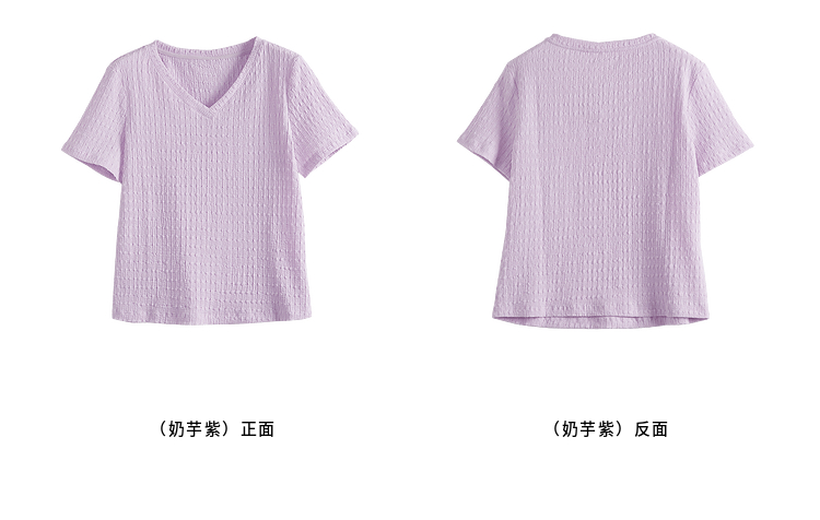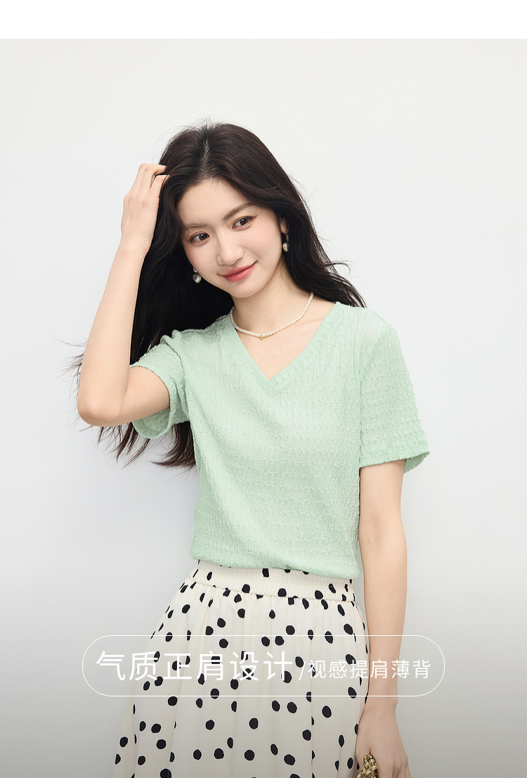 【专属特价】熙世界糖果色肌理感短袖T恤女2025夏季新款休闲气质正肩V领上衣
