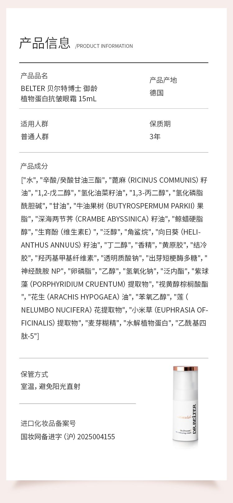 【特卖】DR.BELTER 贝尔特博士 御龄植物蛋白抗皱眼霜 15mL 德国进口 28年到期全新