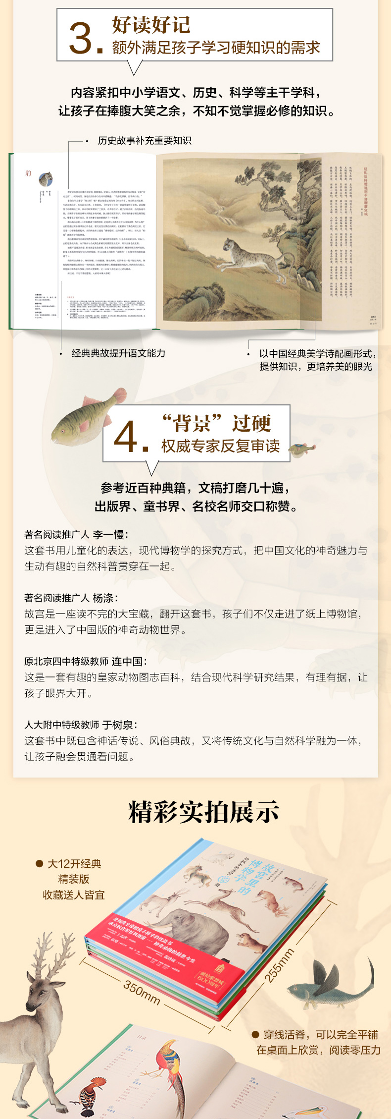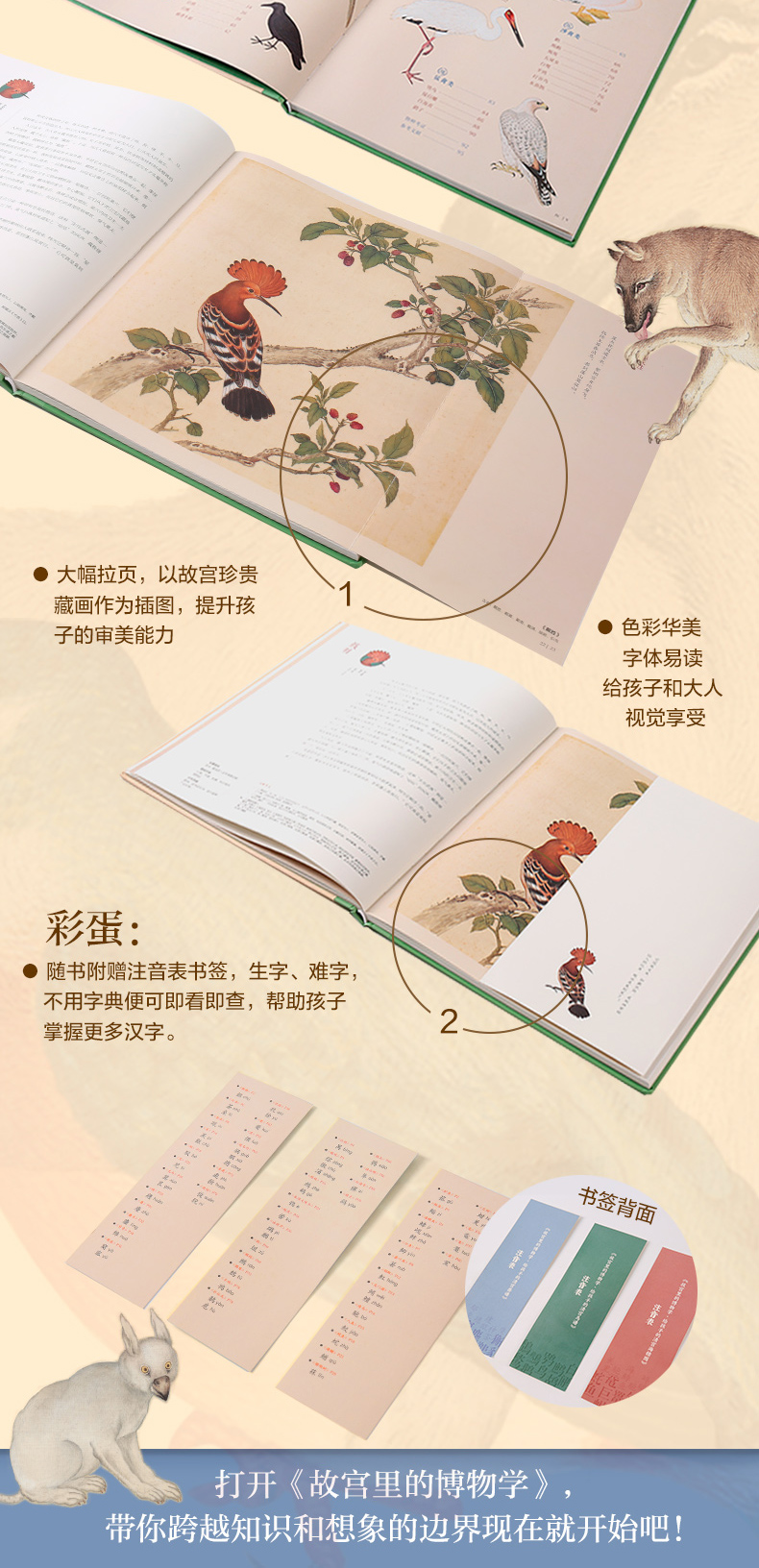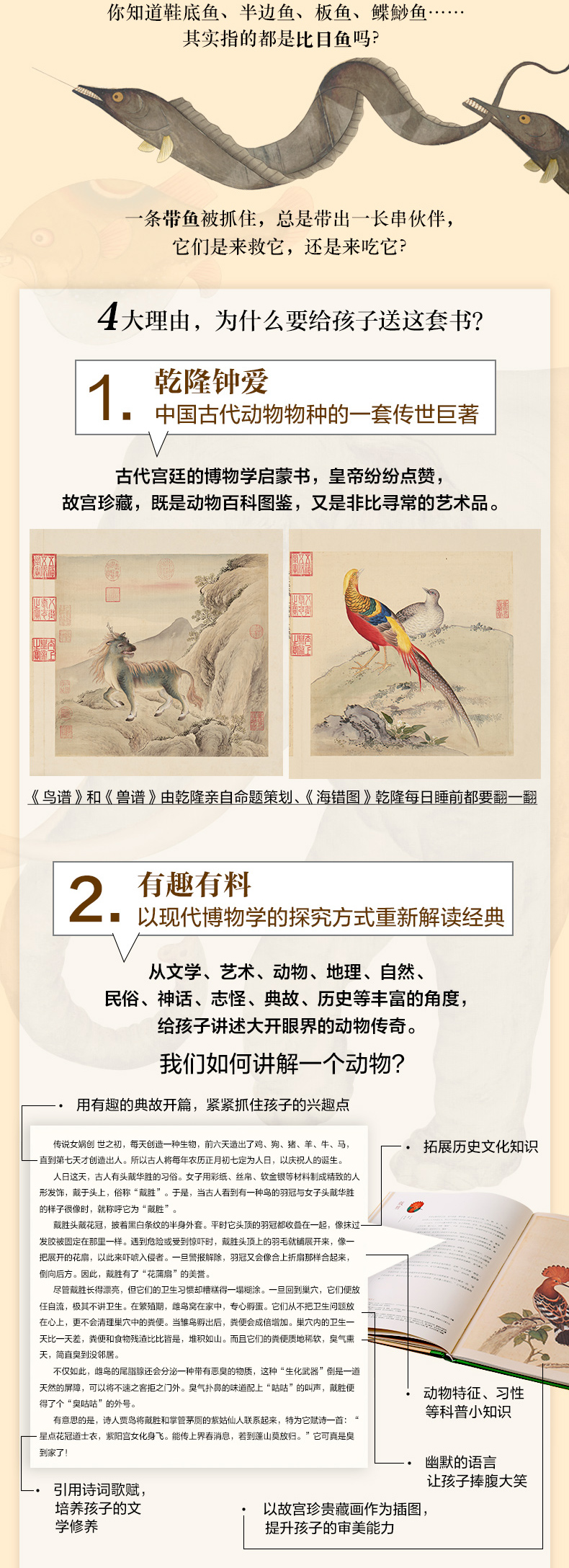 古人说,“博物洽闻,通达古今”,这恰好就是这套《故宫里的博物学》的本意,不仅给孩子讲解动物的特征和习性这些科普知识,更把历史文化知识融入趣味的动物传奇里,有趣有料,充分拓展孩子的视野和想象的边界。——阅读推广人 三川玲