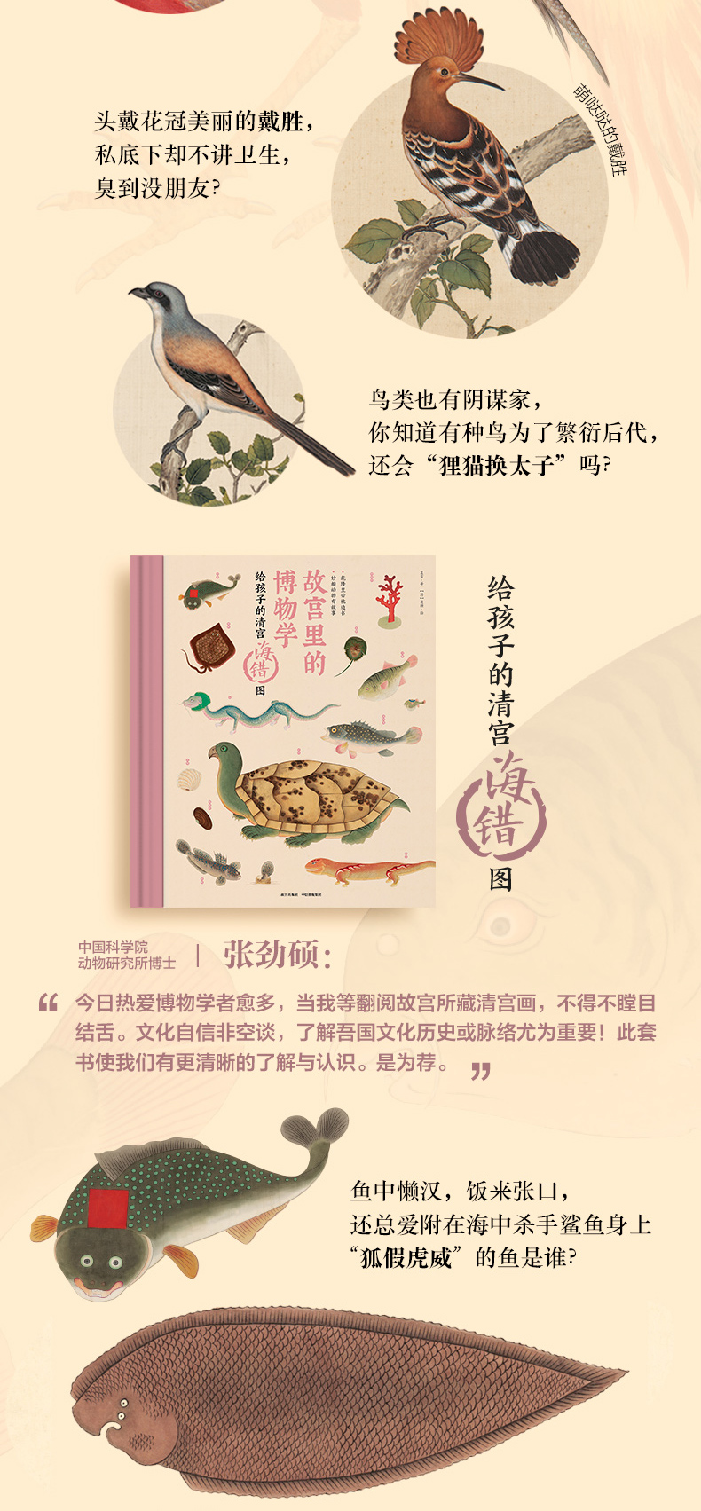 《故宫里的博物学》是专为孩子打造的中华文化通识读本,以清代乾隆时期的皇家动物图鉴《清宫海错图》、《清宫鸟谱》、《清宫兽谱》为蓝本,打破人文与科学的界限,从文学、艺术、动物、地理、自然、民俗、神话、志怪、典故、历史等方面,以现代博物学的探究方式,把波澜壮阔的中华文化与自然科学融会贯通,慢慢讲给孩子听。