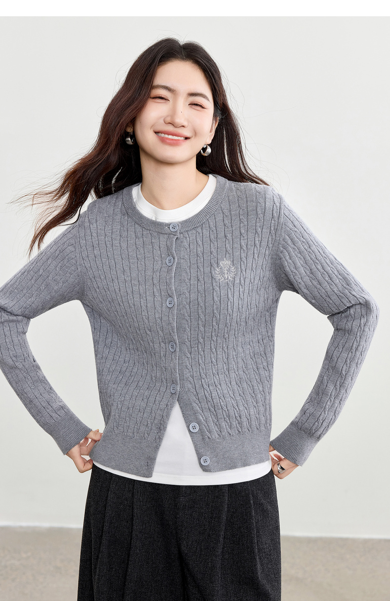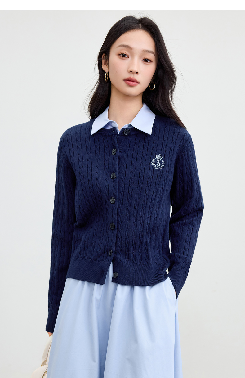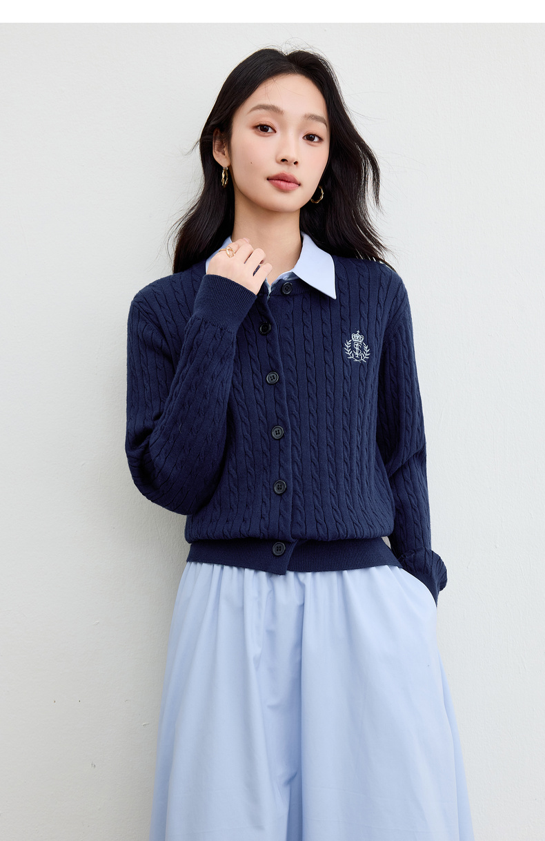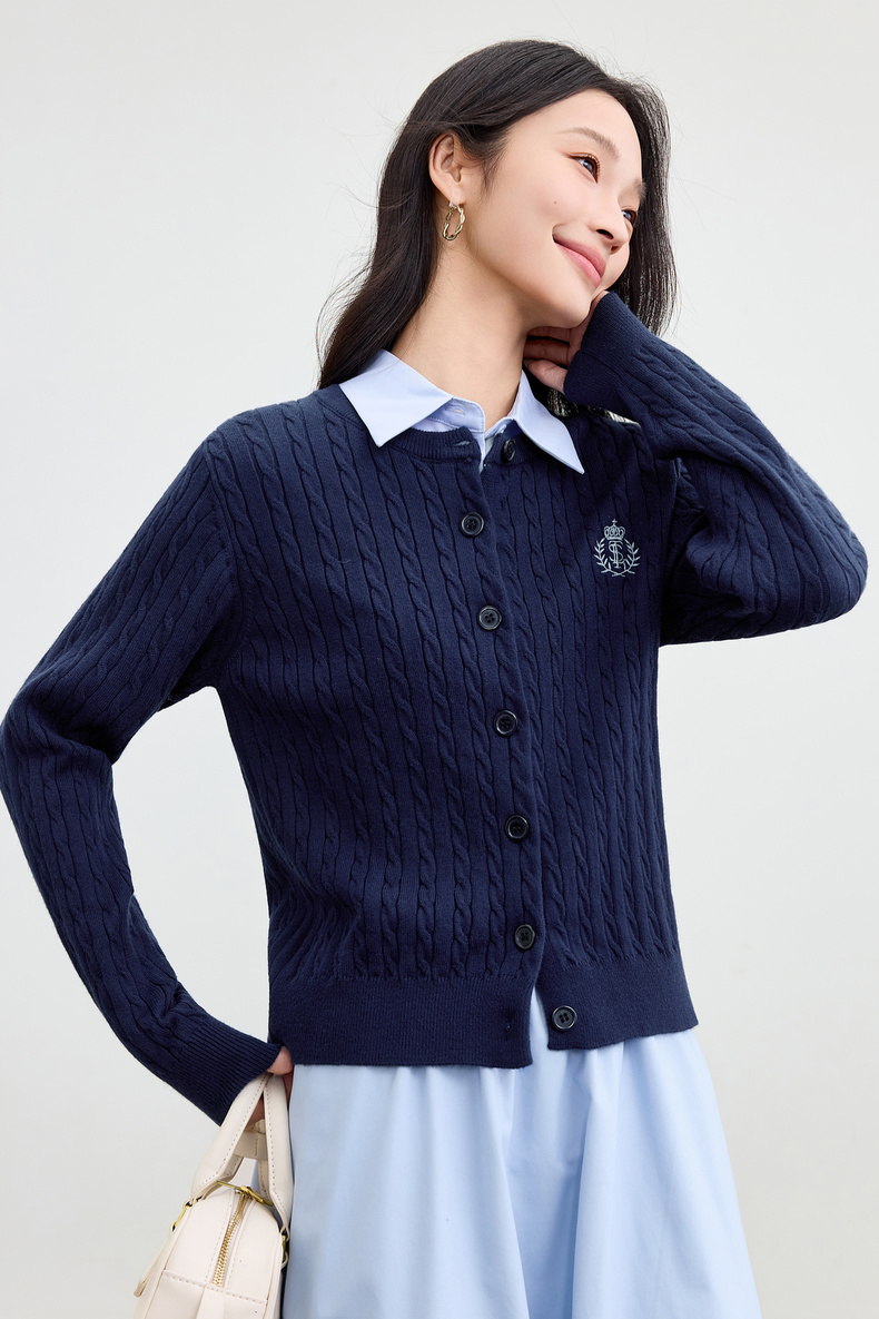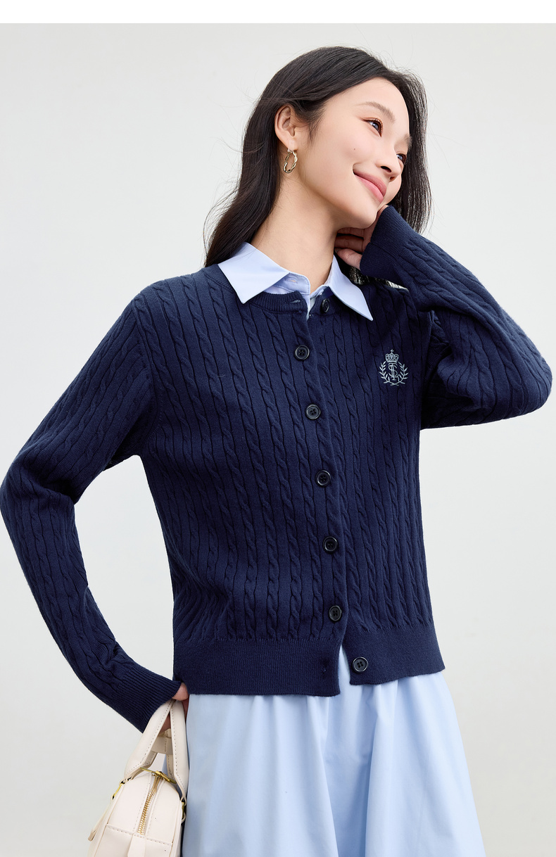 【内购】【厚实保暖】知识分子学院风圆领徽章刺绣麻花肌理弹力开衫毛衣-W53EB2689