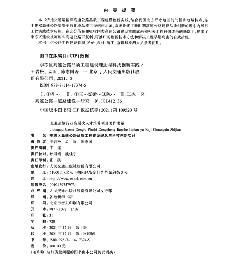 书名:季冻区高速公路品质工程建设理念与科技创新实践