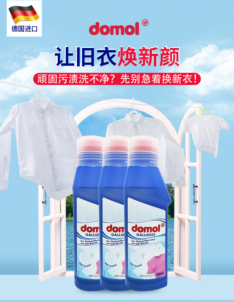【中欧班列精选3瓶】德国衣服皂液 原装进口ROSSMANN/domol衣服皂液衣领/领口/袖口去污去黄袖250ml/瓶