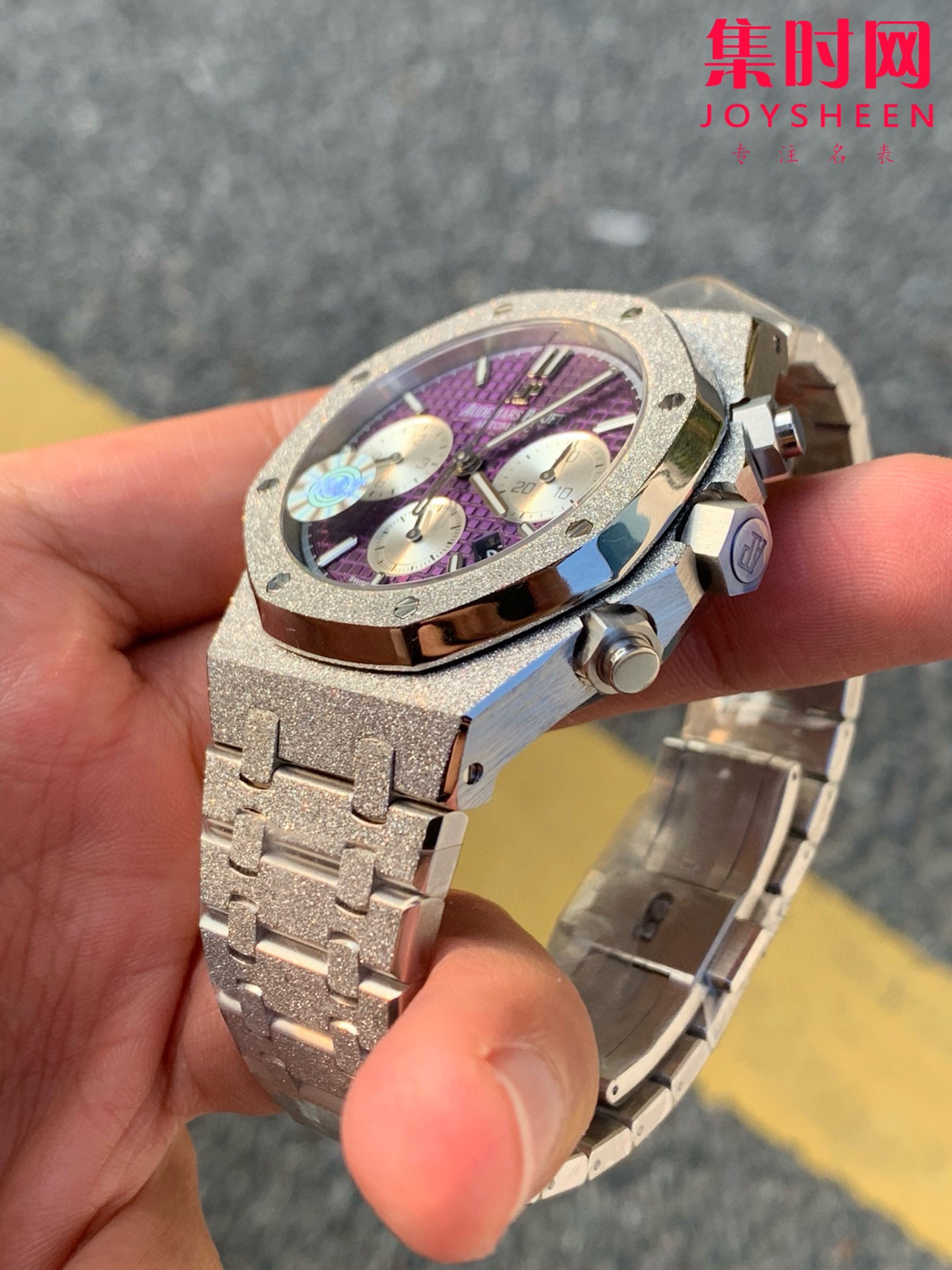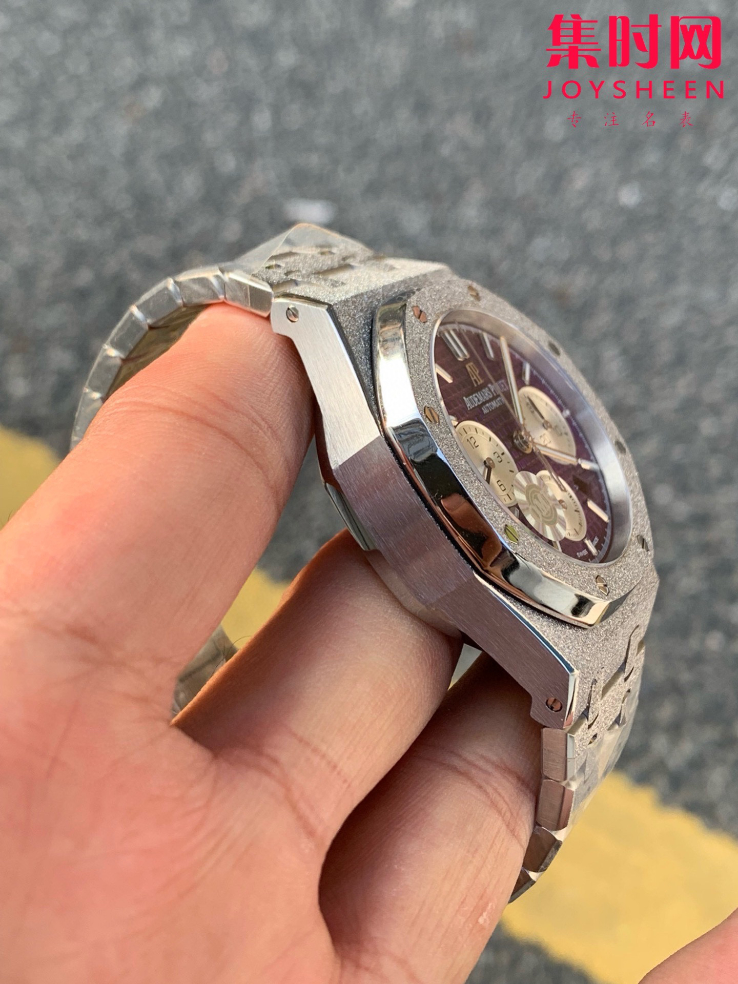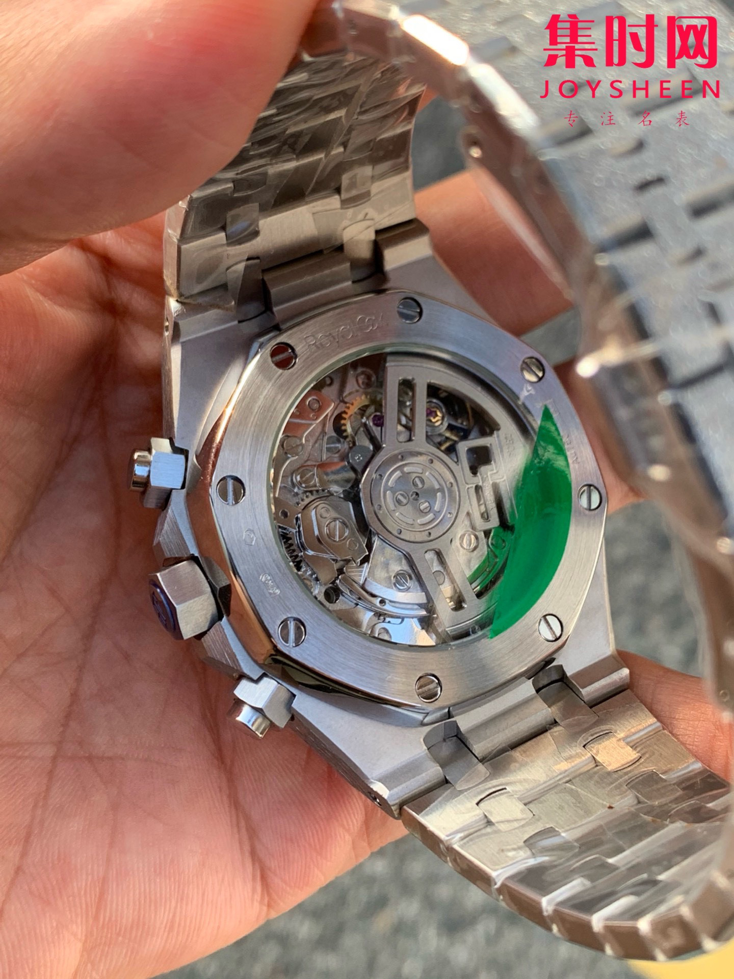 爱彼OMF新款皇家橡树26240系列“霜金”腕表 男士计时码表 采用同正品一致(6字位小秒 一体机芯通过后盖可以清晰观看齿轮的转动,搭载7750全自动机械计时机芯,搭配防眩目蓝宝石高透玻璃 指针打磨毫无毛刺,表壳精钢打造精细打磨,纹路质感都接近原装,表带采用原装表带开模表带细腻的拉丝纹不会锋利割手,表扣的开关设计和表扣的雕刻工艺均于正品一致,字面还原原装做工于颜色细节和正品放在一起无破绽,表径41mm 粗犷大气,劲道十足,超强夜光显示,可以在任何环境下读取时间!