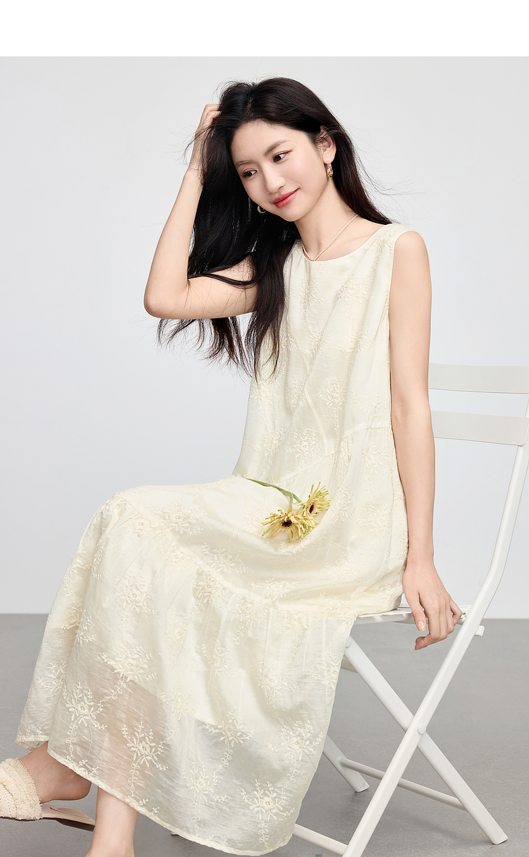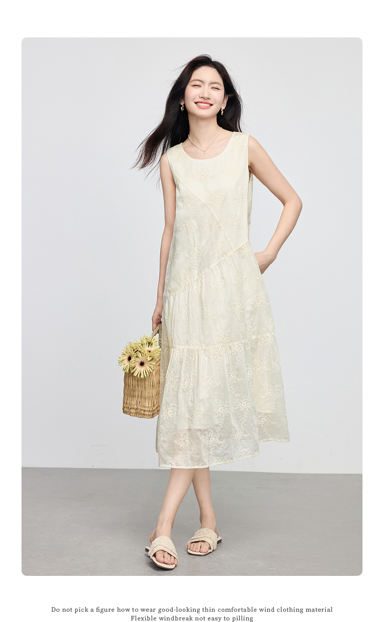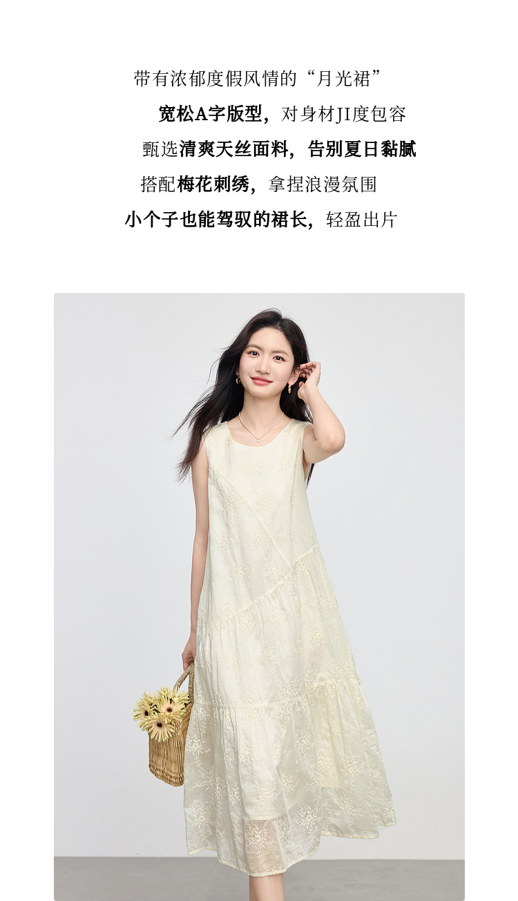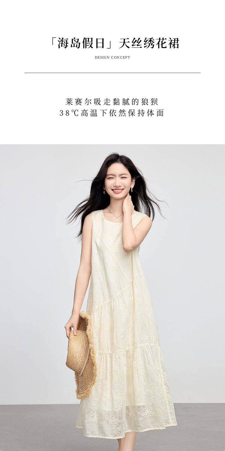 【专属特价】熙世界度假风天丝绣花连衣裙女2025夏新款莱赛尔圆领无袖背心裙子