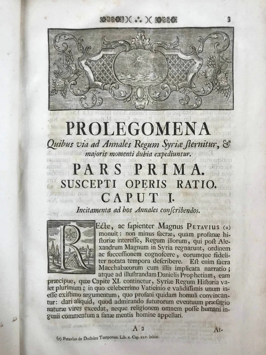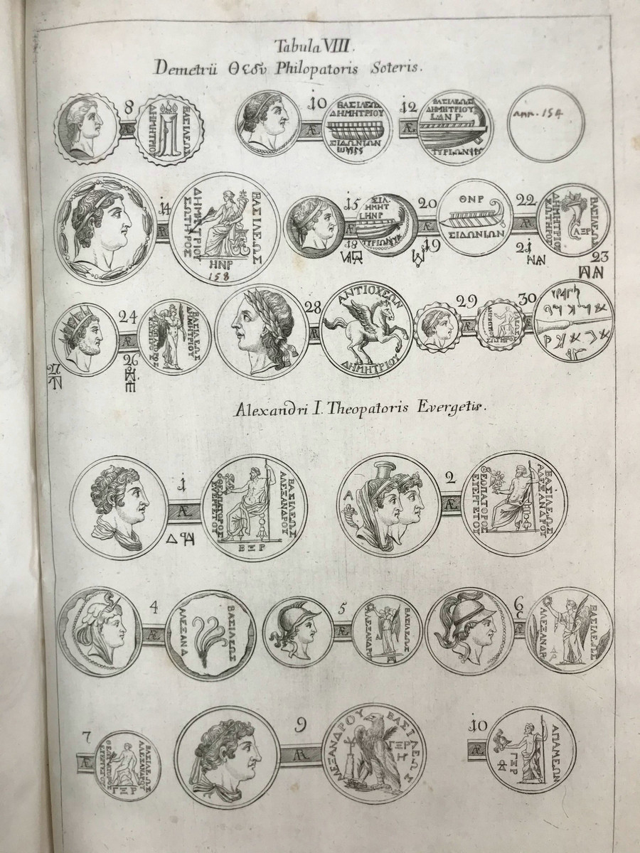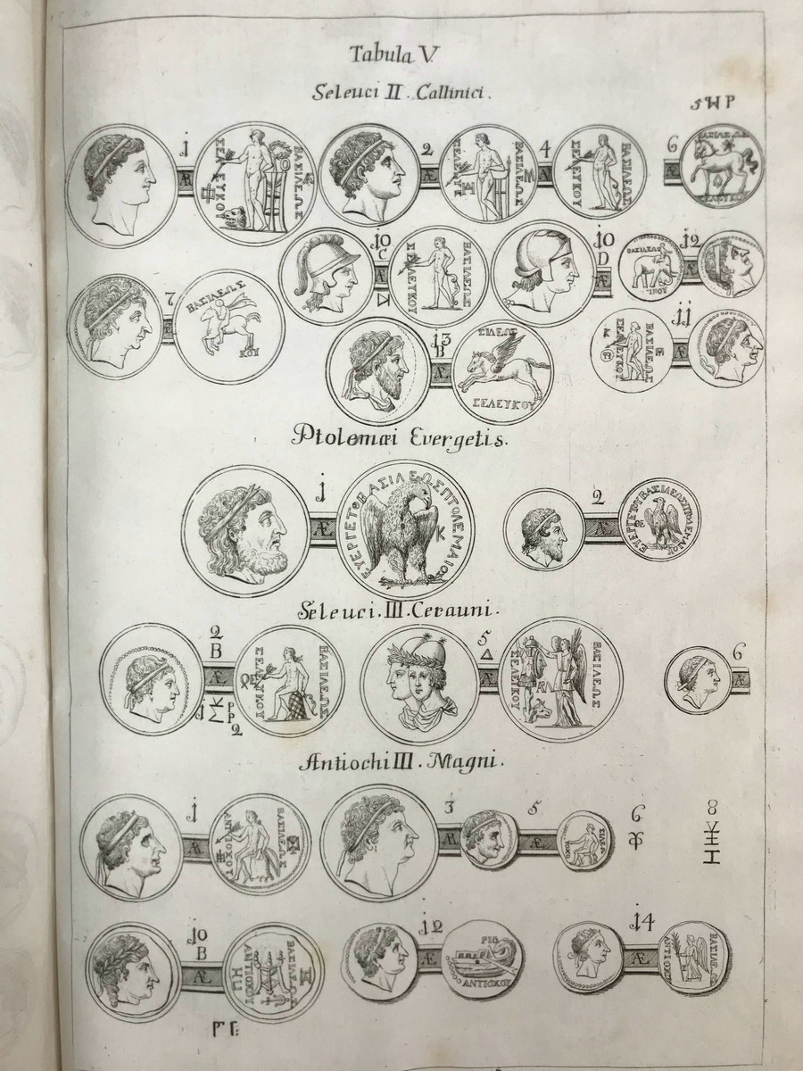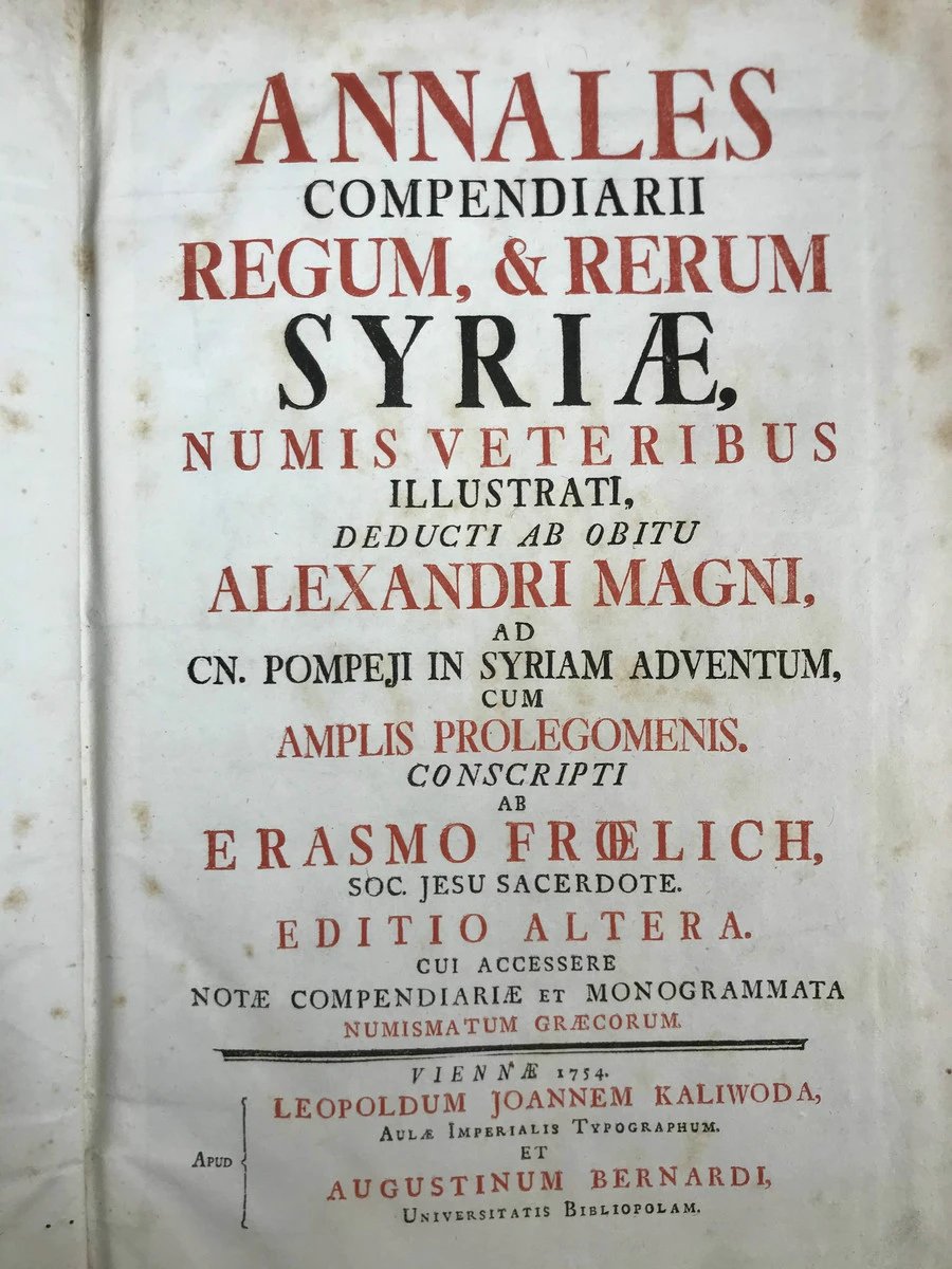 是书作者Erasmus Frohlich(1700-1758)为奥地利耶稣会士、历史学家、钱币学家、图书管理员,他最初学习的方向是数学、神学、希伯来语,之后转向了古钱币研究。奥地利皇帝弗兰茨一世委托Erasmus Frohlich与其他两位学者共同编纂皇家钱币收藏,后来成果集结为两卷作品进行了发表。现在我们看到的这部作品Annales Compendiarii Regum et rerumSyriae是他最重要的代表作,这部基于钱币学研究的塞琉古帝国调查报告最早发表于1744年,在发表受到同时代历史学家、古物学家的高度评价,还引发了与路德宗神学家Ernst Friedrich Wernsdorf关于《马卡比书》与旧约关系的论争。