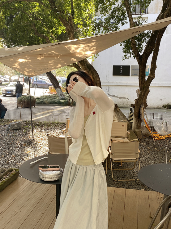 夏天防晒的同时也不会感到闷热 也可以在办公室当做空调衫 单排扣的设计方便穿脱 做了奶白色的纽扣增加了整件衣服的完整度