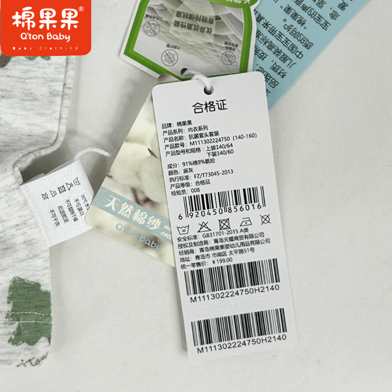 棉果果专柜同款春季新品内衣家居男宝5A抗菌抗菌套头套装M111302224750
