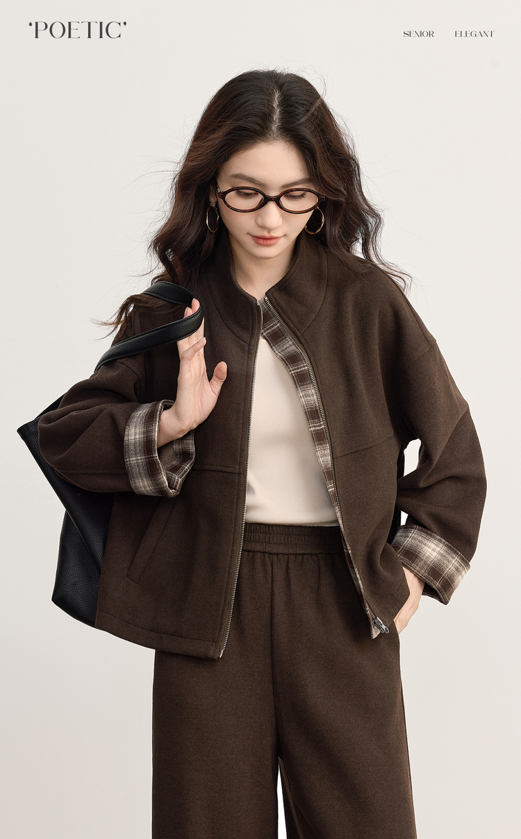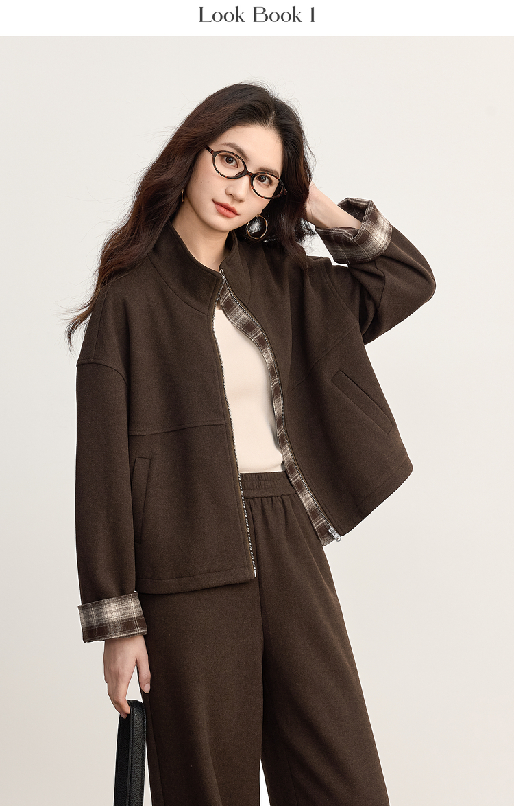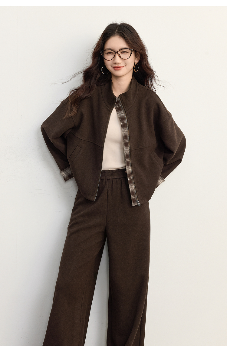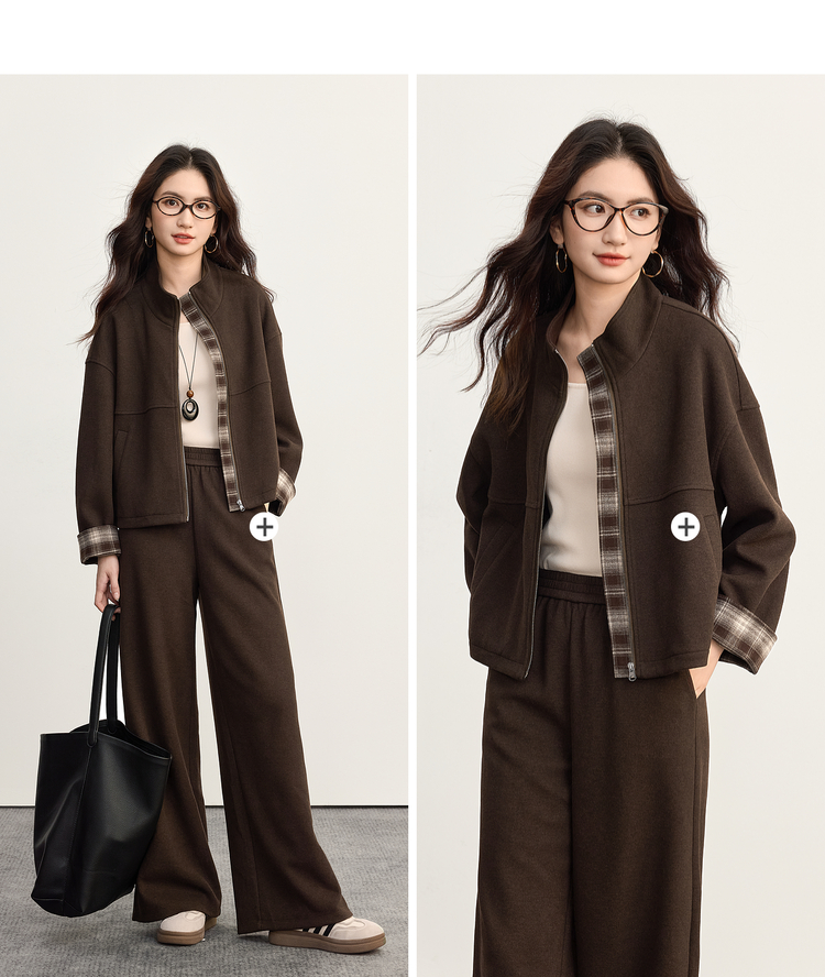 【09/26新品】熙世界巴恩风格纹拼接毛呢外套阔腿裤两件套女秋冬松弛感穿搭套装