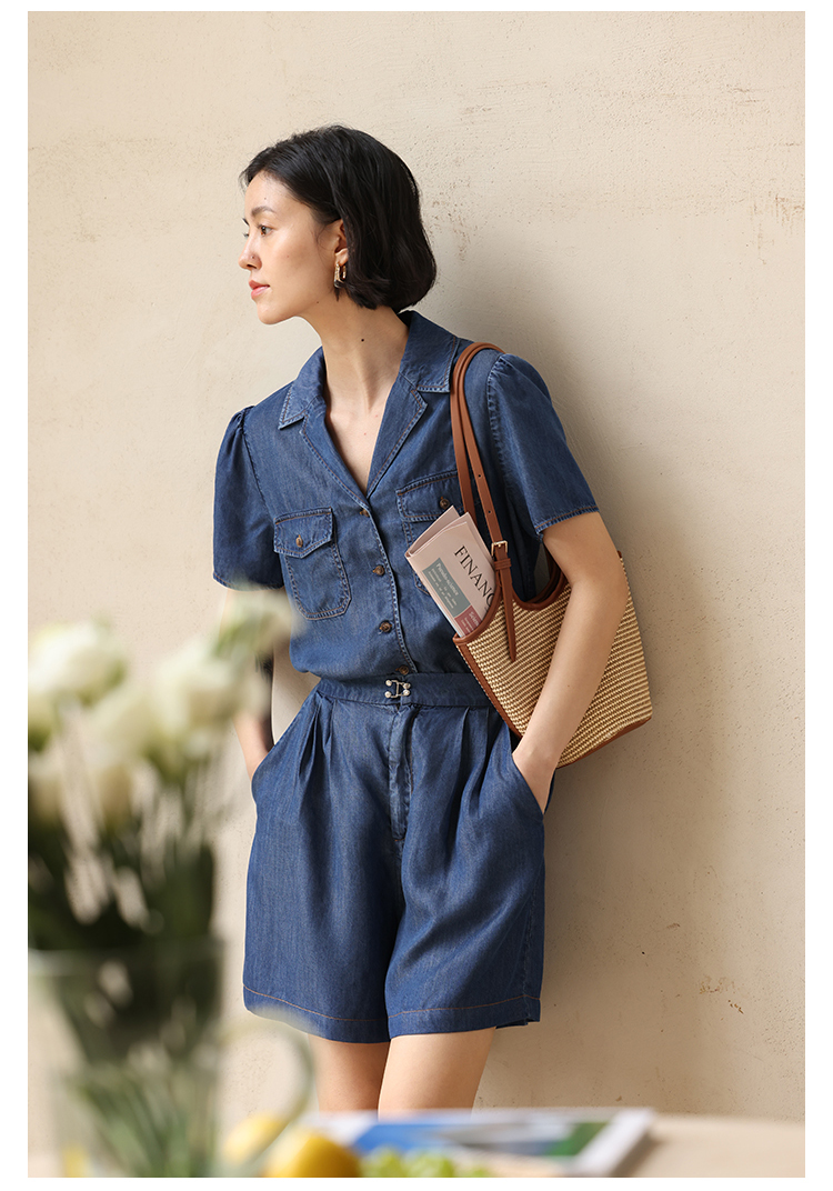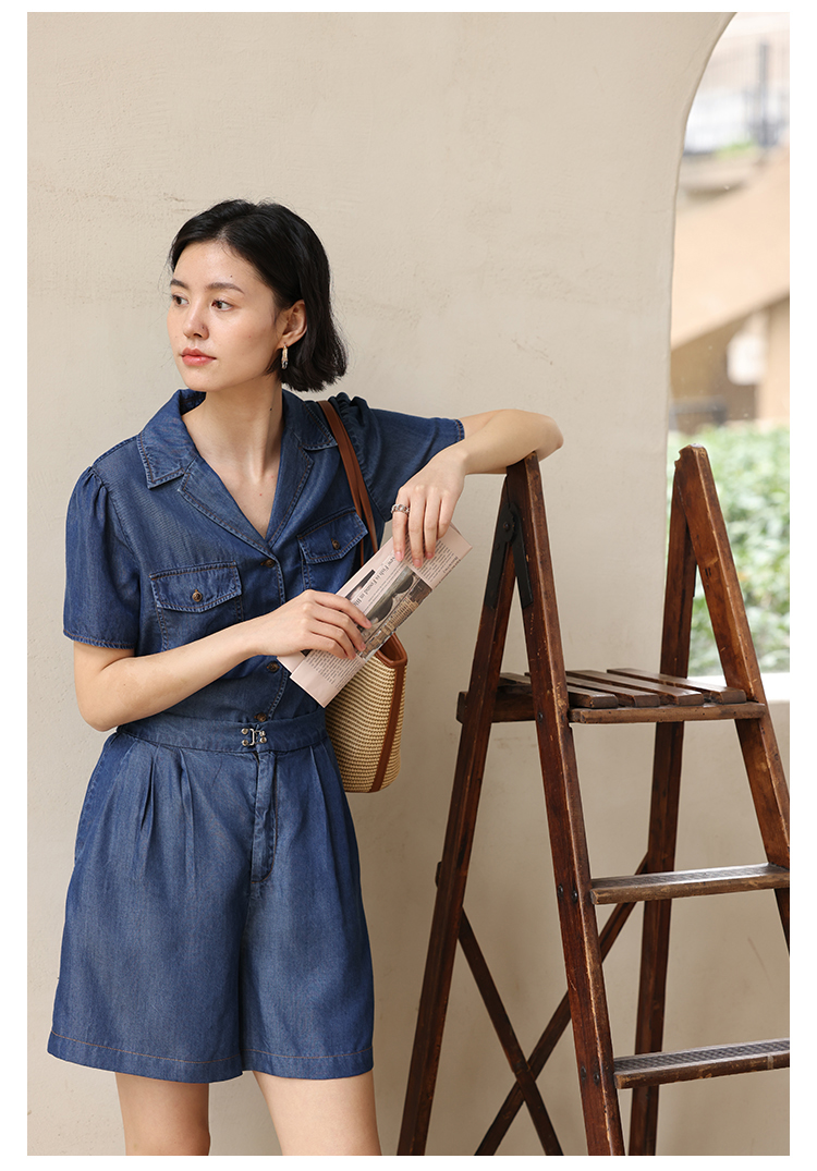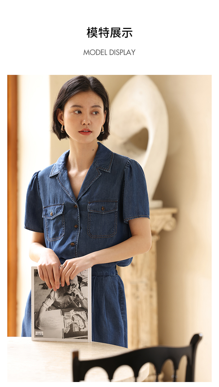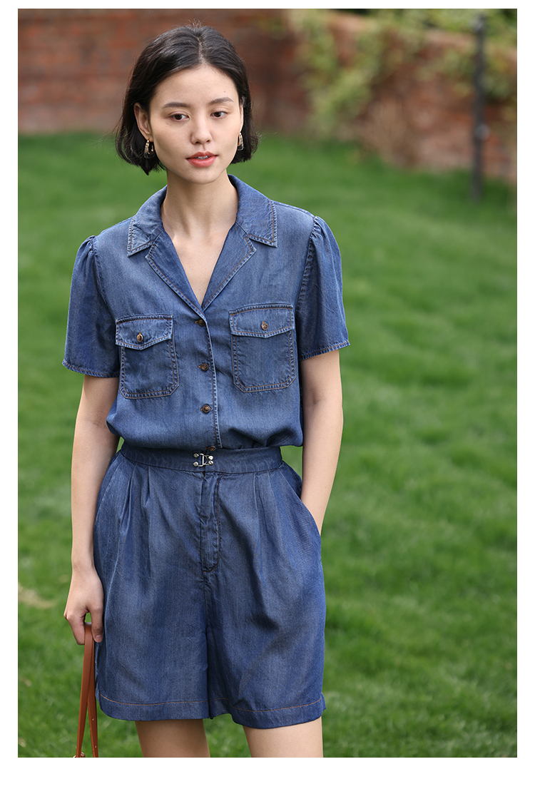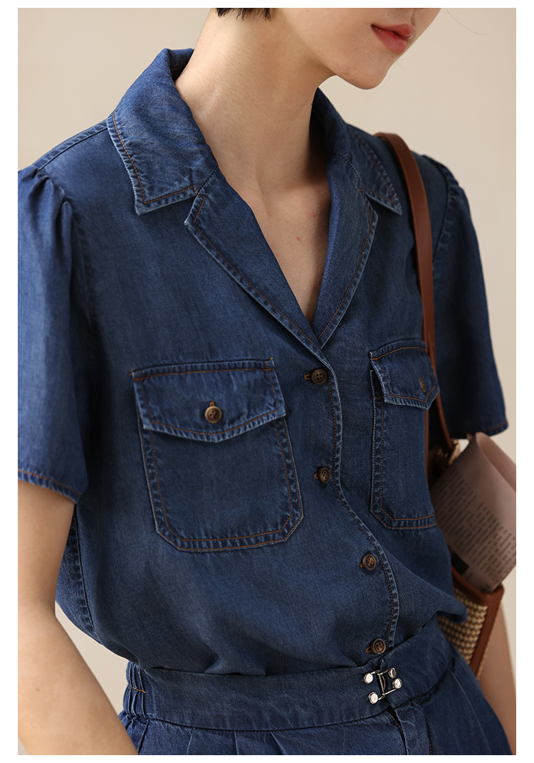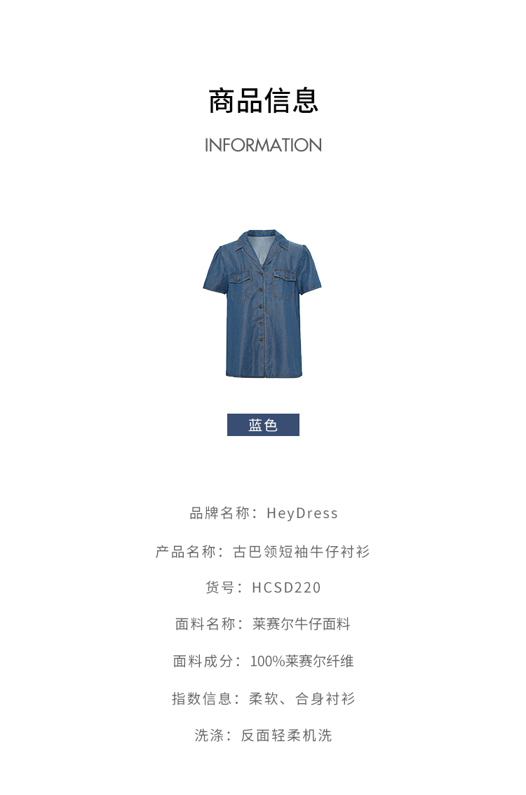 HeyDress天丝复古牛仔短袖衬衫女夏季法式古巴领衬衣休闲薄款上衣