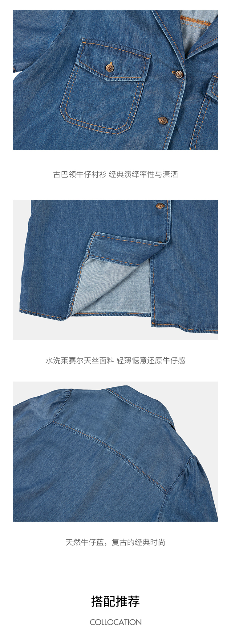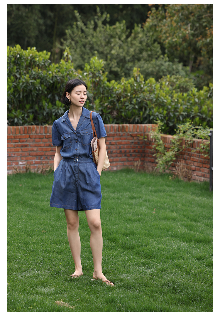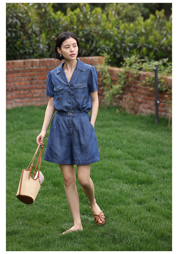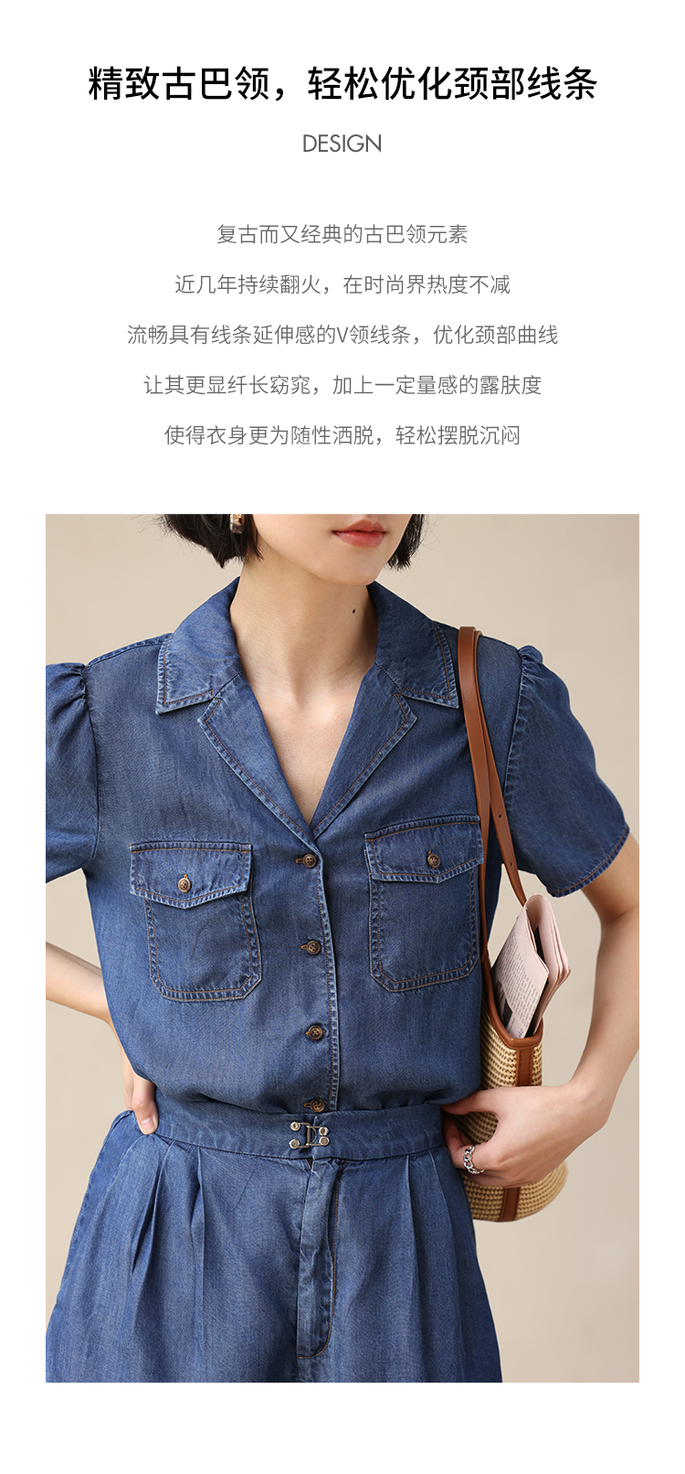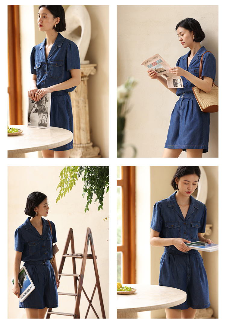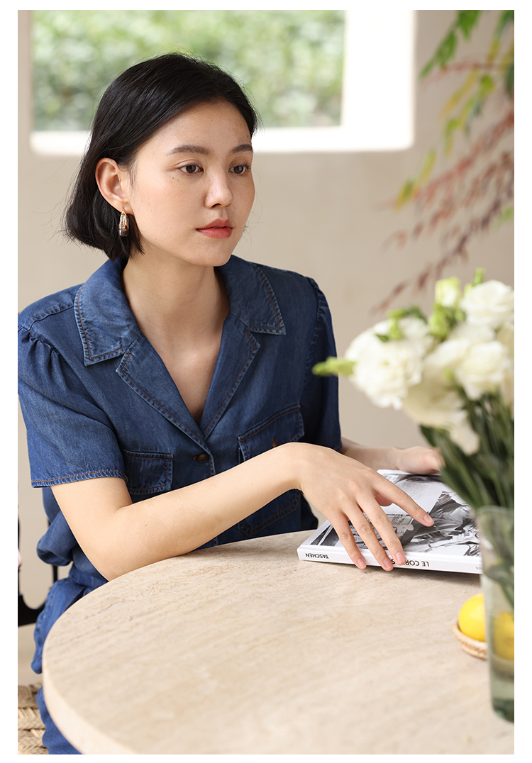 HeyDress天丝复古牛仔短袖衬衫女夏季法式古巴领衬衣休闲薄款上衣