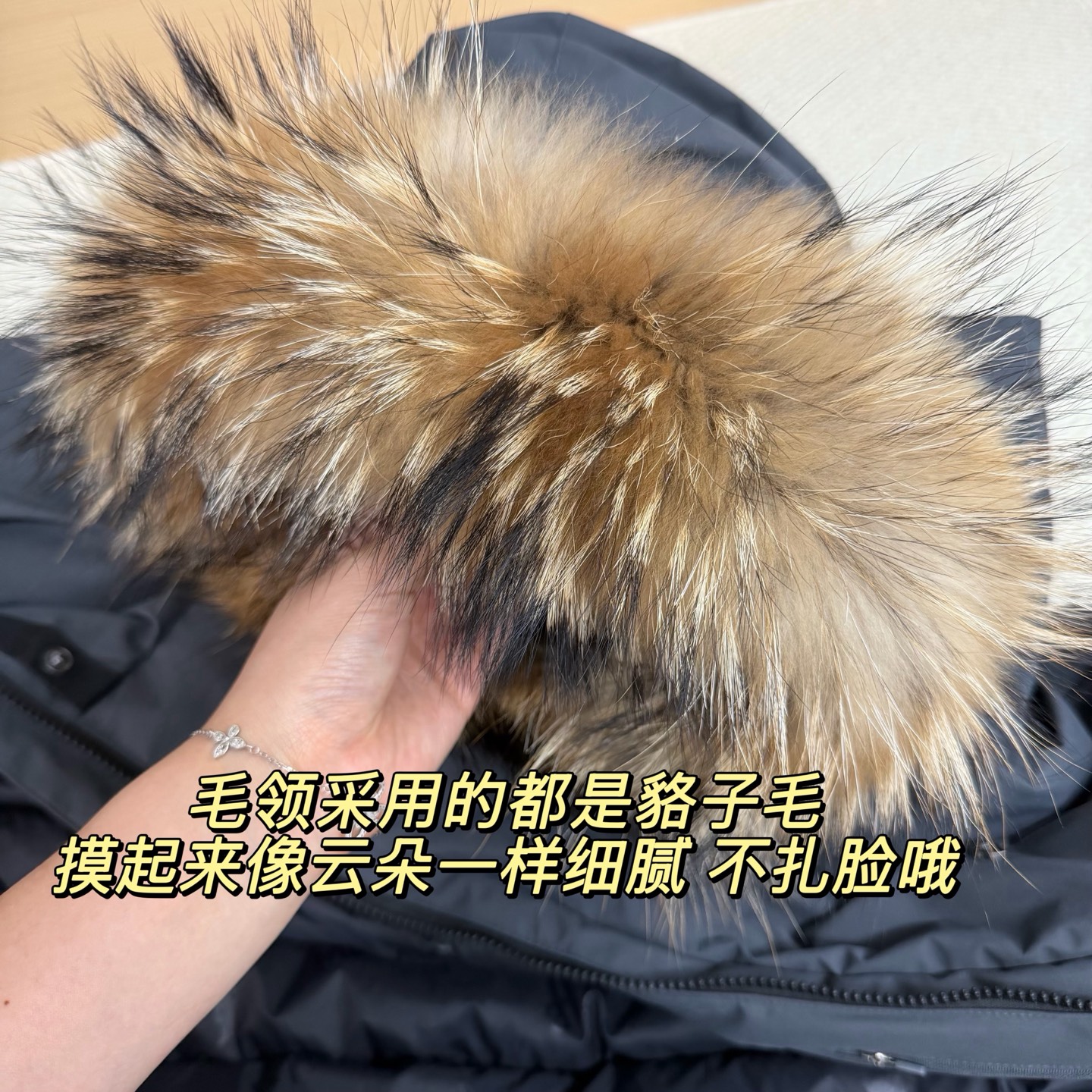 柔软真皮草毛领,大大的一整根貉子毛领,不仅挡风保暖,更加的显奢华质感,一眼贵价羽绒服!