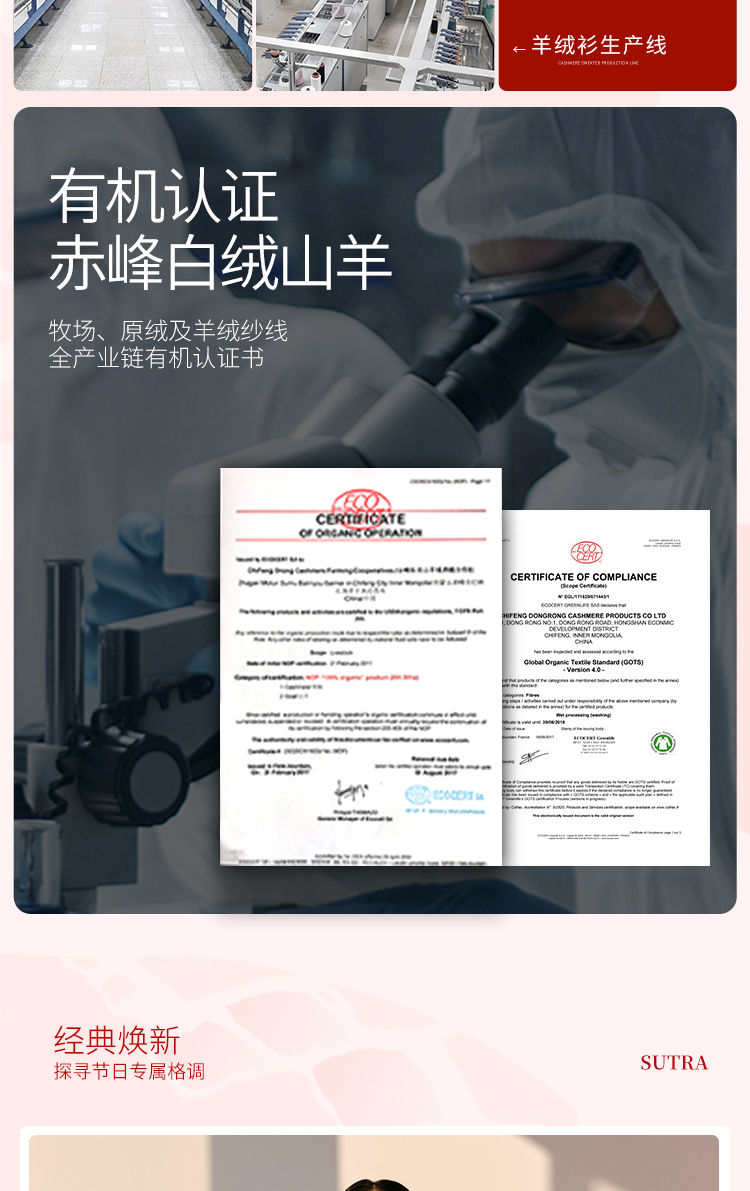 东黎羊绒是赤峰东荣集团自主品牌,自有牧场/羊绒制品全产业链优势,实现了羊绒从“牧场”到“商场”的华丽转变。