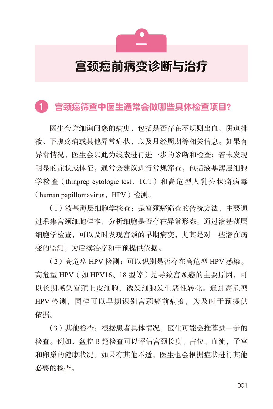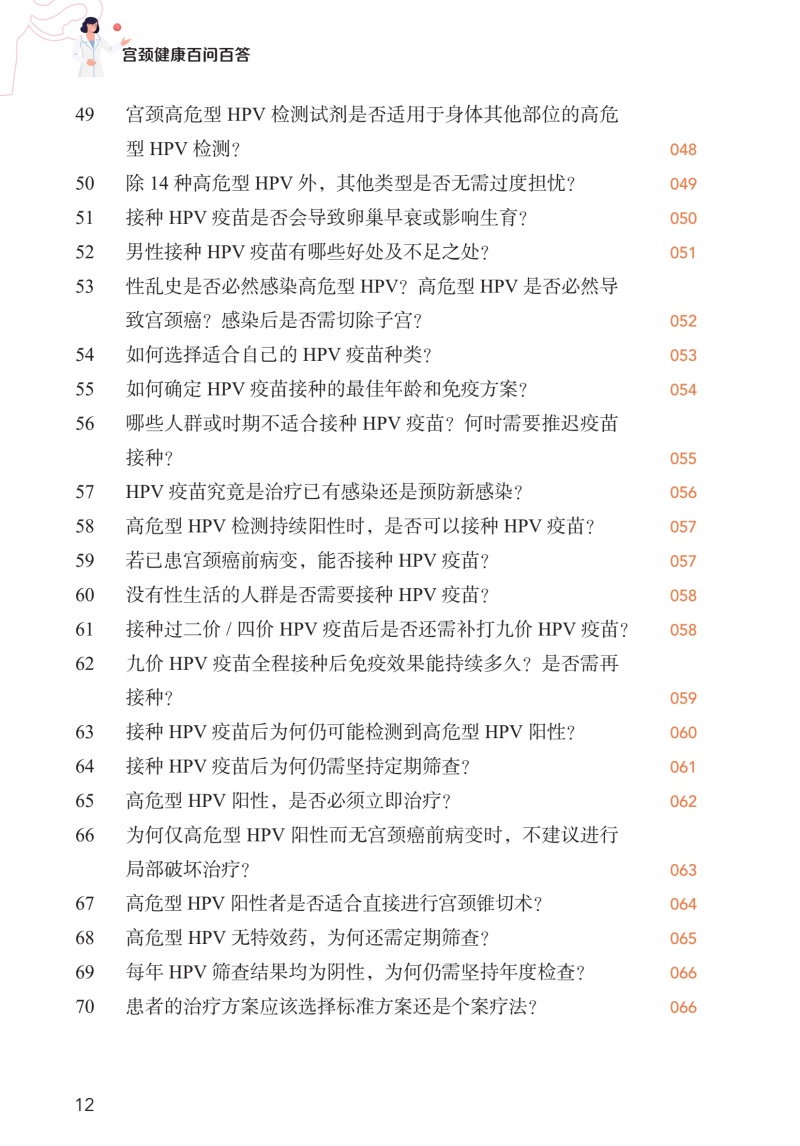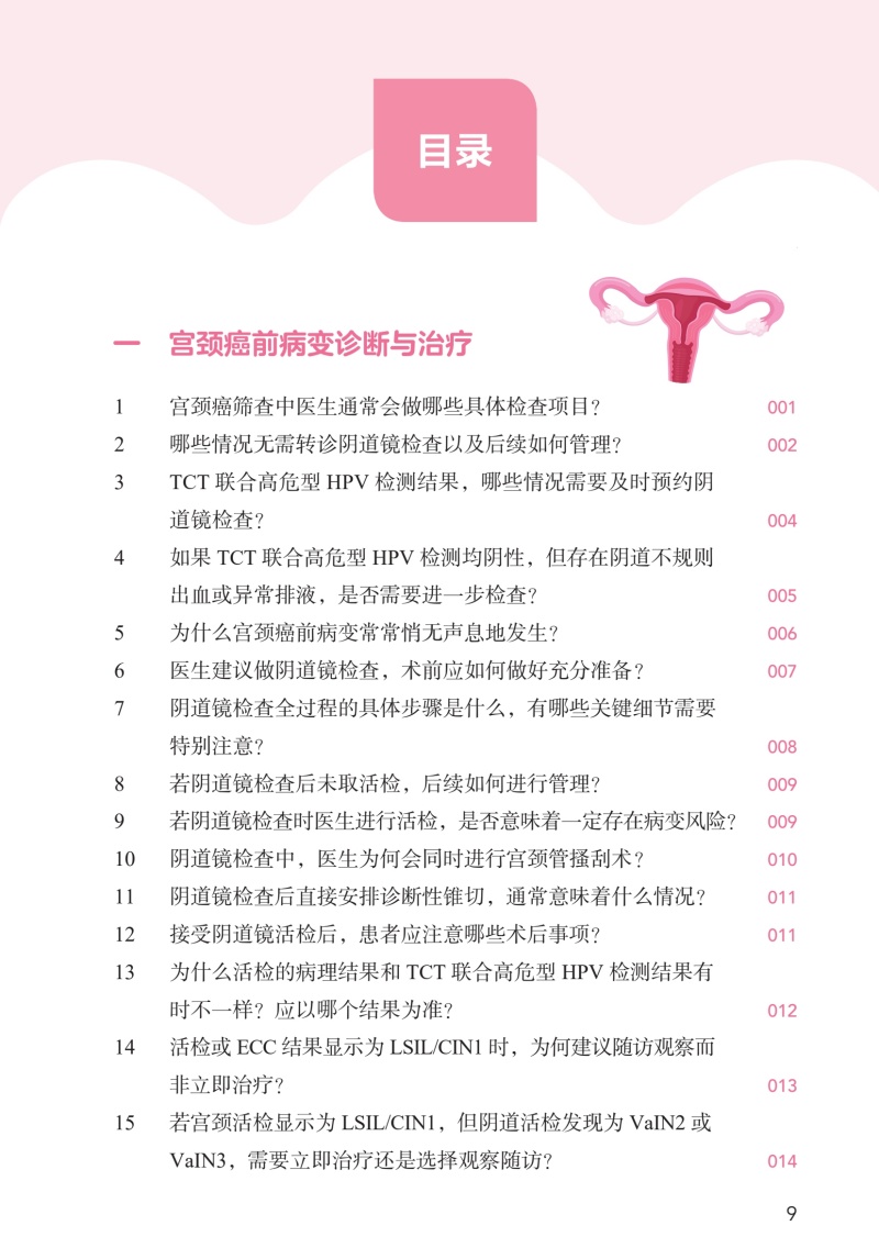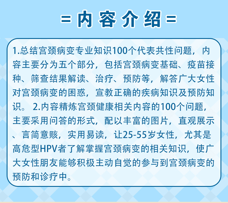 1.总结宫颈病变专业知识100个代表共性问题,内容主要分为五个部分,包括宫颈病变基础、疫苗接种、筛查结果解读、治疗、预防等,解答广大女性对宫颈病变的困惑,宣教正确的疾病知识及预防知识。 2.内容精炼宫颈健康相关内容的100个问题,主要采用问答的形式,配以丰富的图片,直观展示、言简意赅,实用易读,让25-55岁女性,尤其是高危型HPV者了解掌握宫颈病变的相关知识,使广大女性朋友能够积极主动自觉的参与到宫颈病变的预防和诊疗中。