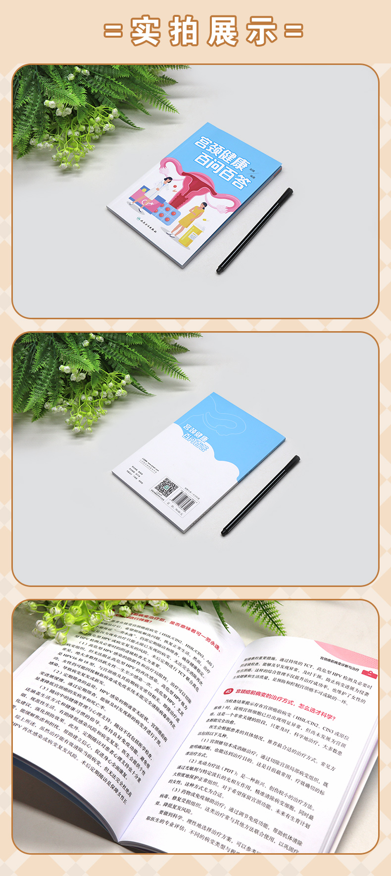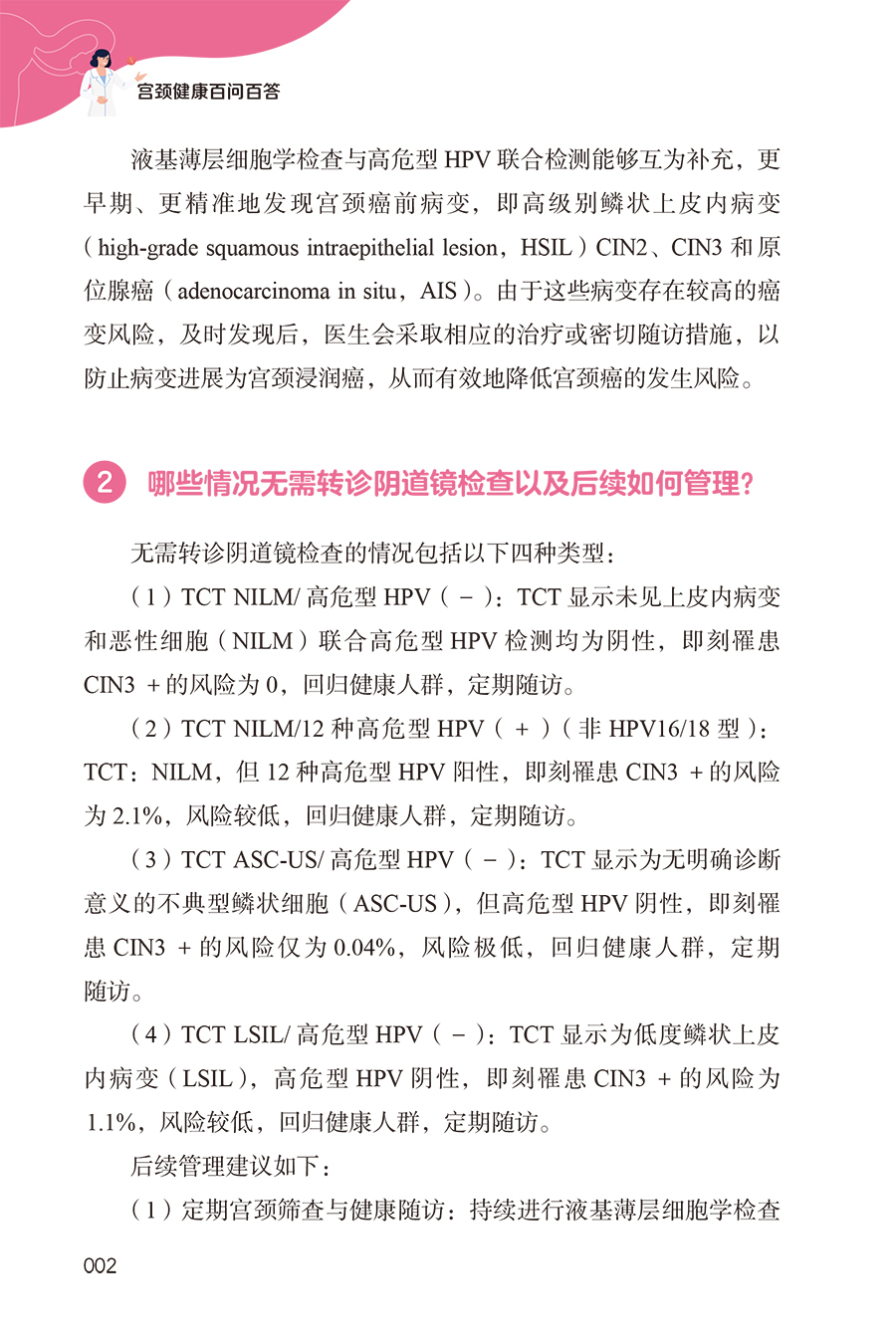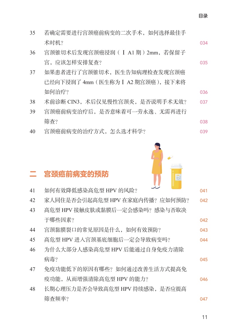 1.总结宫颈病变专业知识100个代表共性问题,内容主要分为五个部分,包括宫颈病变基础、疫苗接种、筛查结果解读、治疗、预防等,解答广大女性对宫颈病变的困惑,宣教正确的疾病知识及预防知识。 2.内容精炼宫颈健康相关内容的100个问题,主要采用问答的形式,配以丰富的图片,直观展示、言简意赅,实用易读,让25-55岁女性,尤其是高危型HPV者了解掌握宫颈病变的相关知识,使广大女性朋友能够积极主动自觉的参与到宫颈病变的预防和诊疗中。