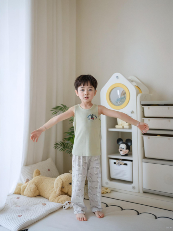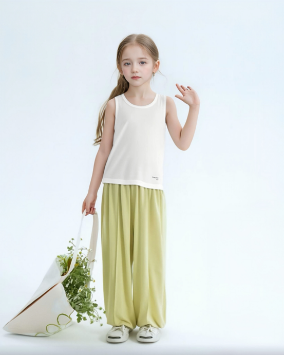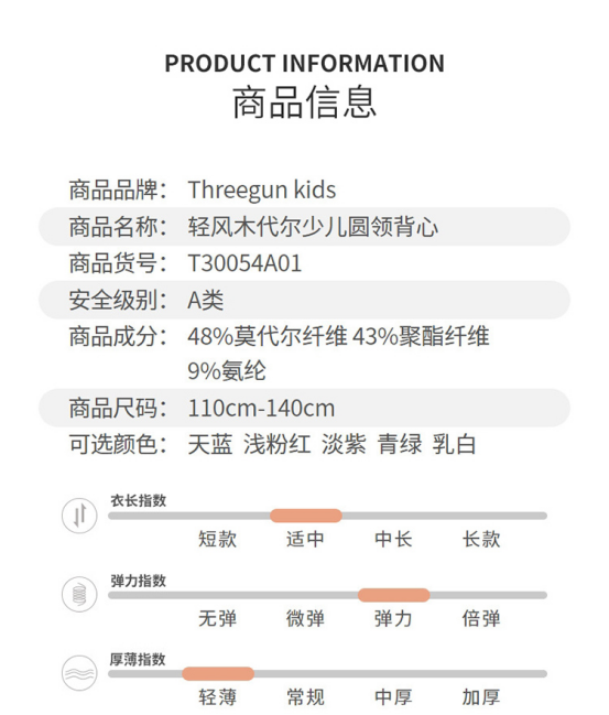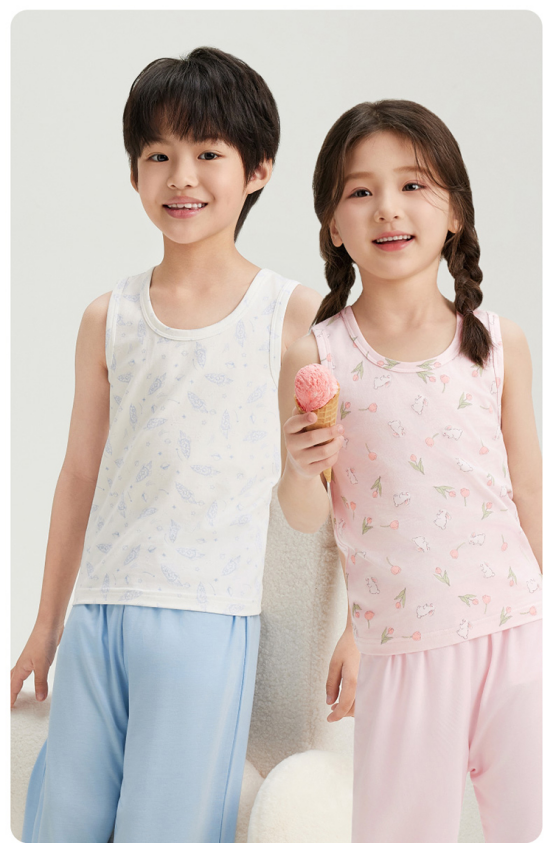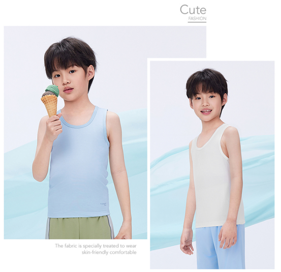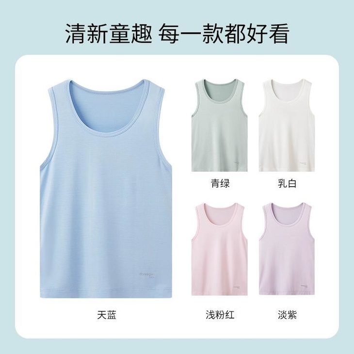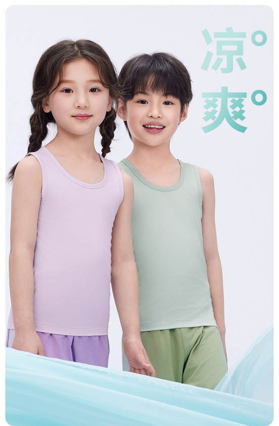 5️⃣【轻风木代尔少儿圆领背心- 凉感小童款】 ✅48%奥地利兰精莫代尔 是全球顶级木源纤维 ❄️超凉感!怕热娃本命背心 堪称降温“黑科技”!接触皮肤瞬降3℃ ✅Q-MAX值0.28(国标凉感门槛仅0.15) 40℃户外体感如25℃空调房! 爱出汗的娃们一穿就爱上! 垂坠丝光感配短裤,韩系穿搭博主既视感! 防污涂层抗果渍,泥坑打滚清水一冲鲜亮如新