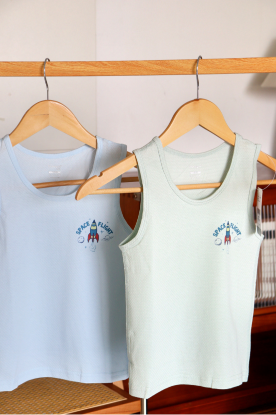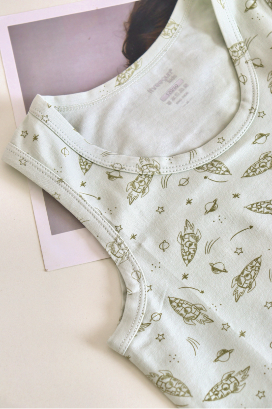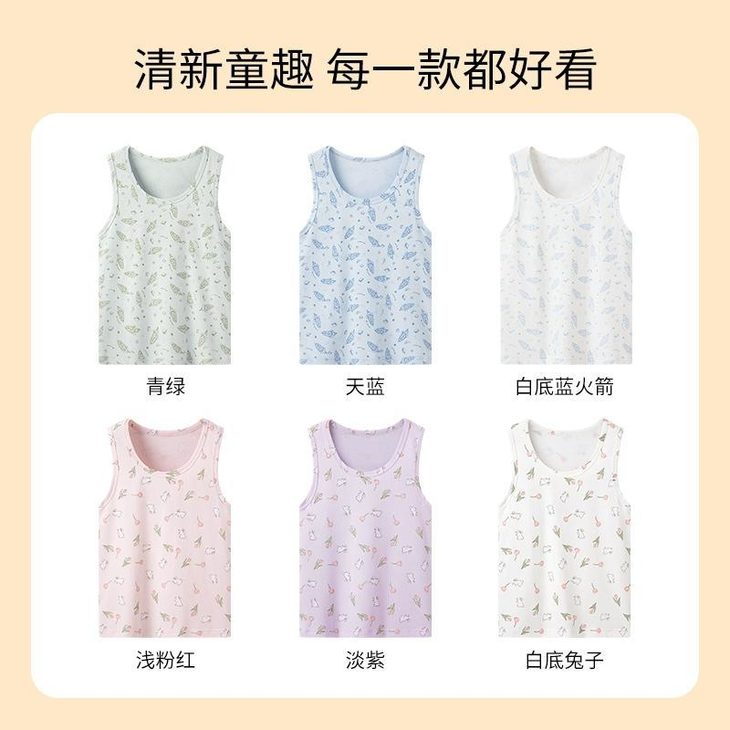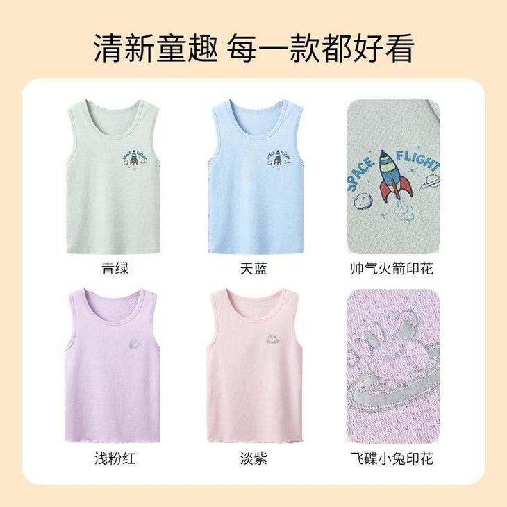 4️⃣【舒服弹力棉少儿圆领背心-萌趣弹力棉爆款】 ✅3A抗菌 防螨,双重防护 ✅95%棉的弹力萌趣款~ ✅白底兔子/火箭印花用食品级水性浆 ✅检测报告重金属0检出,放心接触皮肤! ✅5%的氨纶添加,让背心拥有航天级回弹 ✅3秒穿脱不卡头,幼儿园自理小能手认证 娃蹲地玩玩具,后背不留褶皱印~