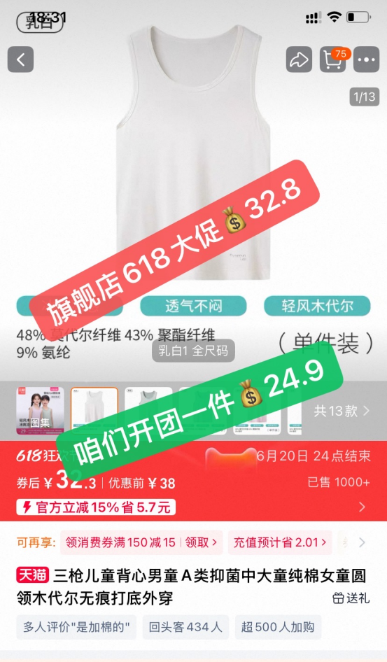 入夏即爆卖万件的三枪kids儿童背心来了! 618全网都在优惠打折立减 咋们开团怎么能不跟上 必须给妈妈们争取到更大的力度 ✅团长拍胸脯保证 价格给大家打到全网、全平台最低! 比价618!正品保障!三枪品牌直发!